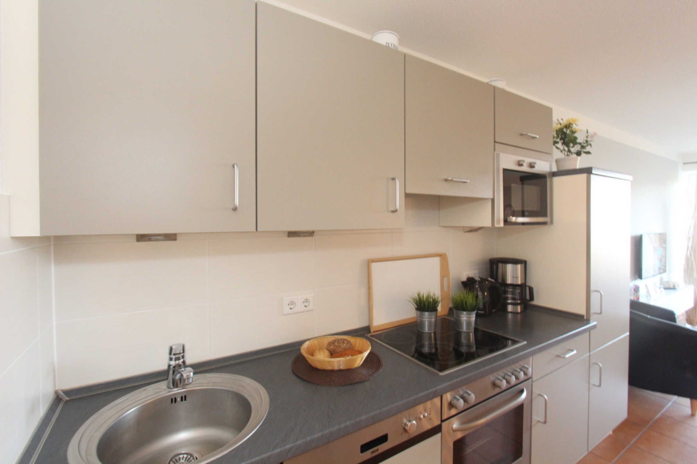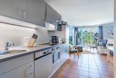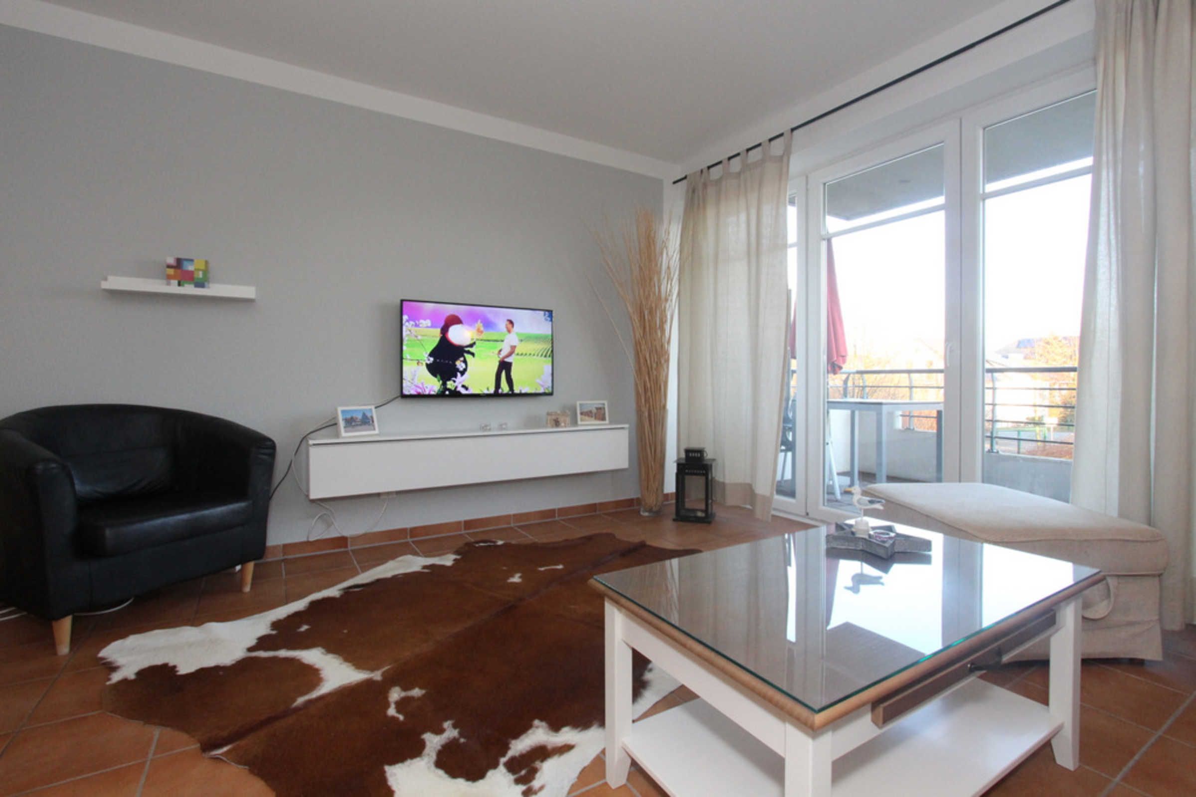 Im großzügigen, kombinierten Wohn- und Essbereich finden Sie eine voll ausgestattete Küchenzeile und eine Essecke. Vom Wohnbereich mit SMART-TV und Internet/WLAN gelangen Sie auf den nach Osten ausgerichteten Balkon, auf dem Sie Ihren Ostseeurlaub perfekt genießen können.