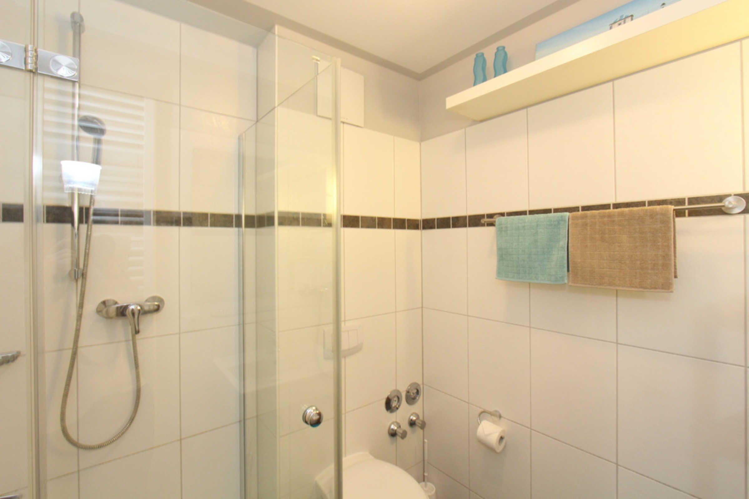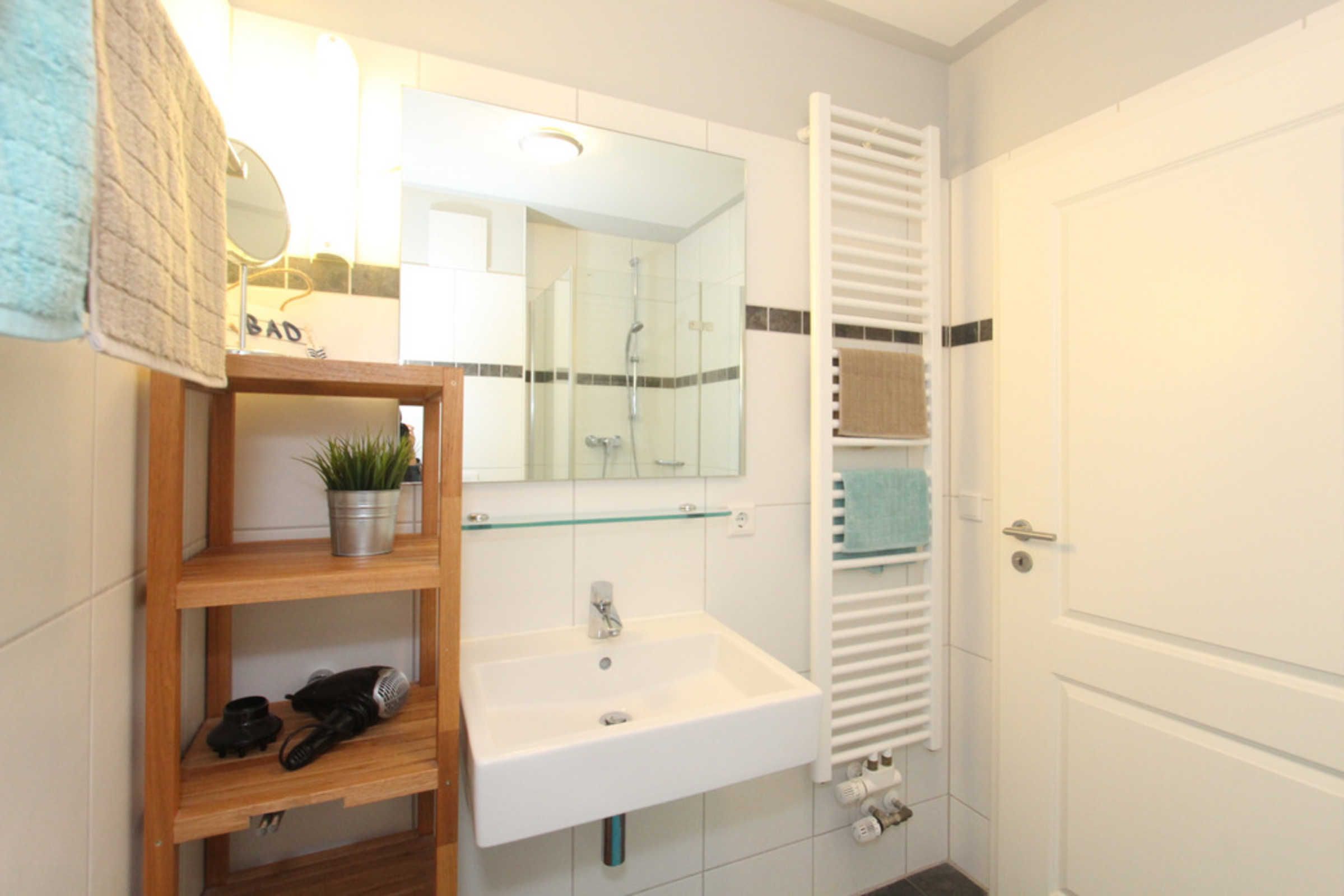 Das Badezimmer ist mit Dusche und WC ausgestattet, eine große Handtuchheizung sorgt für wohlige Wärme.