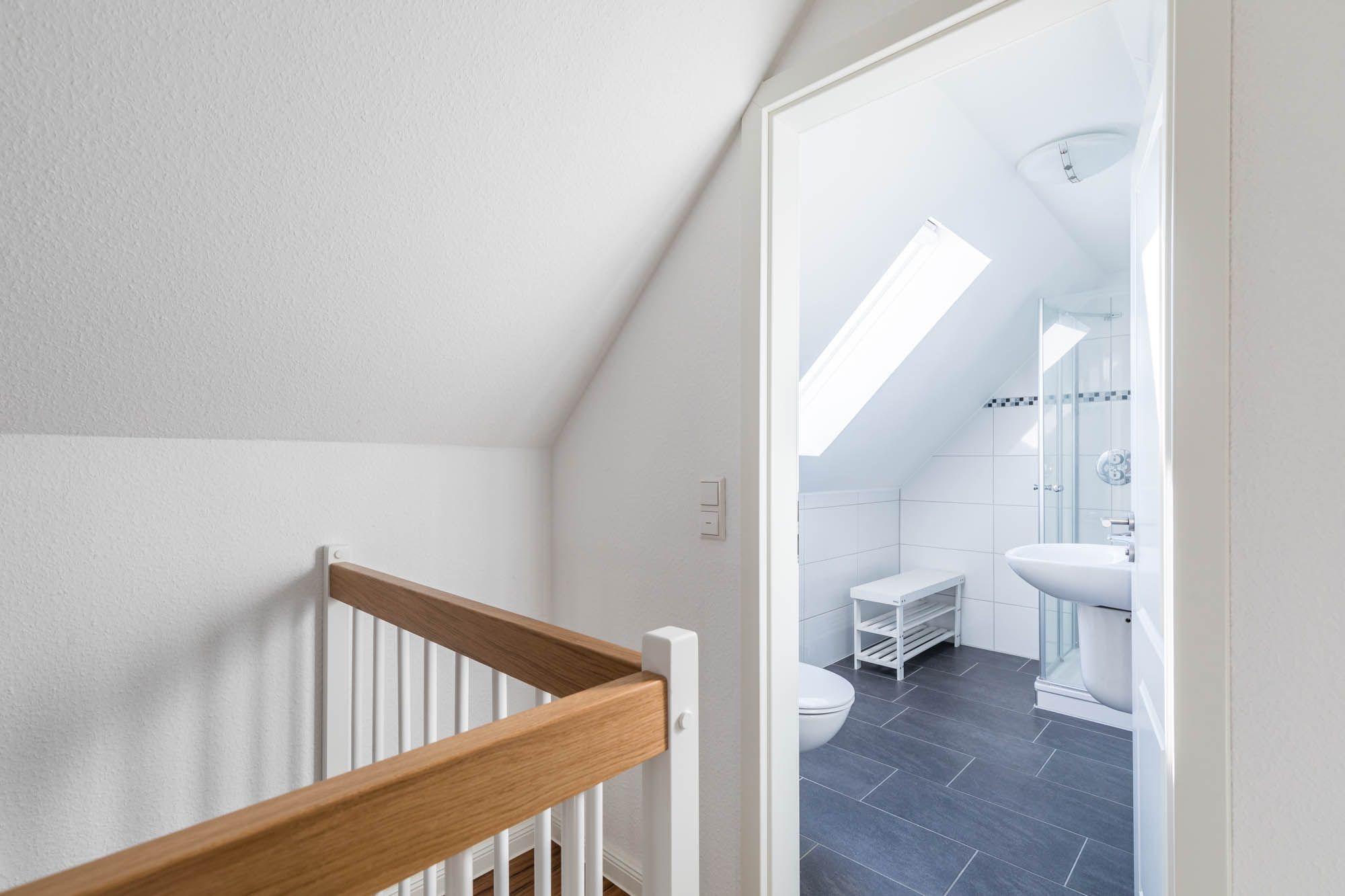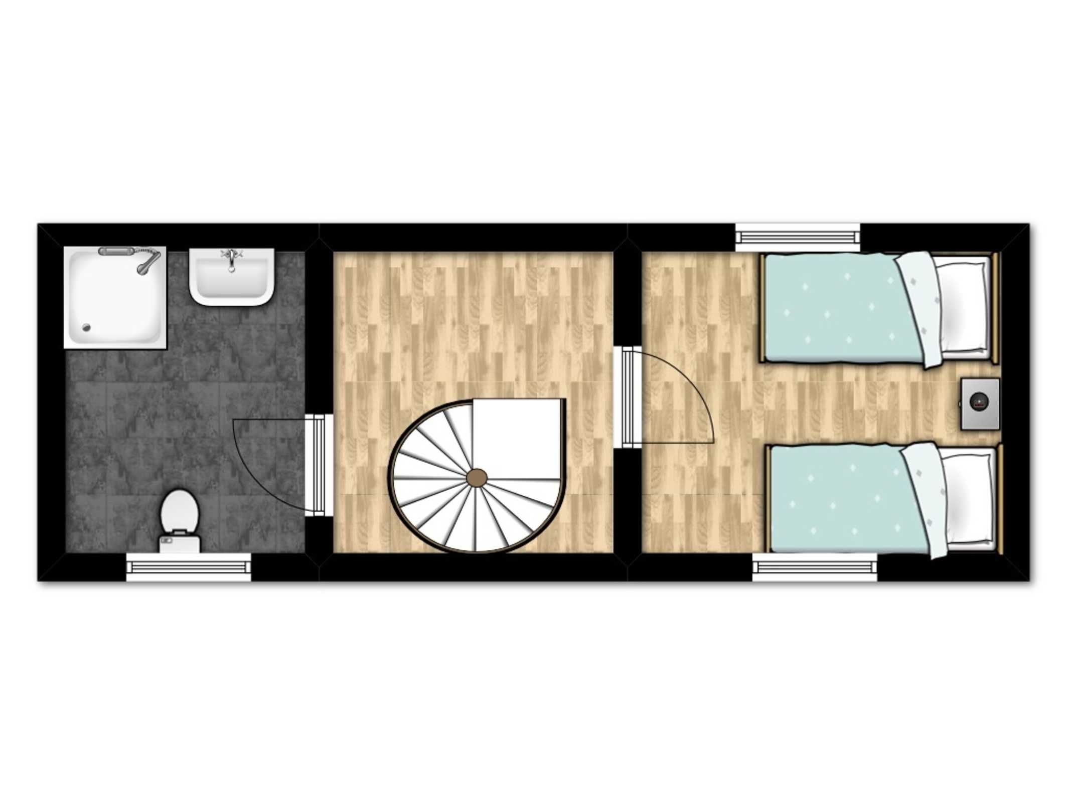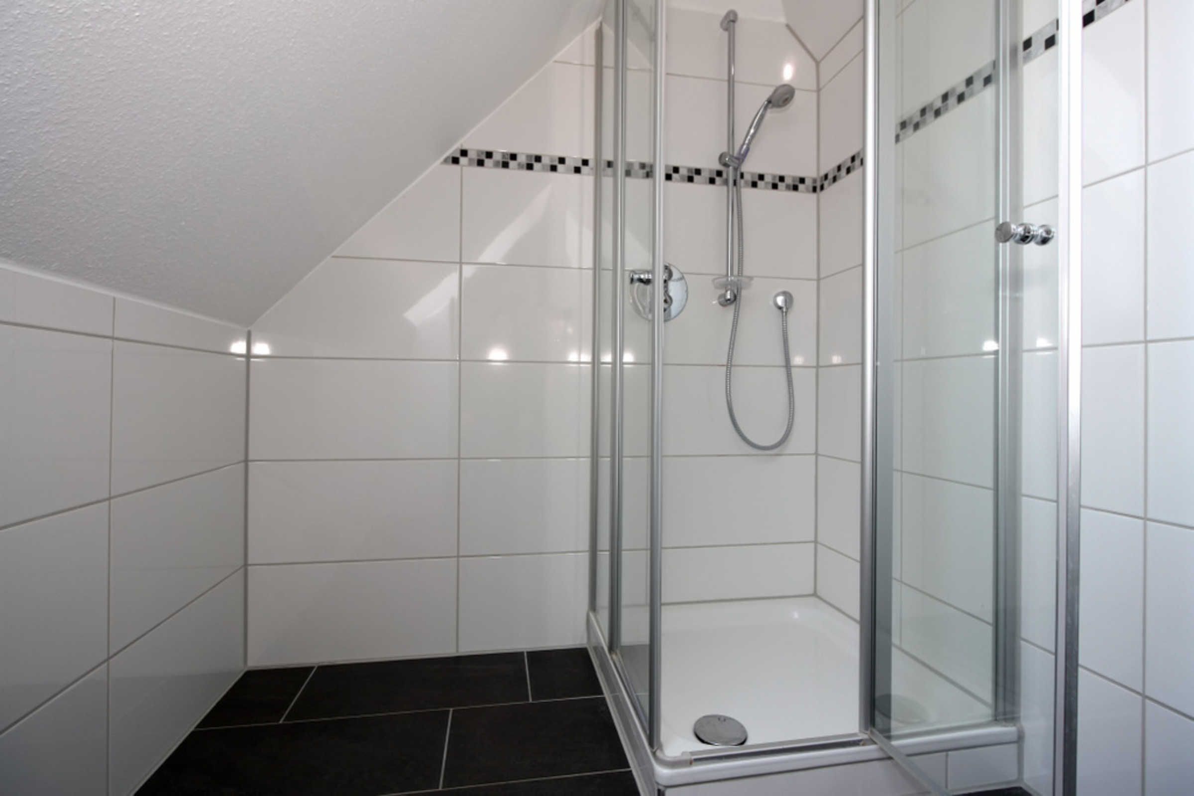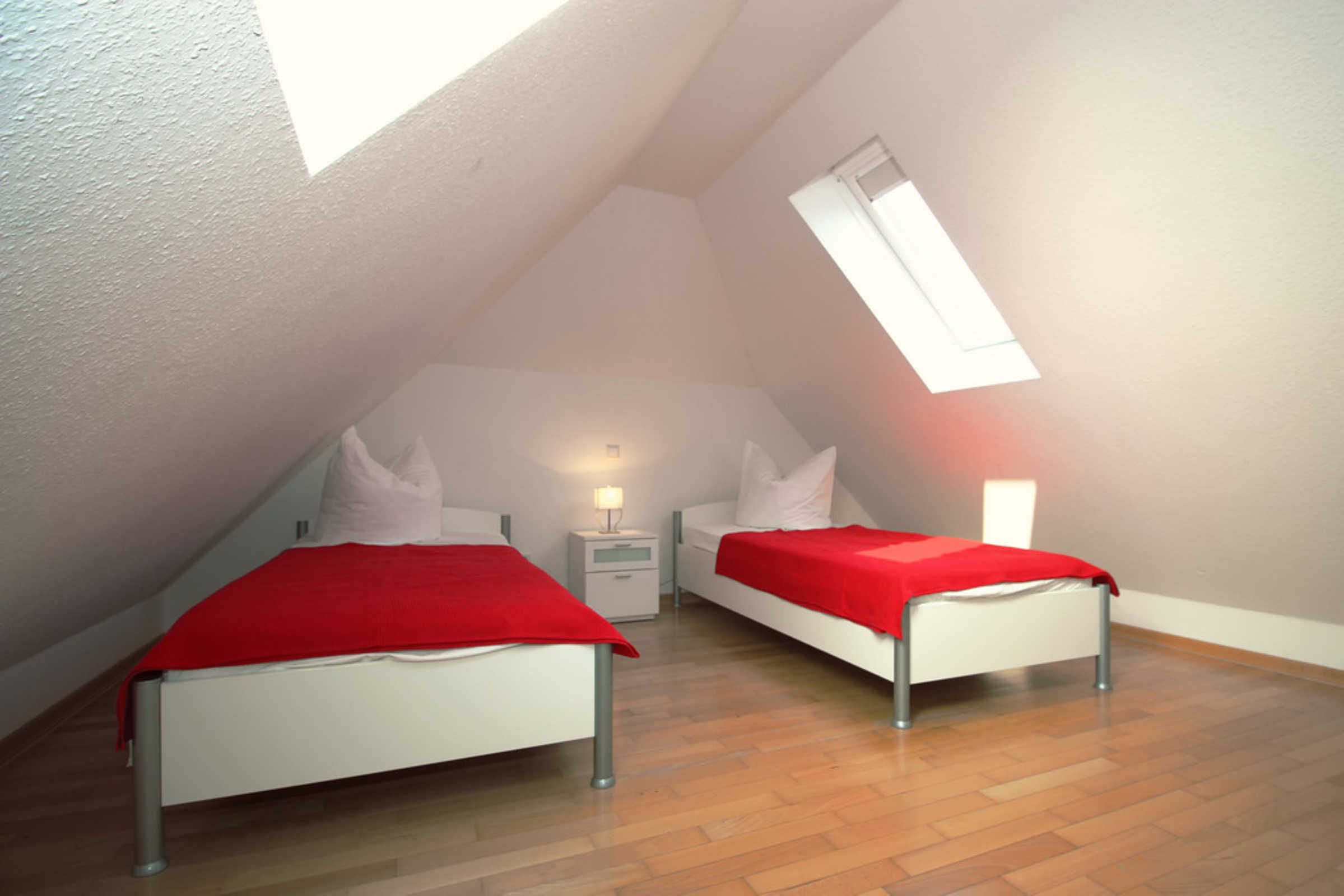 In der oberen Wohnebene, im DG befinden sich ein Gäste-/ Kinderzimmer mit zwei Einzelbetten und ein weiteres Duschbad.
