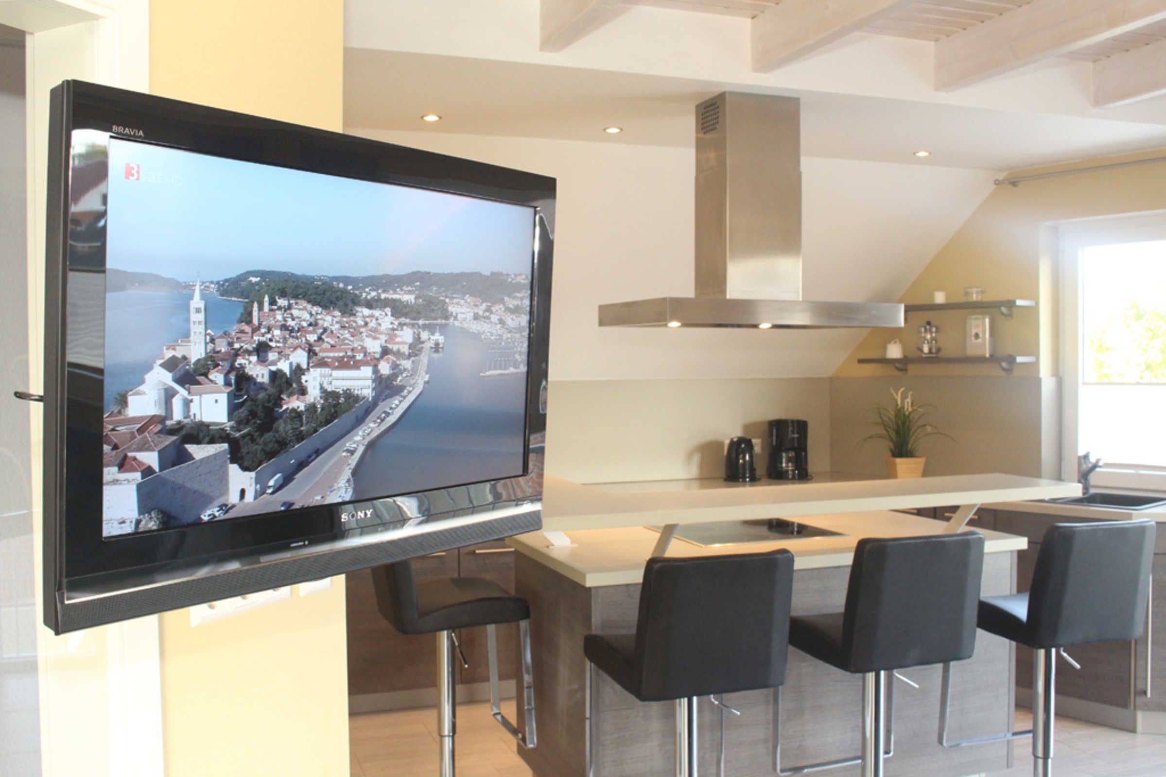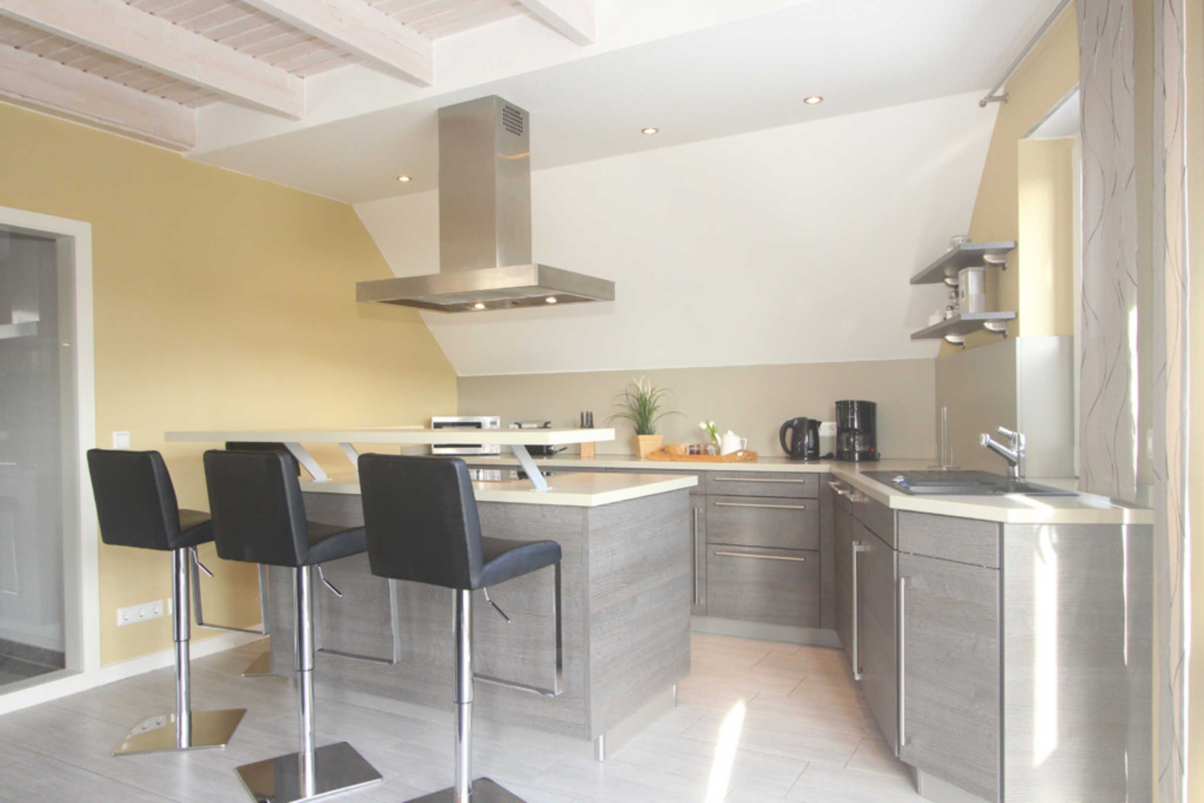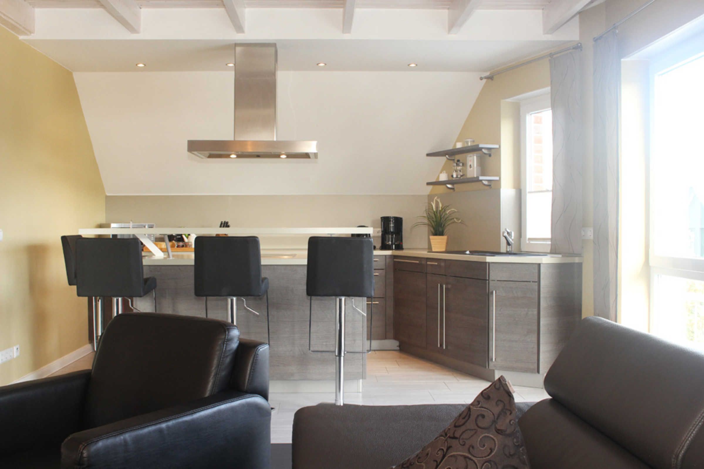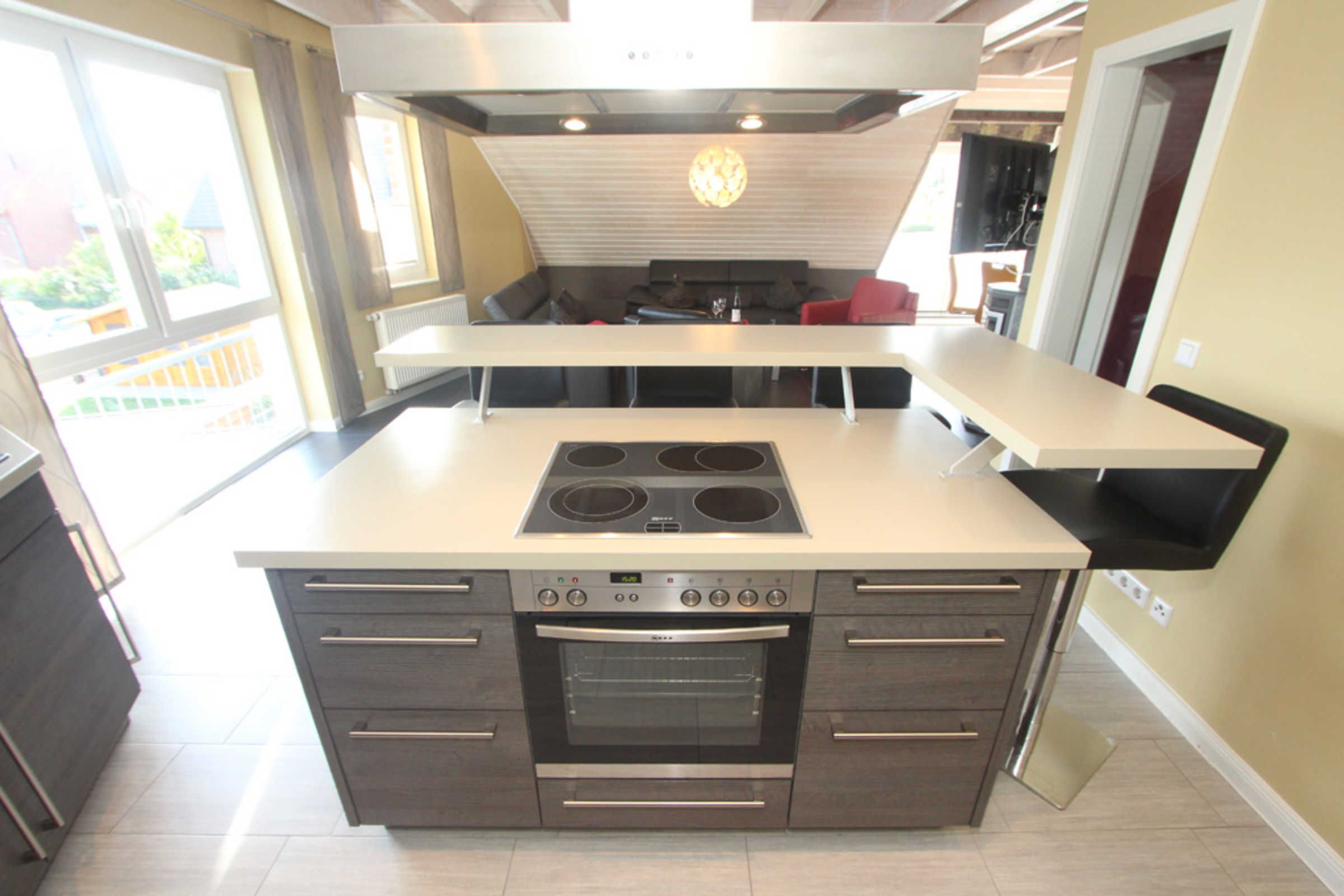 Ein absolutes Highlight ist die offene, exklusiv eingerichtete Küche, in der Sie unter anderem ein Cerankochfeld, einen Geschirrspüler, eine Mikrowelle vorfinden. Toben Sie sich an der großen Kochinsel gern kreativ aus. Zuschauer können derweil an der Bar Platz nehmen. Ob Sie dann anschließend direkt an der Bar oder doch lieber an der Essecke Ihre Mahlzeiten einnehmen, entscheiden Sie selbst.