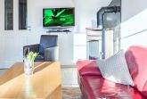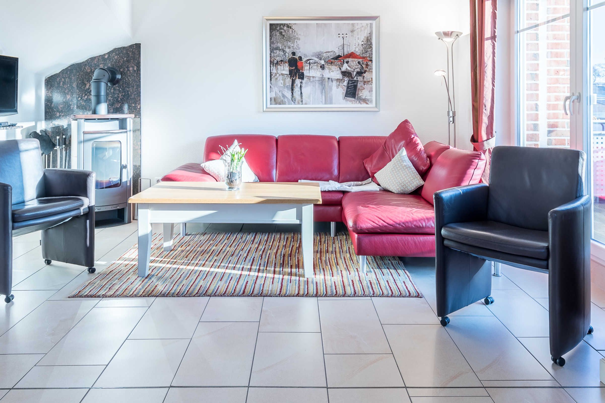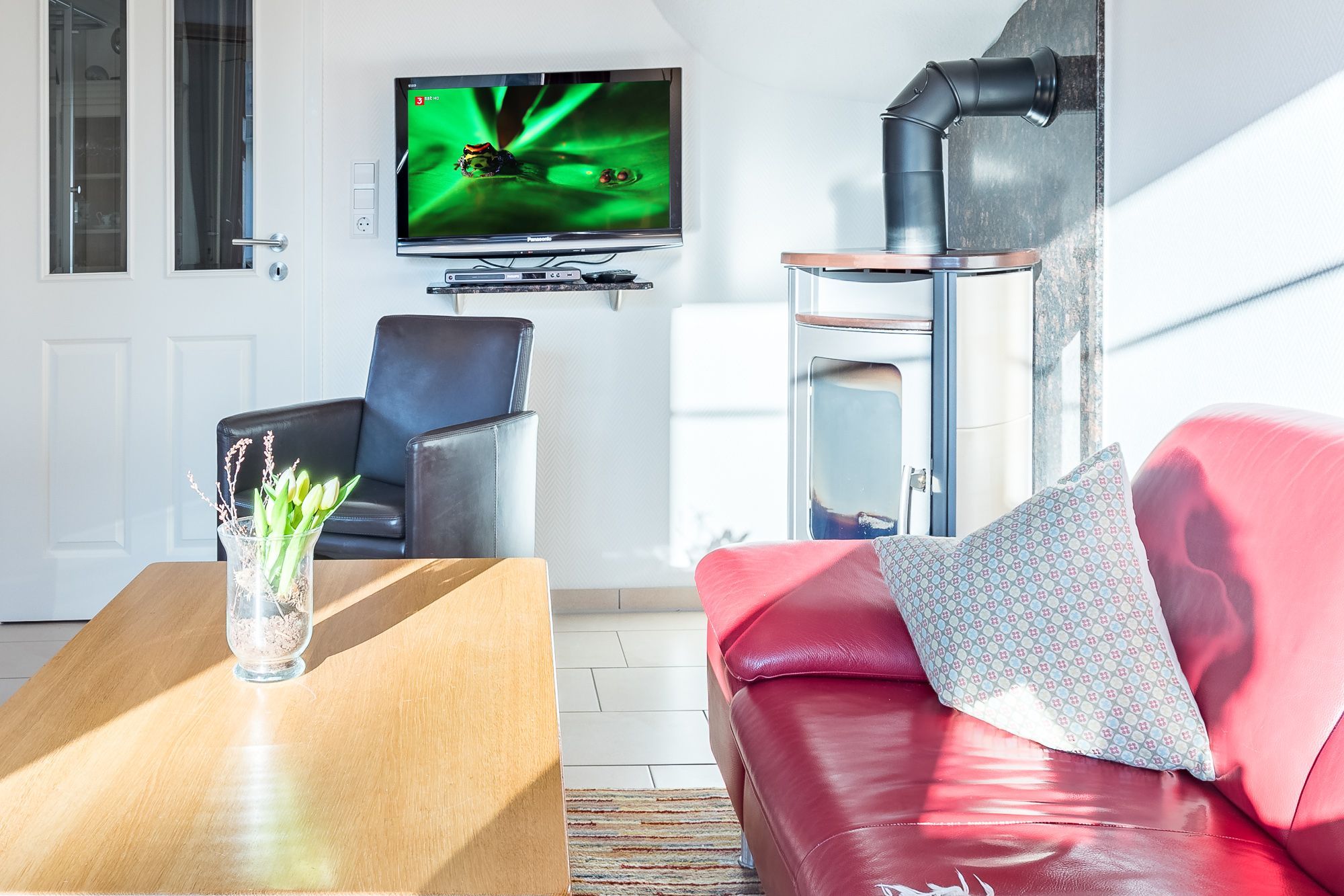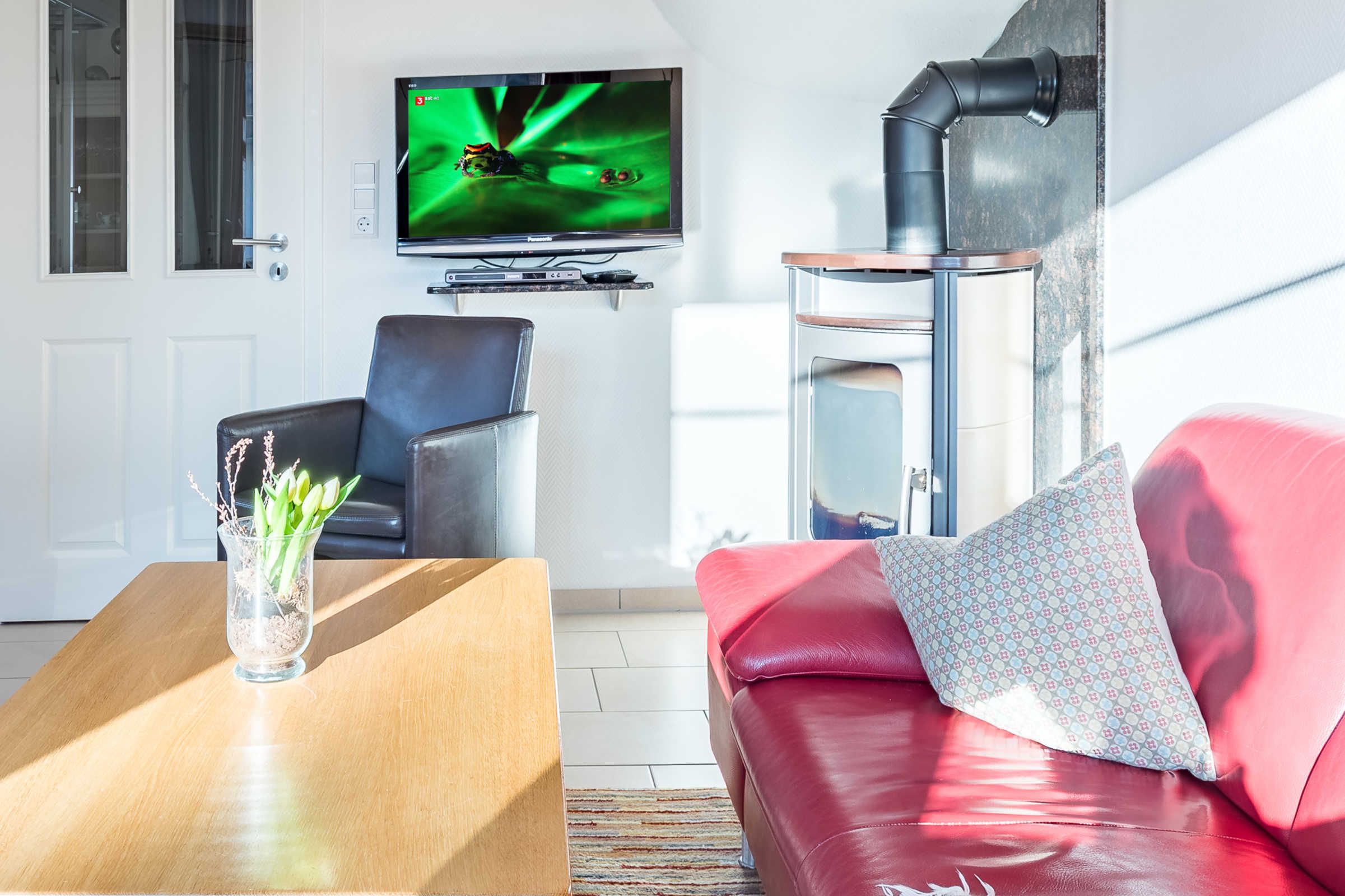 Das lichtdurchflutete Wohnzimmer in der ersten Wohnebene bietet neben der großen modernen Couch einen Kamin, der an kühlen Abenden zu gemütlichem Beisammensein einlädt. Ein Flatscreen-TV sorgt auf Wunsch für Unterhaltung. Die Couch ist ausziehbar und bietet somit den 5. Schlafplatz.