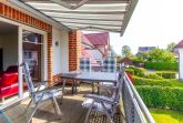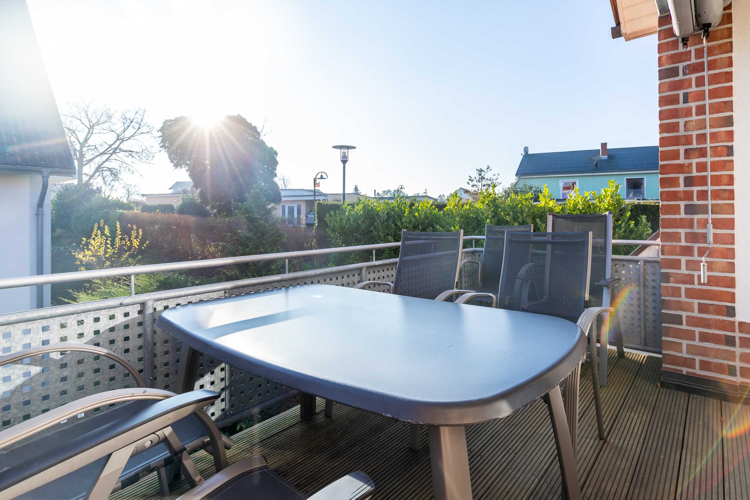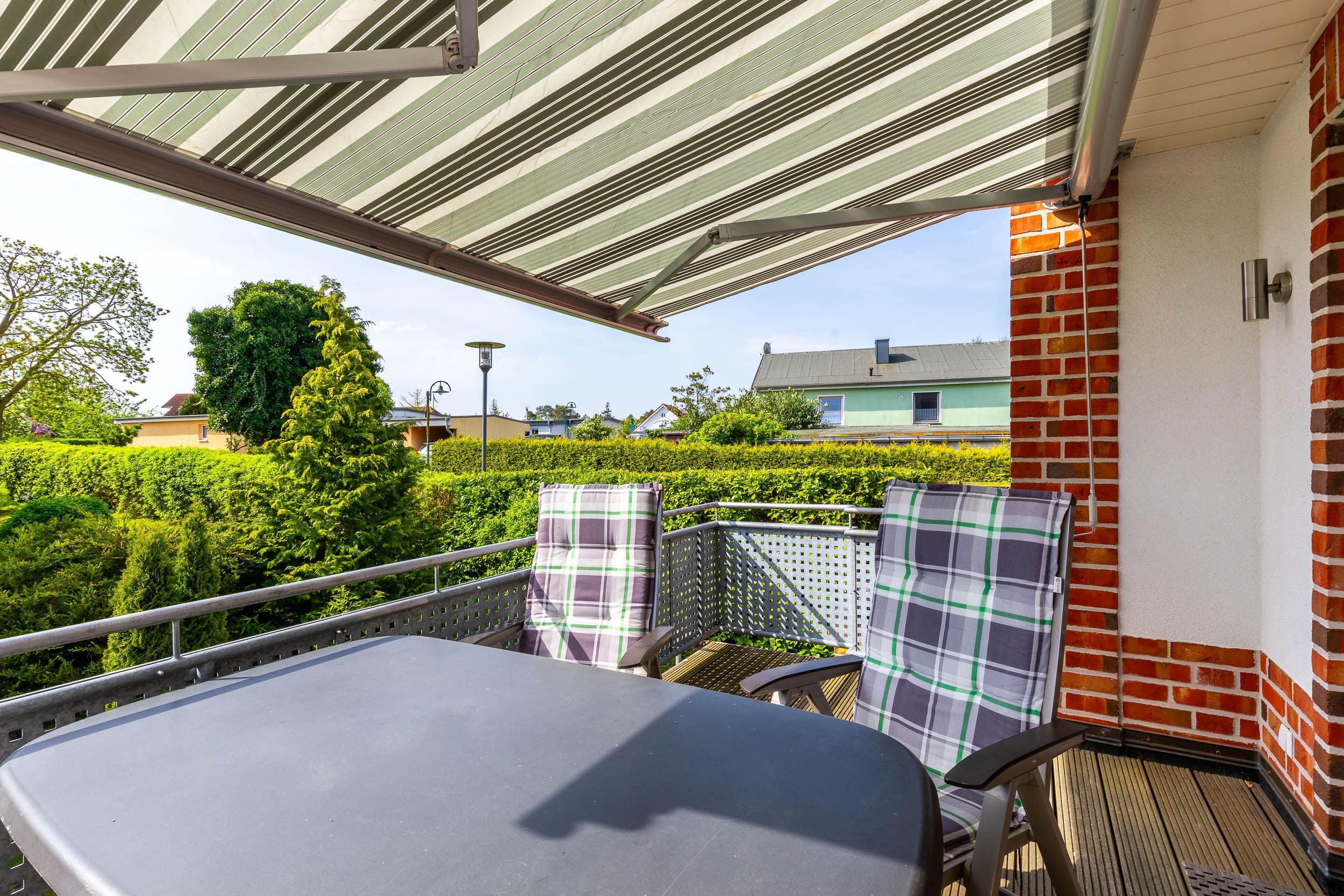 Auf dem angrenzenden möblierten Balkon mit Südostausrichtung, den Sie vom Wohnzimmer aus erreichen, finden Sie an sonnigen Tagen unter der Markise Schatten und Entspannung.
