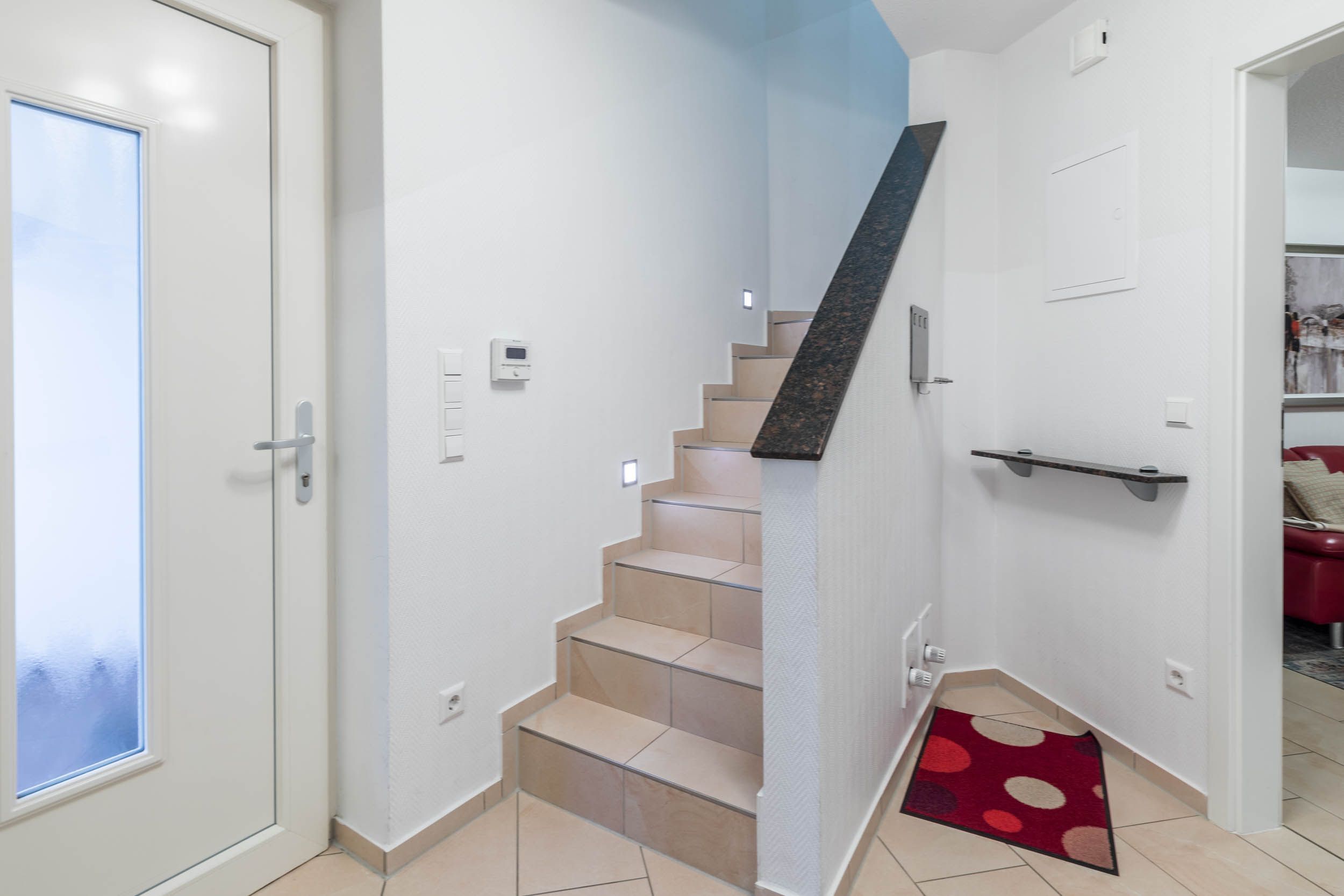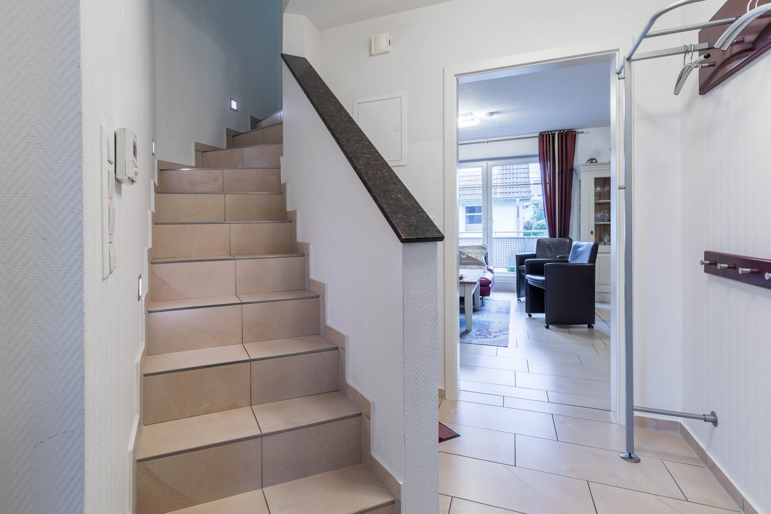 Vom Flur aus führt eine Treppe in die zweite Wohnebene, ins DG. Hier befinden sich die zwei Schlafräume sowie das zweite Bad.