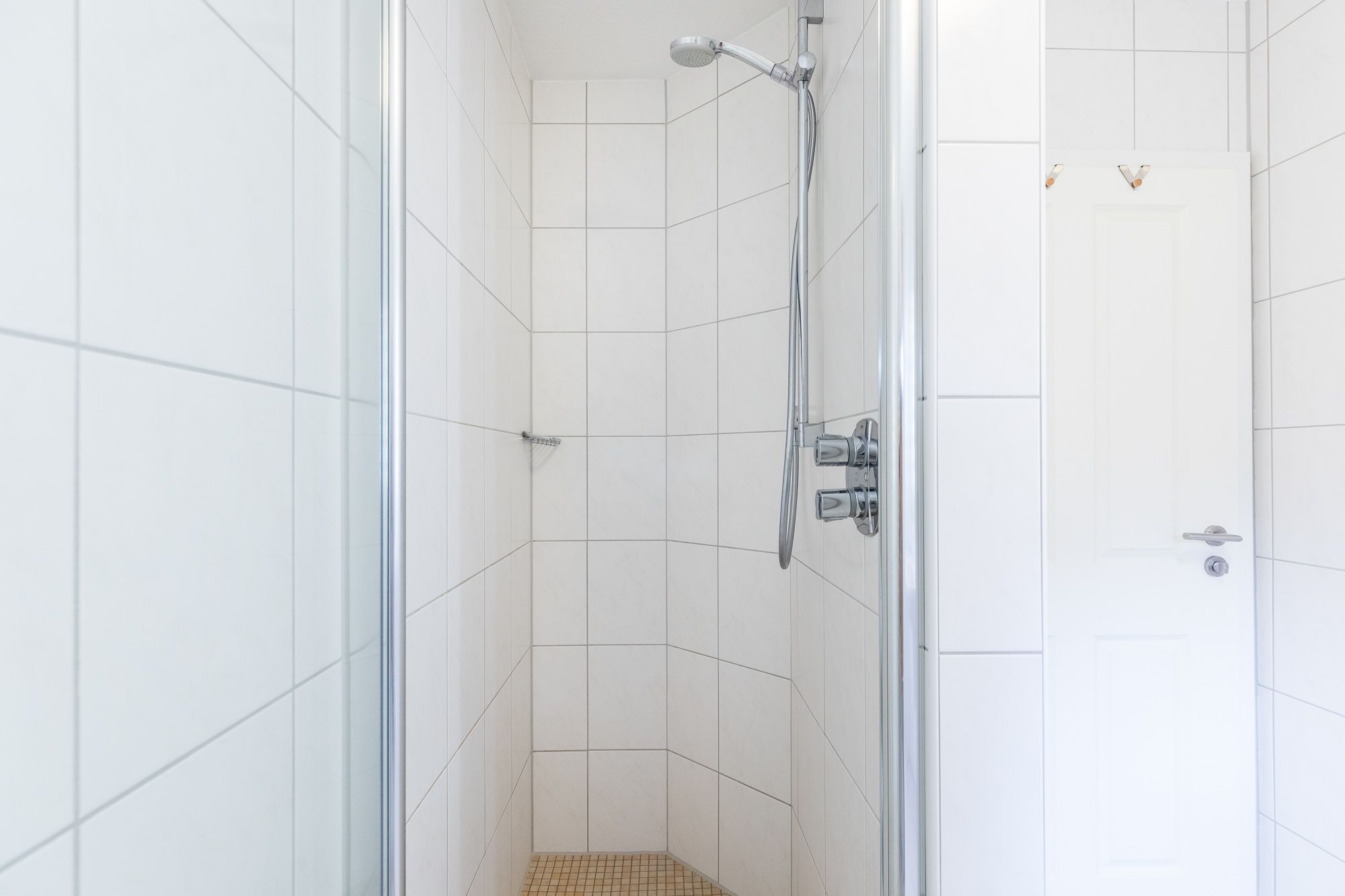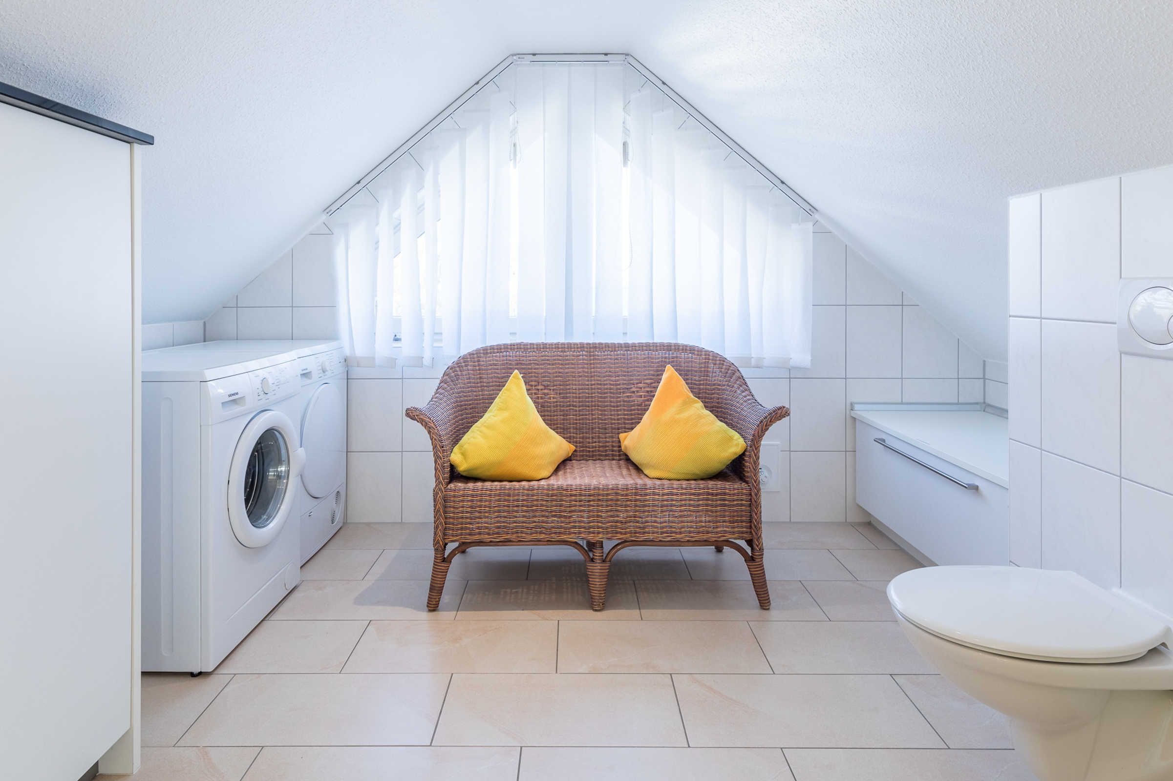 In dem zweiten, großzügigen und hellen Badezimmer finden Sie außer einer ebenfalls bodengleichen Dusche und WC auch eine Waschmaschine sowie einen Trockner vor (nutzbar gegen Münze).