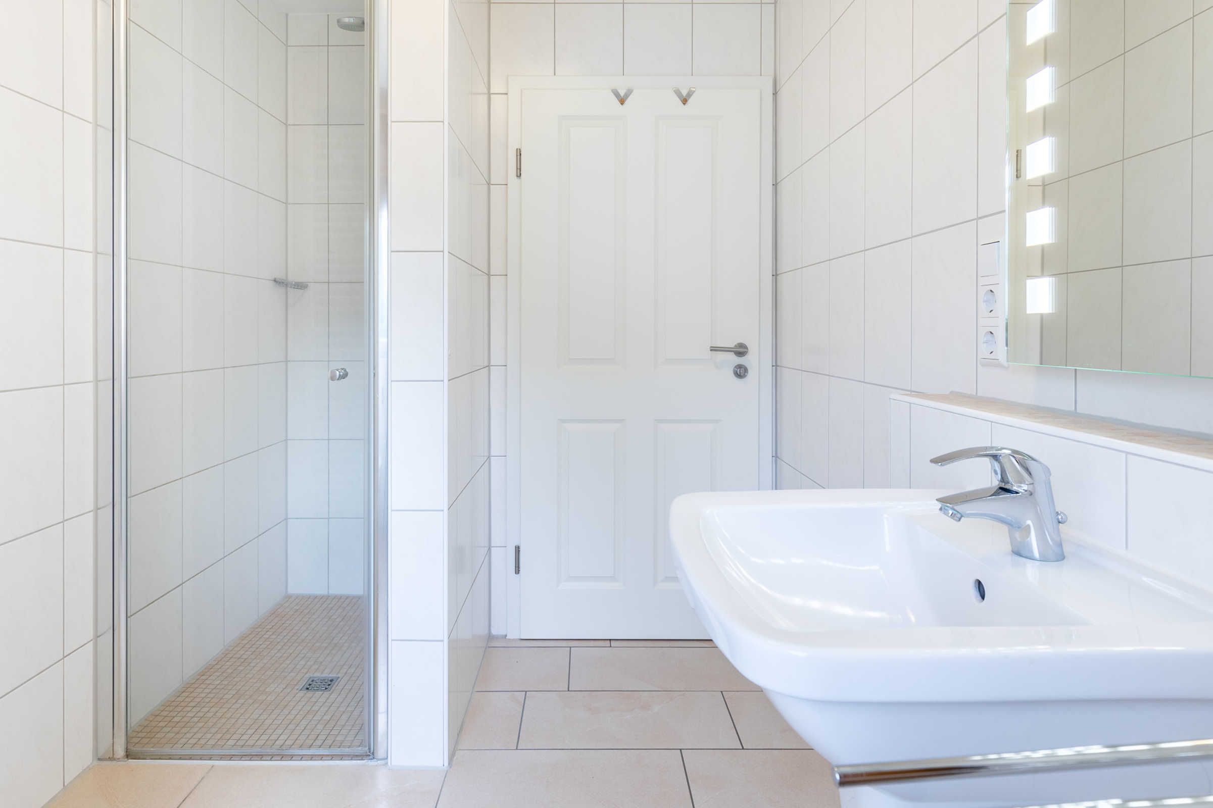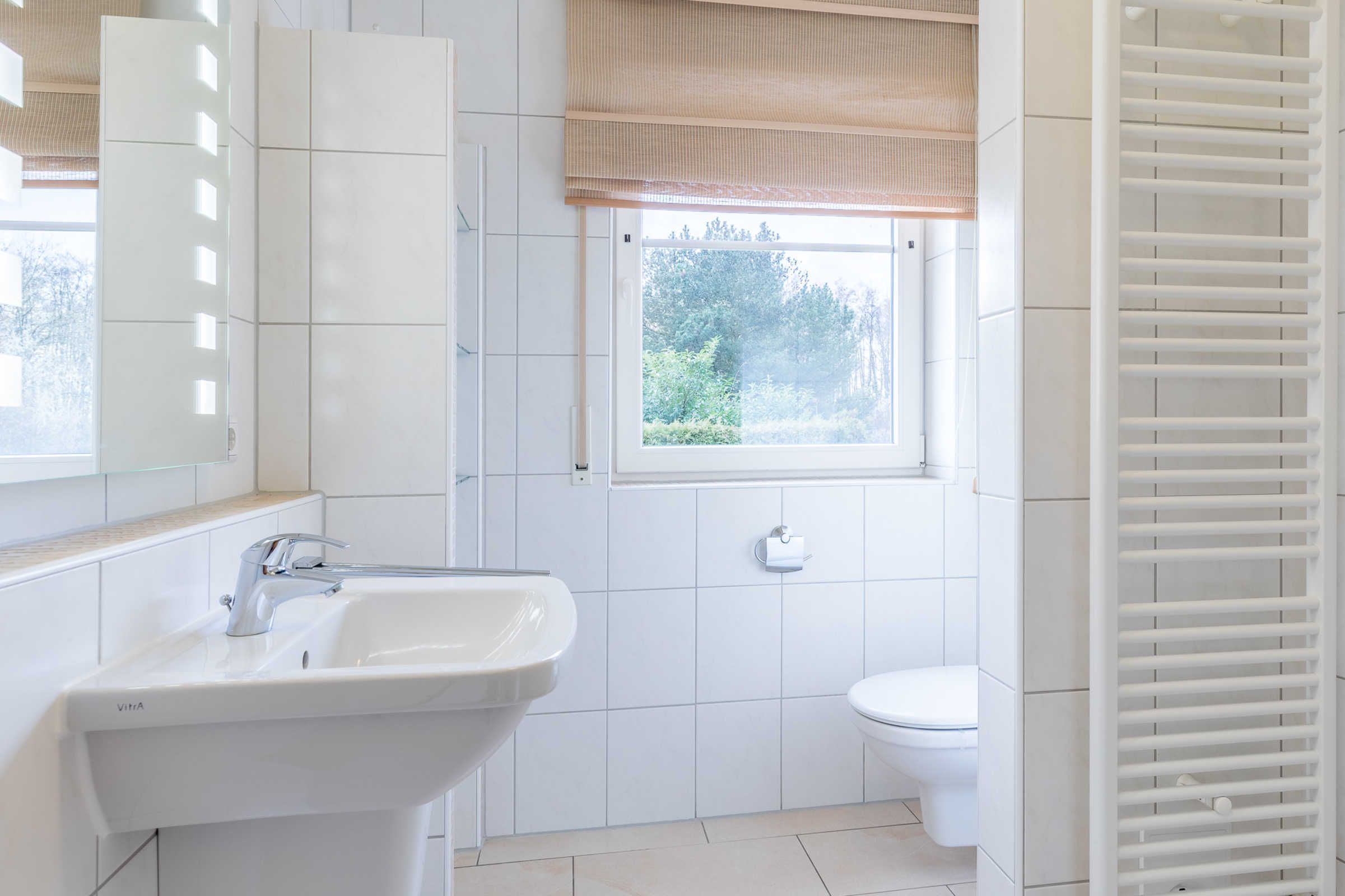 Weiterhin finden Sie auf dieser Ebene eines der zwei Bäder. Es ist hell und modern gefliest, verfügt über ein Fenster und bietet eine ebenerdige Dusche sowie WC und ein Waschbecken.