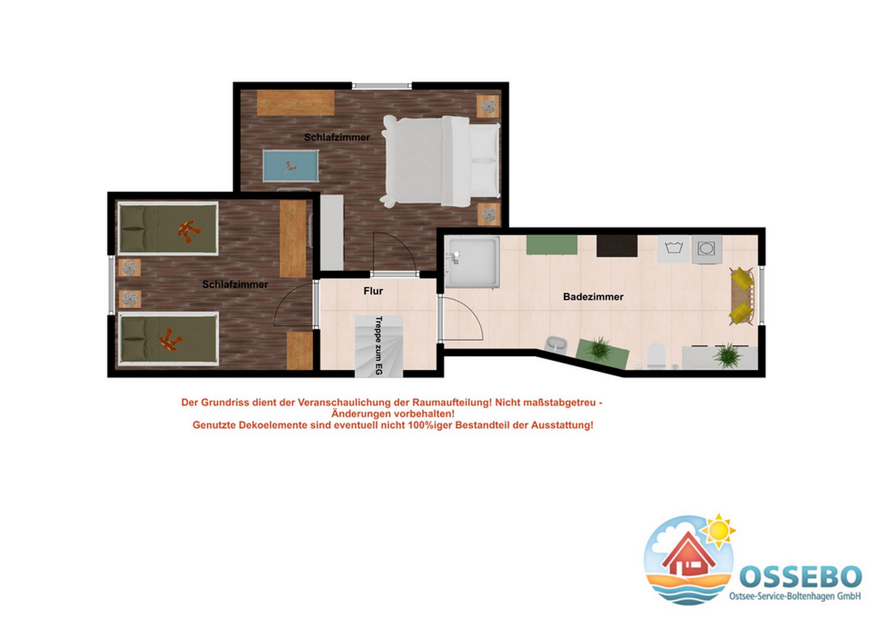 Im Gäste-/ Kinderzimmer gegenüber sorgen zwei Einzelbetten für einen erholsamen Schlaf. Für Ihre Garderobe gibt es hier 2 Kommoden. An den Gaubenfenstern befinden sich Gardinen und Rollos zum Abdunkeln.