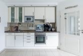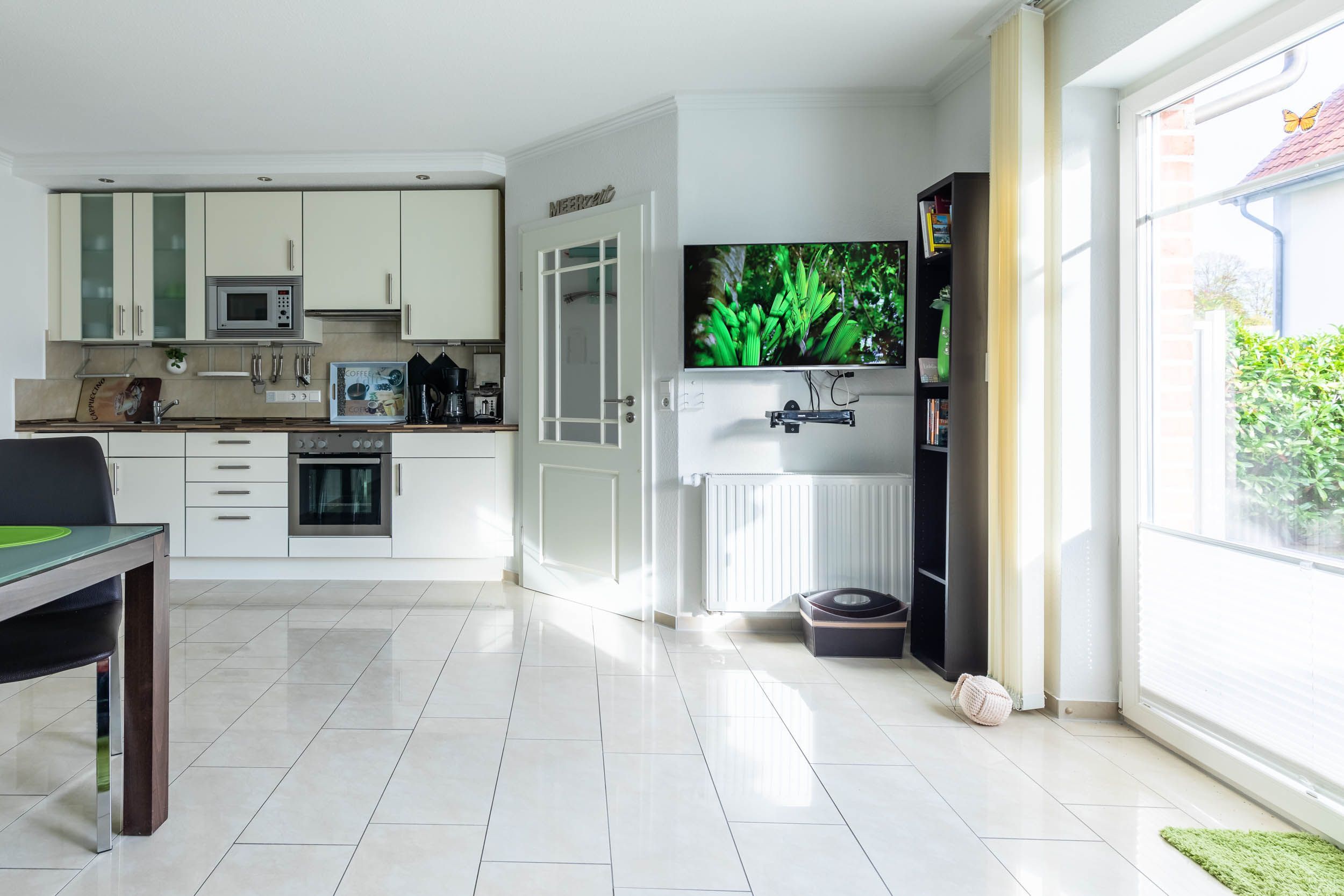 Der offenen Küchenzeile mit Mikrowelle, Geschirrspülmaschine uvm. schließt sich ein gemütlicher Essbereich für Alle an.