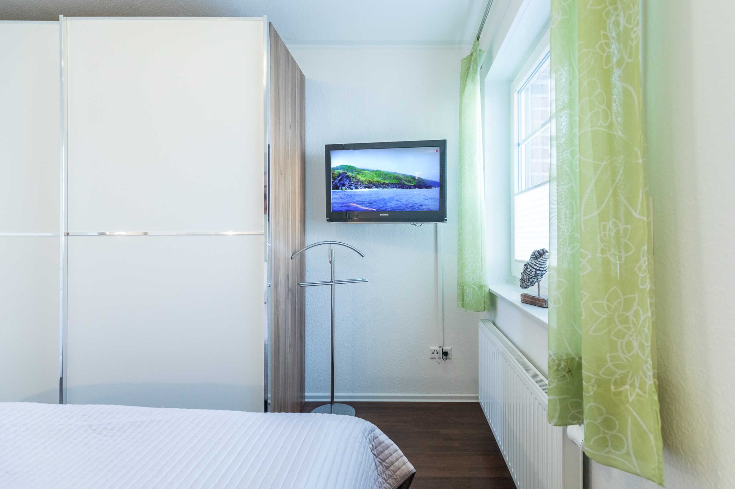 Im Schlafzimmer mit breitem Doppelbett und einem Kleiderschrank ist auch ein weiterer Fernseher an der Wand angebracht.