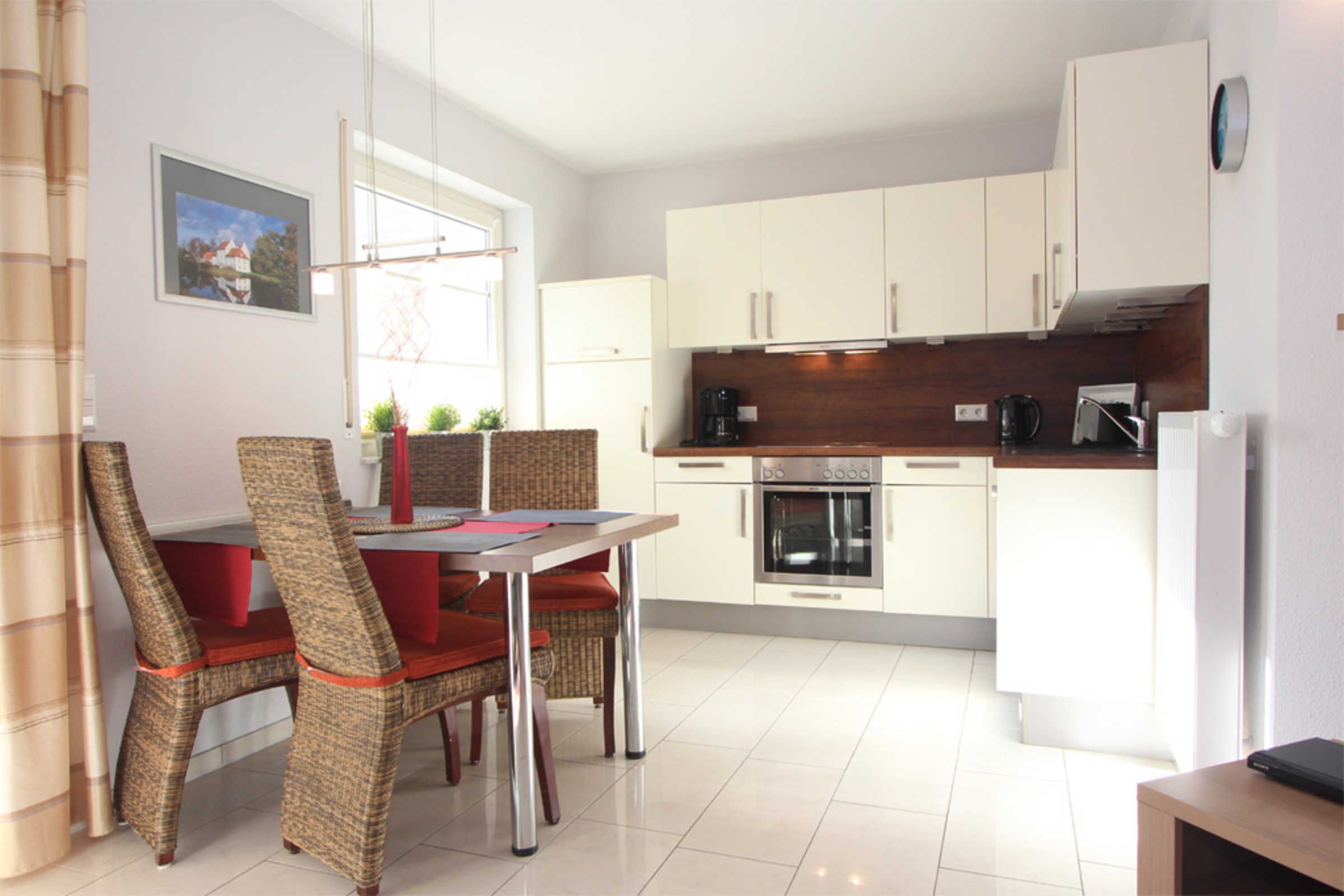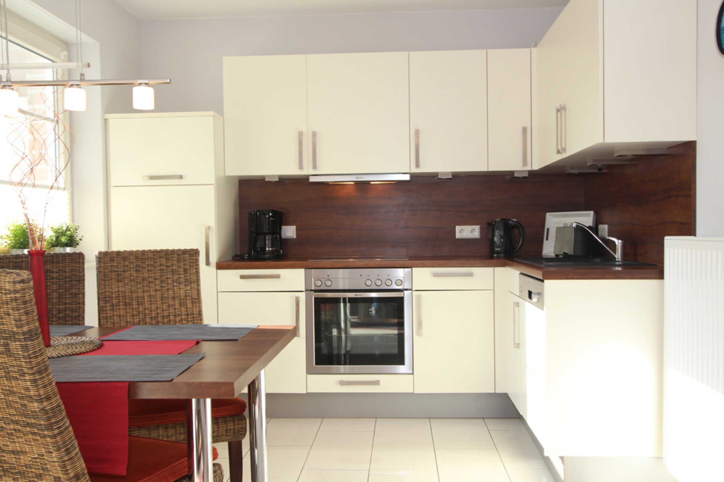 Die trendige offene Küchenzeile verwöhnt Sie mit allen notwendigen Küchenhelfern und bietet zudem eine schöne Essecke.