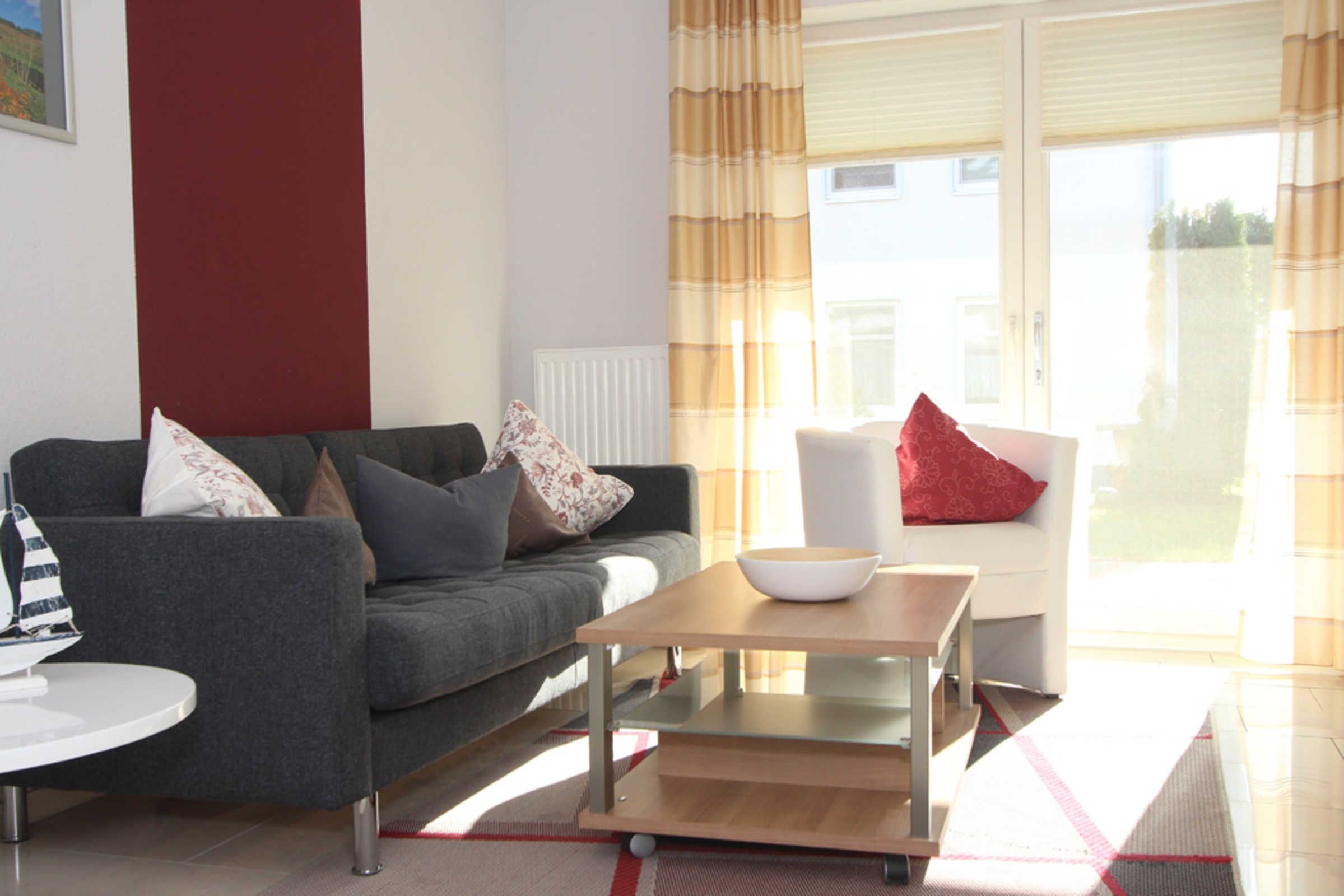 Das lichterfüllte Wohnzimmer ist neben geschmackvollen Möbeln mit einem gemütlichen Sofa, zwei Cocktailsesseln und Sat-TV ausgestattet.