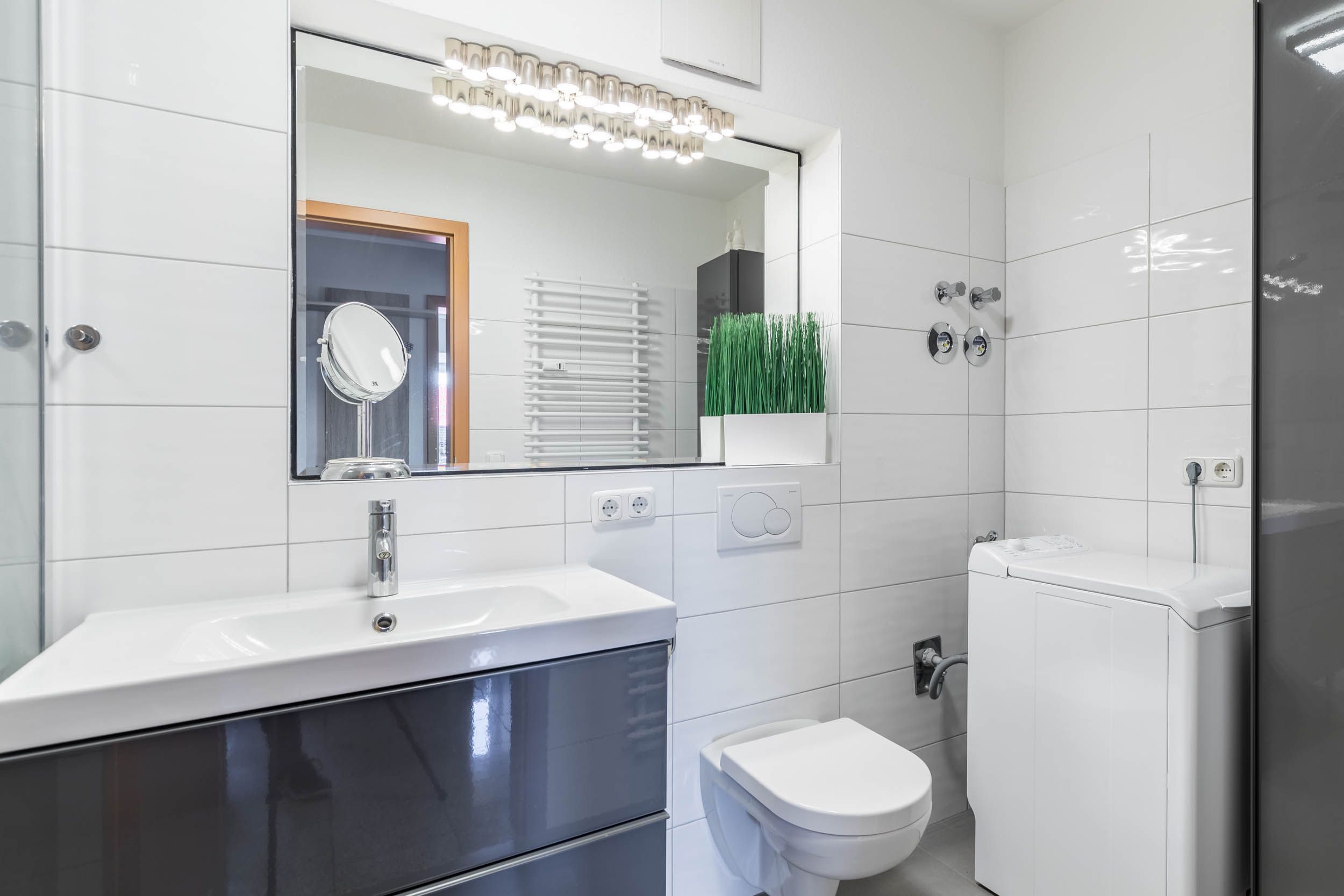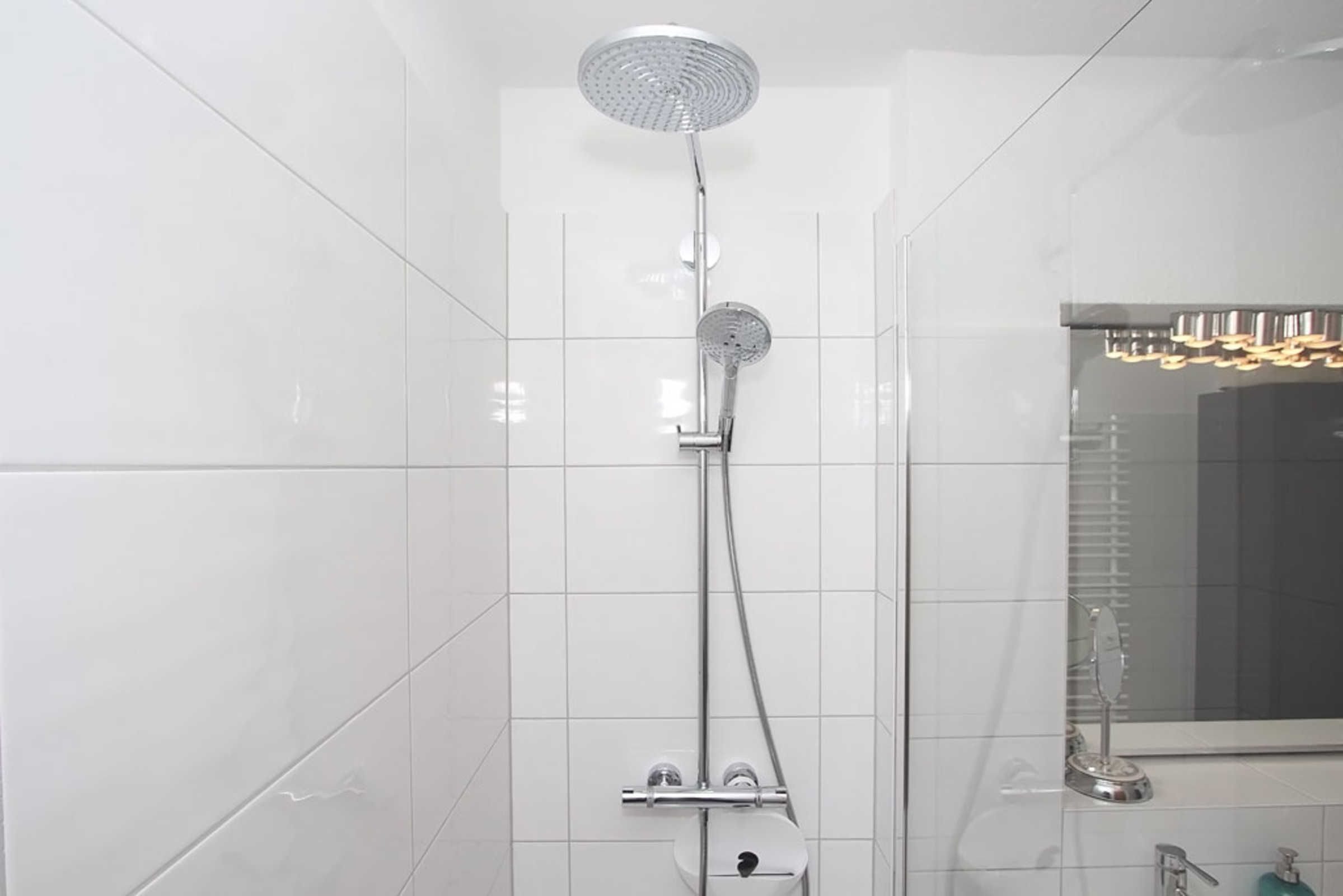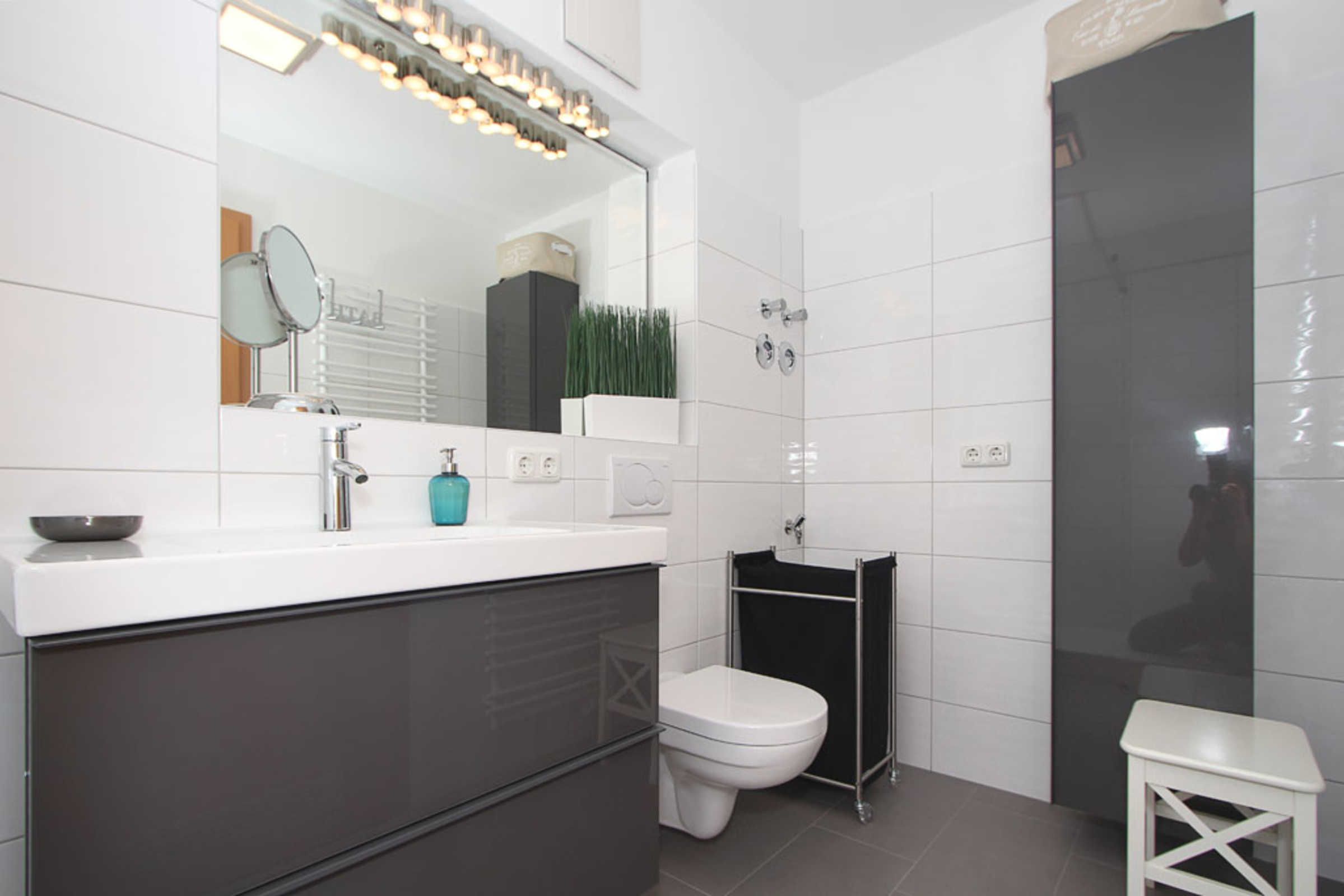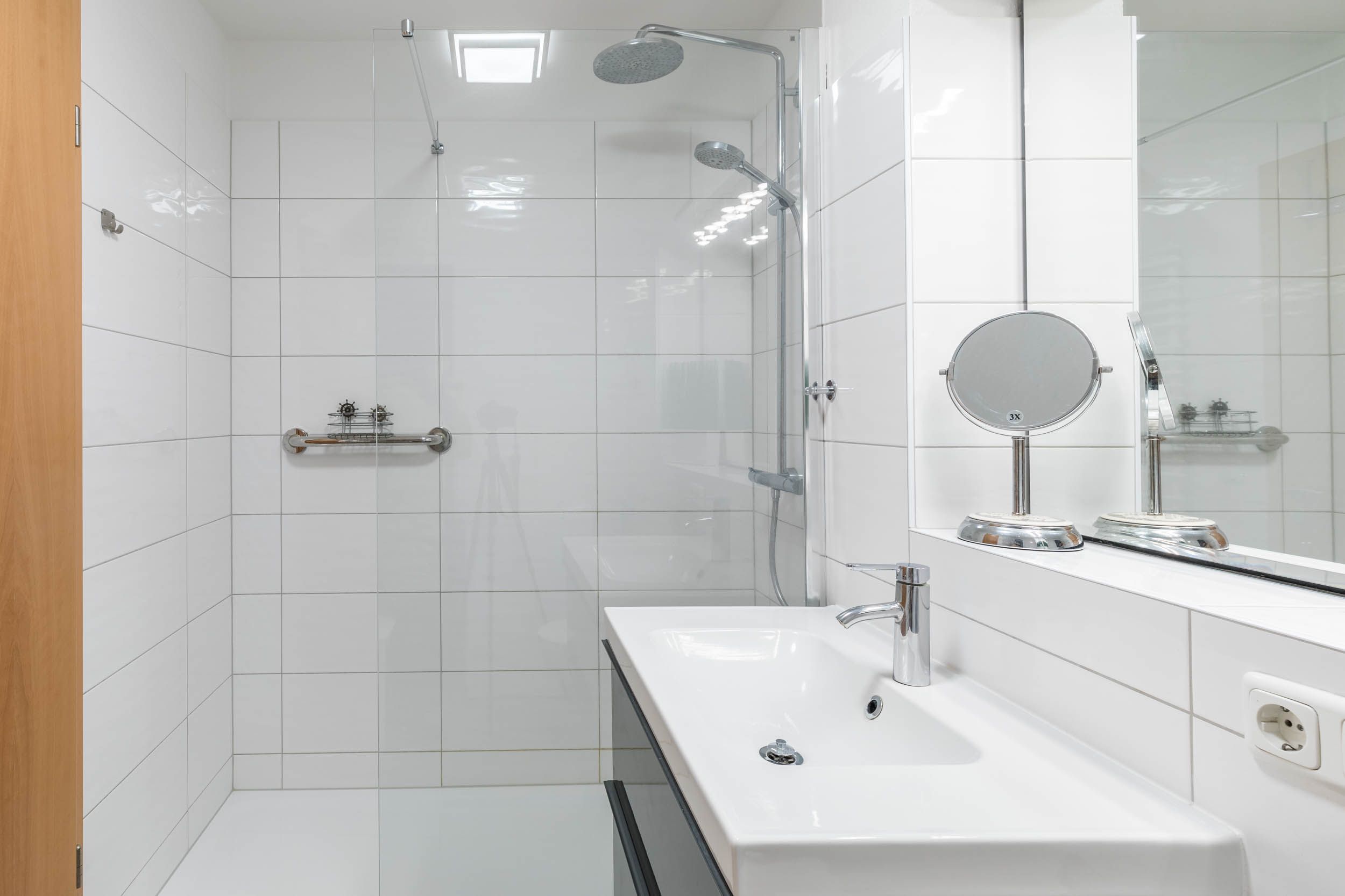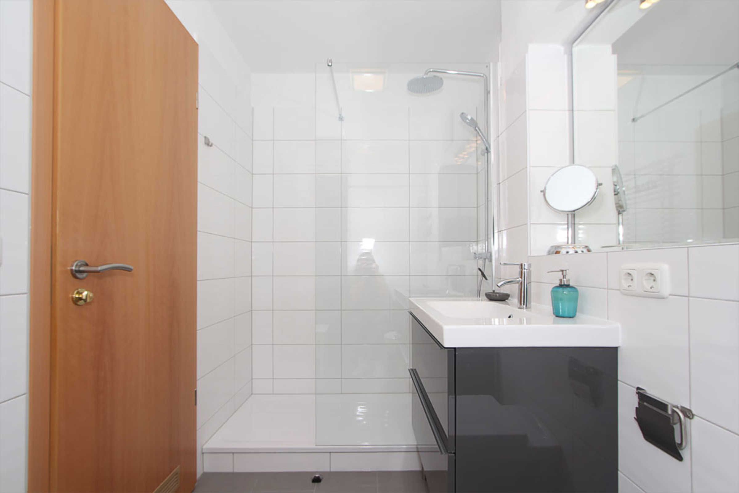 Das Badezimmer bietet Waschtisch, Dusche und WC. Der Eingangsbereich ist einladend eingerichtet.