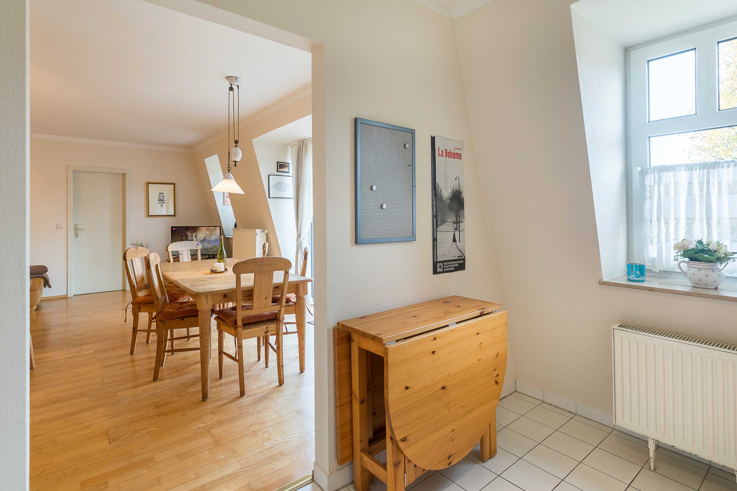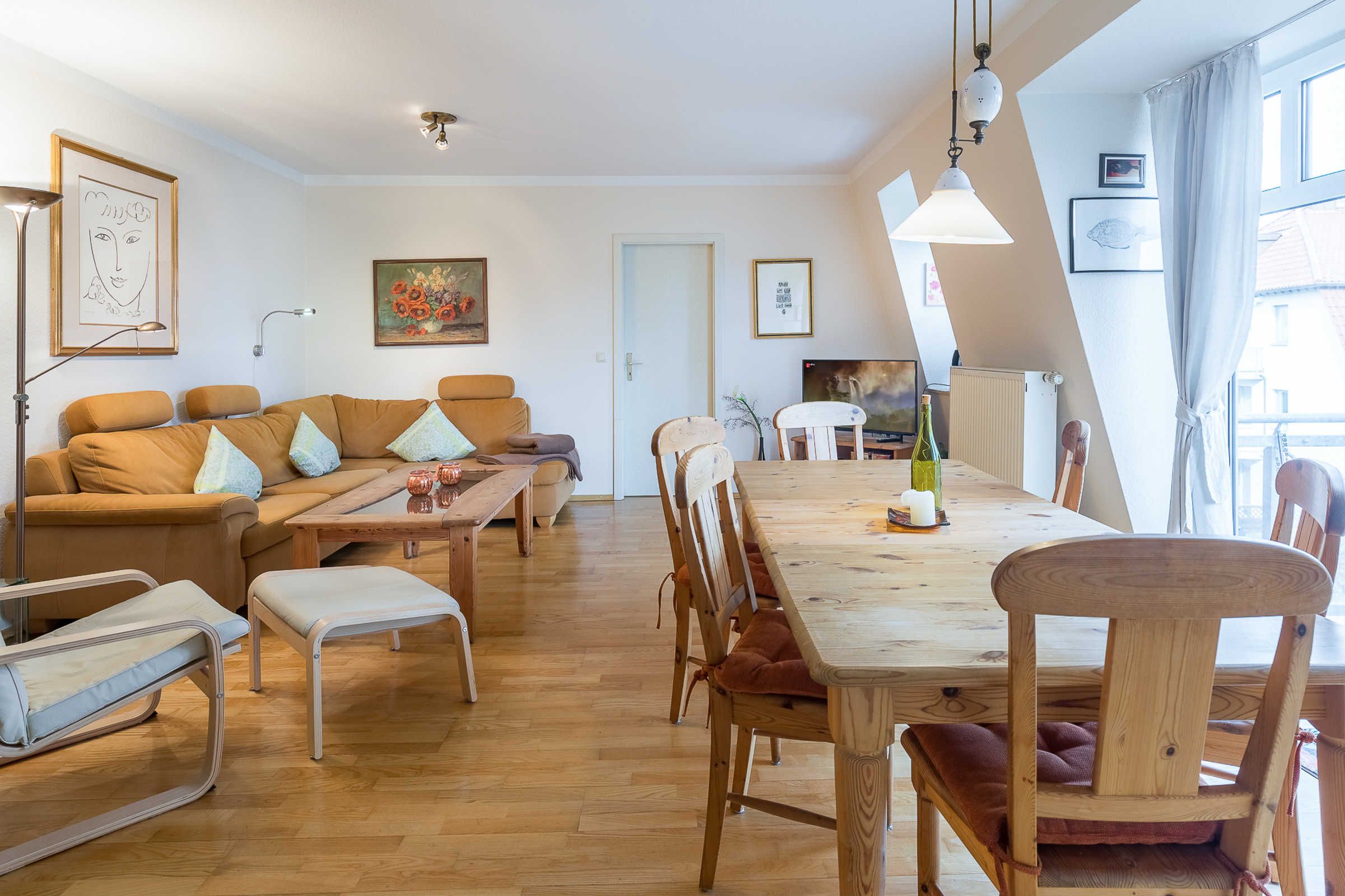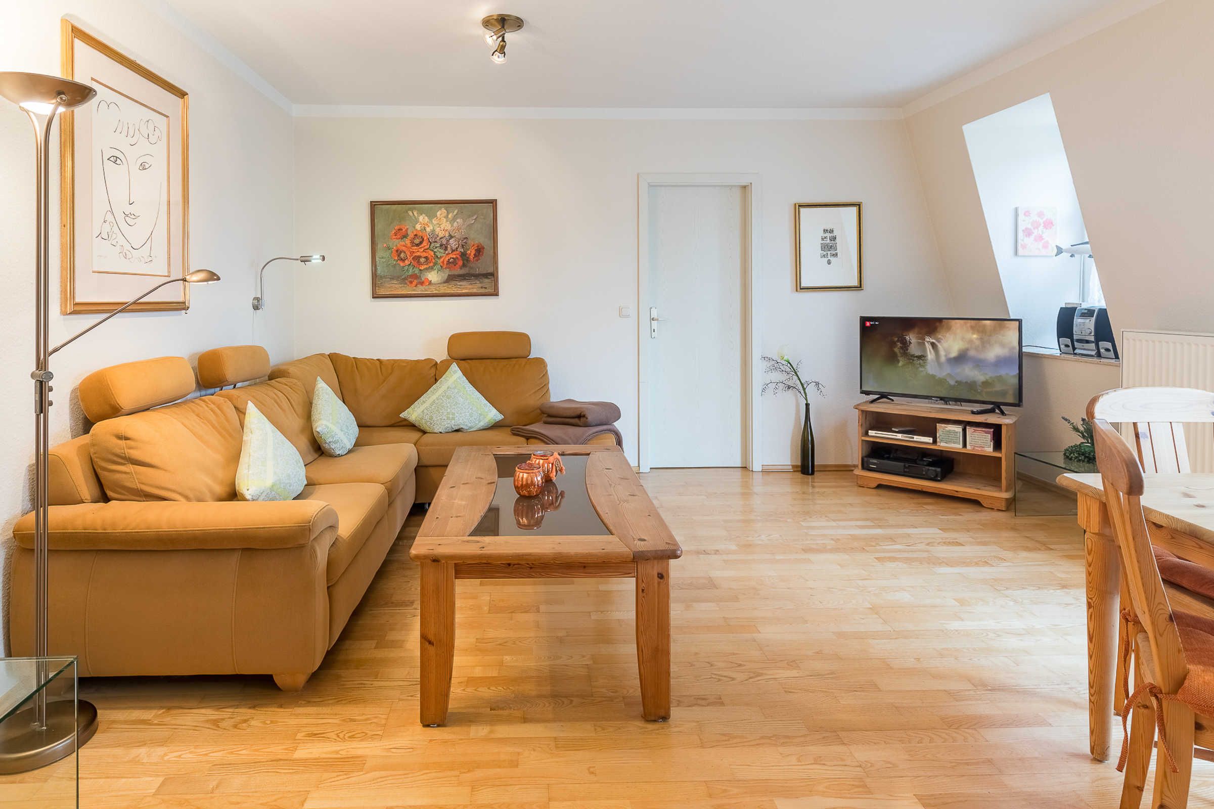 Vom Wohnzimmer mit bequemer Polstergarnitur und Unterhaltungselektronik gelangen Sie direkt auf den möblierten Nordbalkon, Richtung Ostsee.