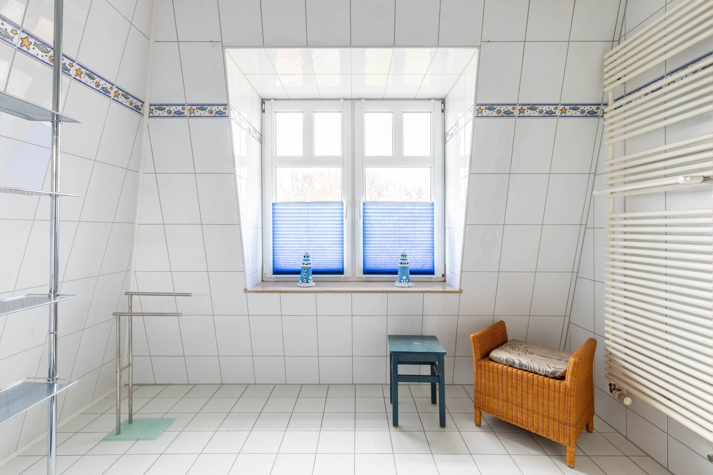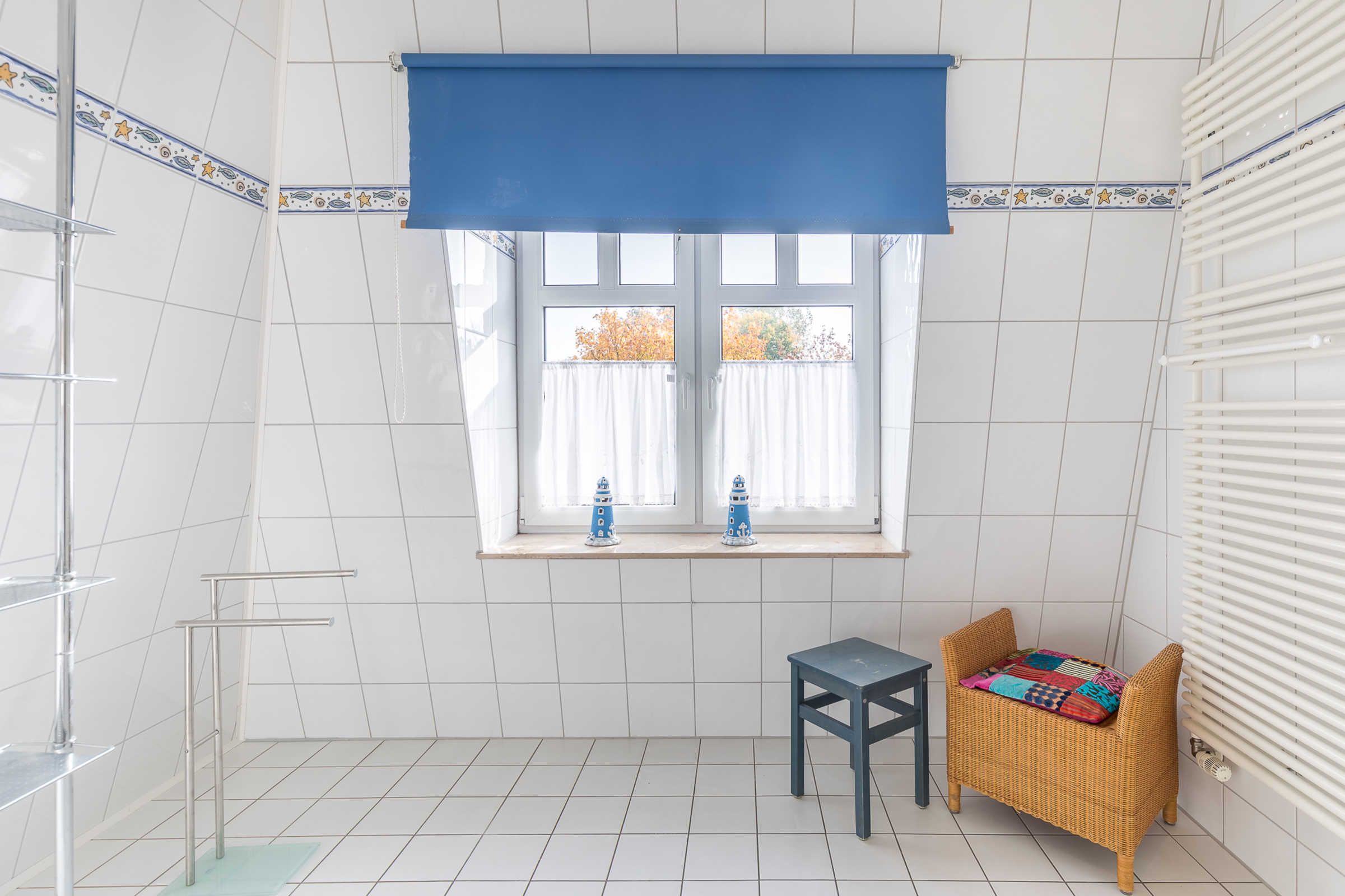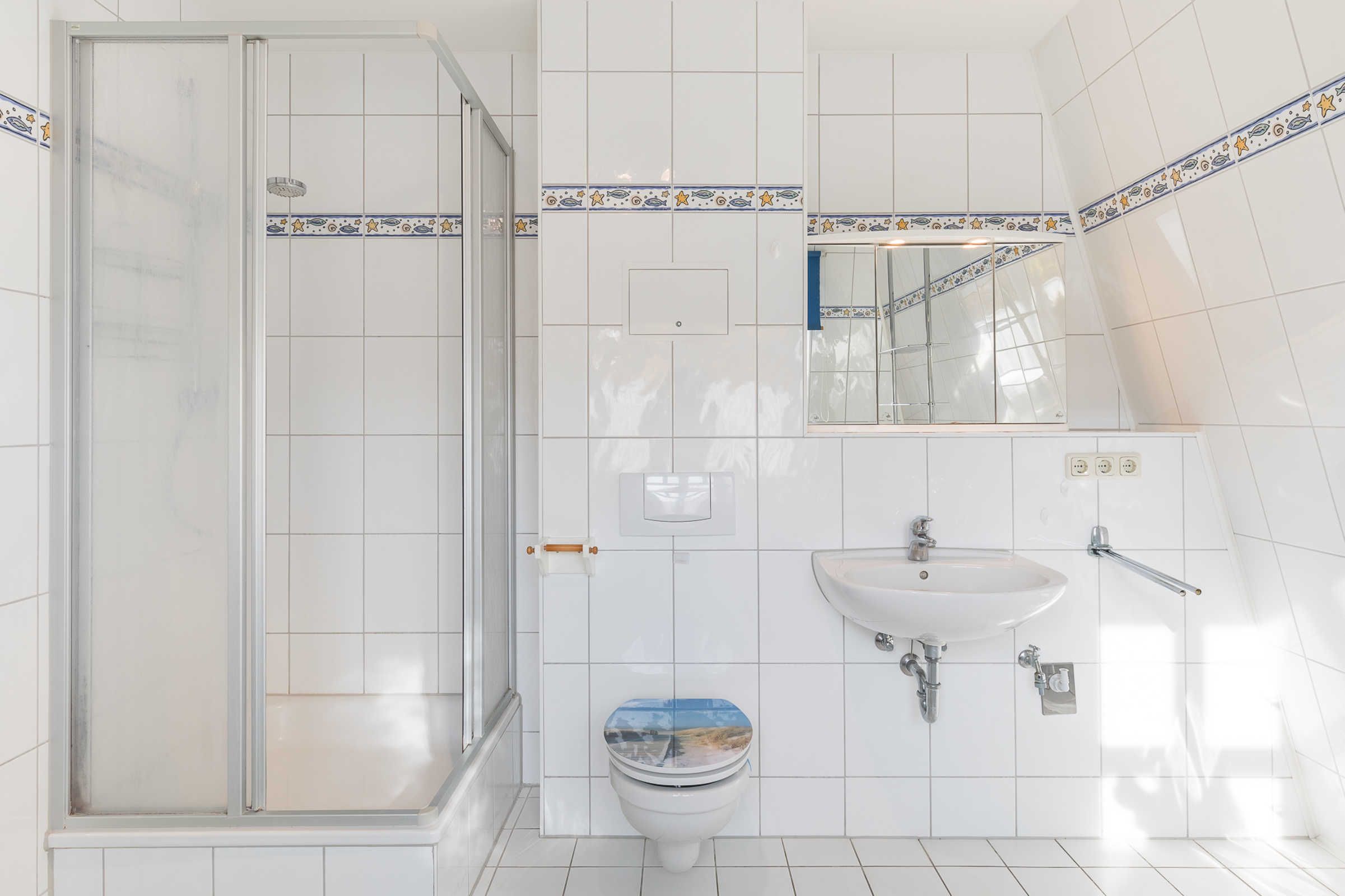 Das moderne Bad mit Tagelicht schließt sich an und bietet Dusche, Waschbecken und WC.