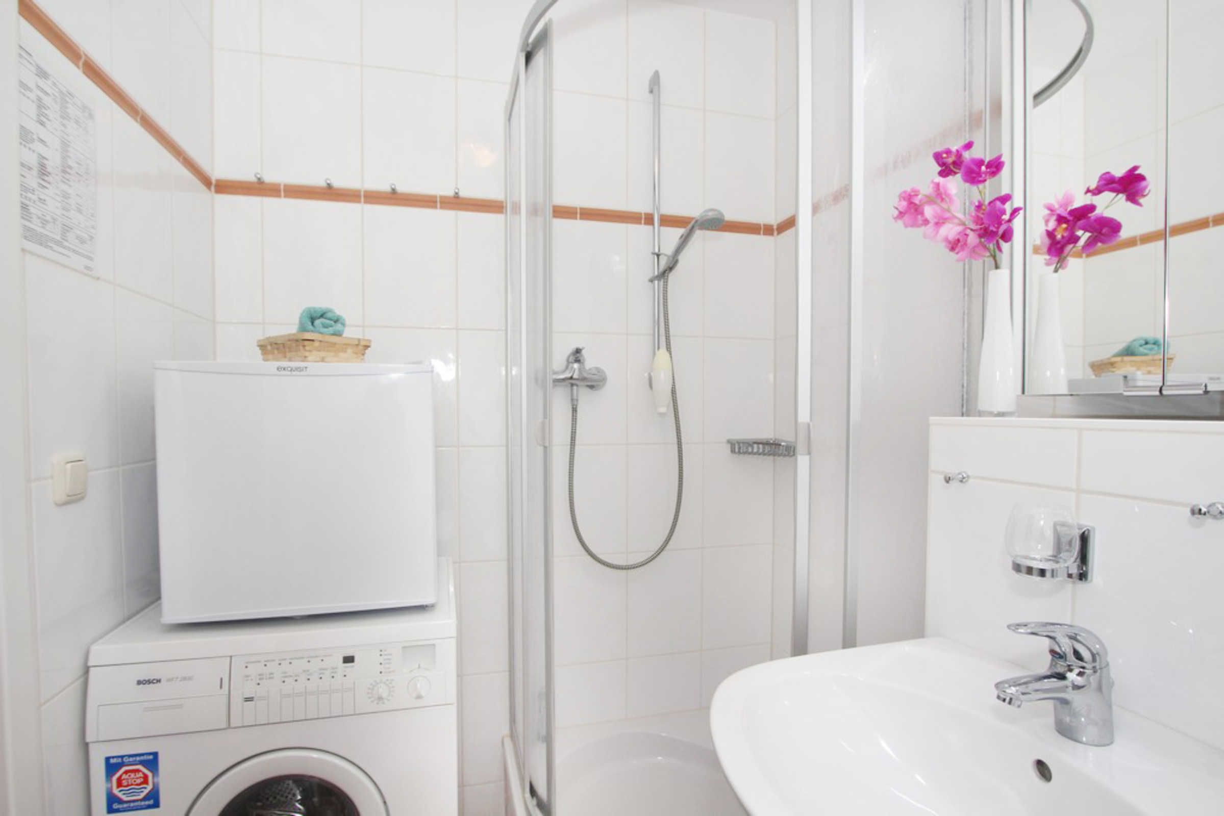 Es stehen Ihnen zwei Bäder mit geräumigen Duschen und hochwertigen Spiegelschränken zur Verfügung. In einem der Bäder befindet sich auch die Waschmaschine mit Trockner.