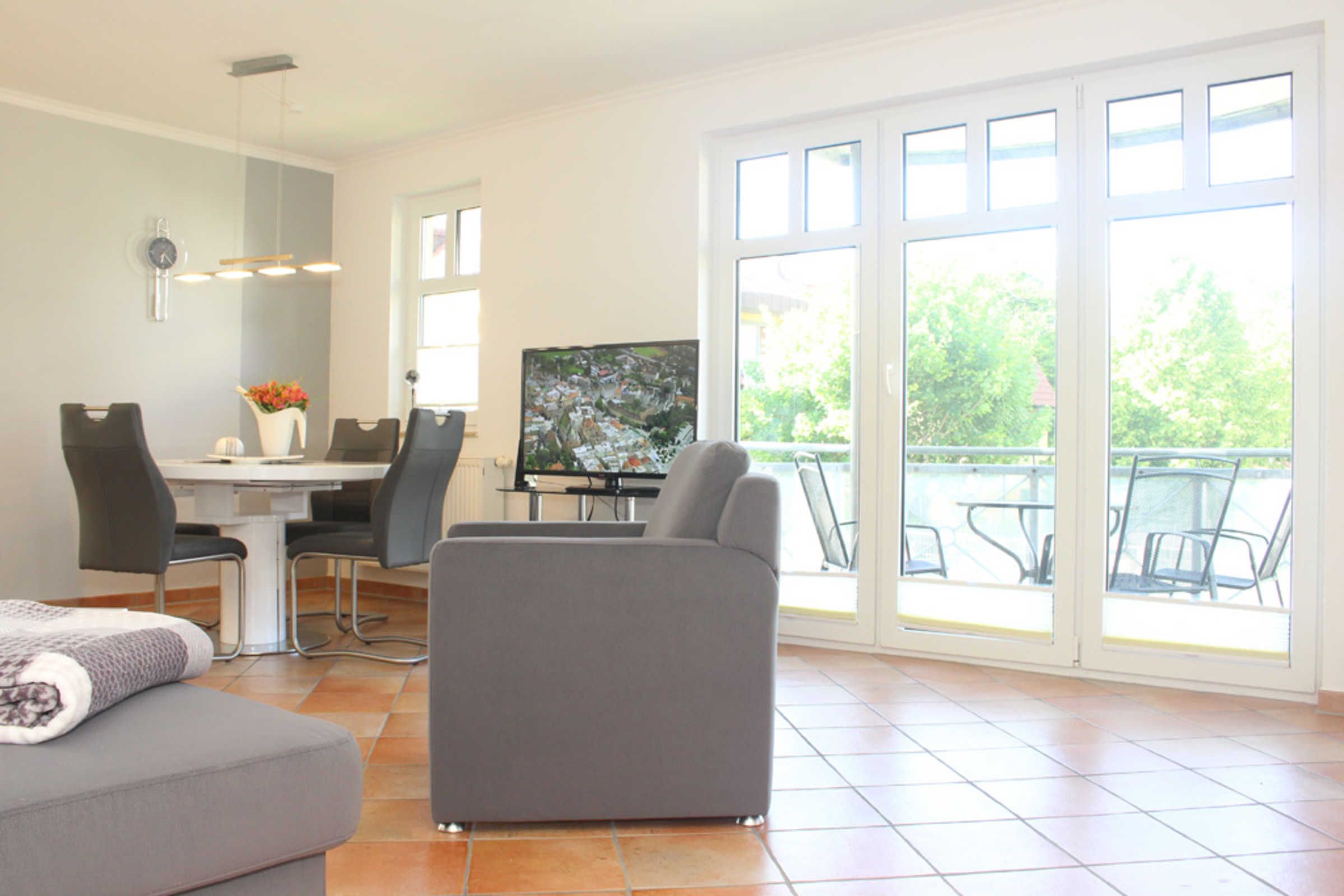 Diese Ferienwohnung mit möbliertem Balkon in Ausrichtung zur Ostsee (Norden), welchen Sie vom Wohnzimmer aus erreichen, lässt Urlaubsstimmung aufkommen. Im Herbst/ Winter können Sie sogar einen Blick auf die Ostsee erhaschen.