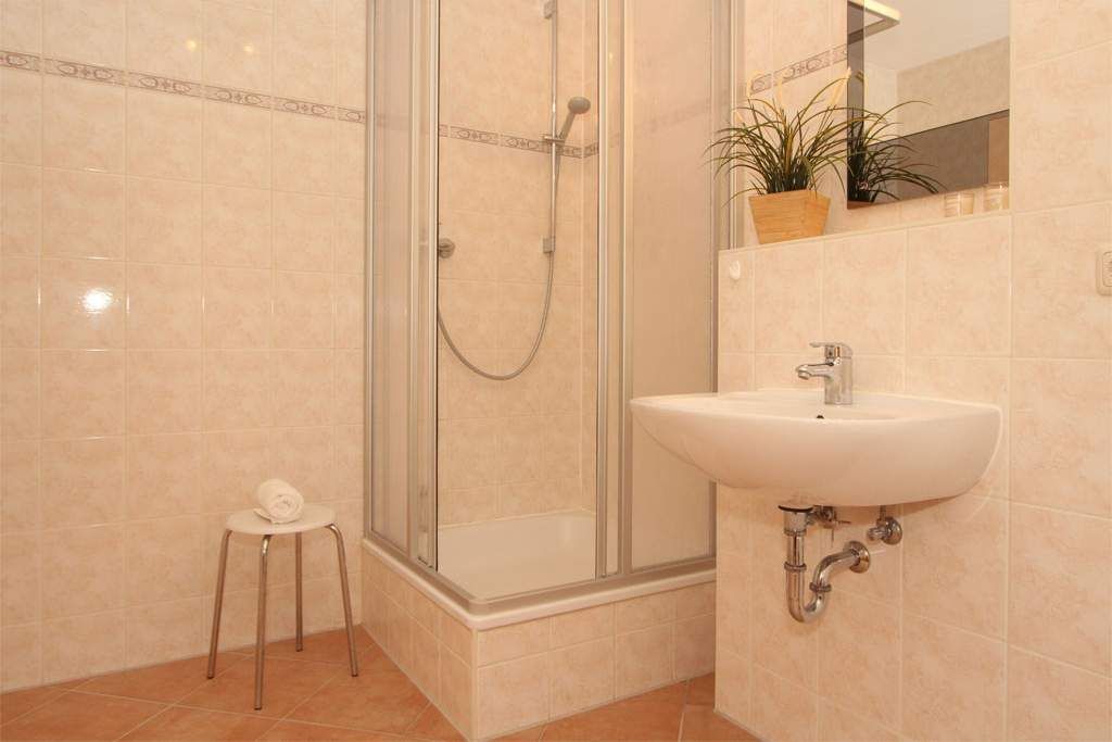 Das geräumige Bad umfasst eine Dusche, WC, Waschbecken und einen Föhn.
