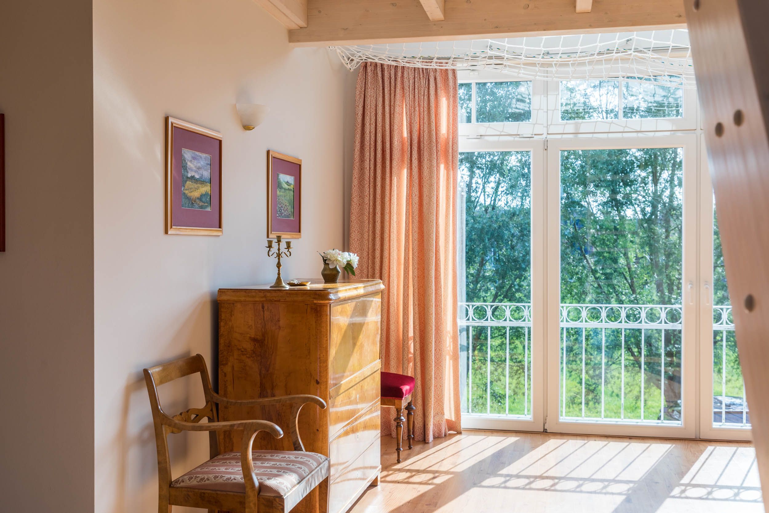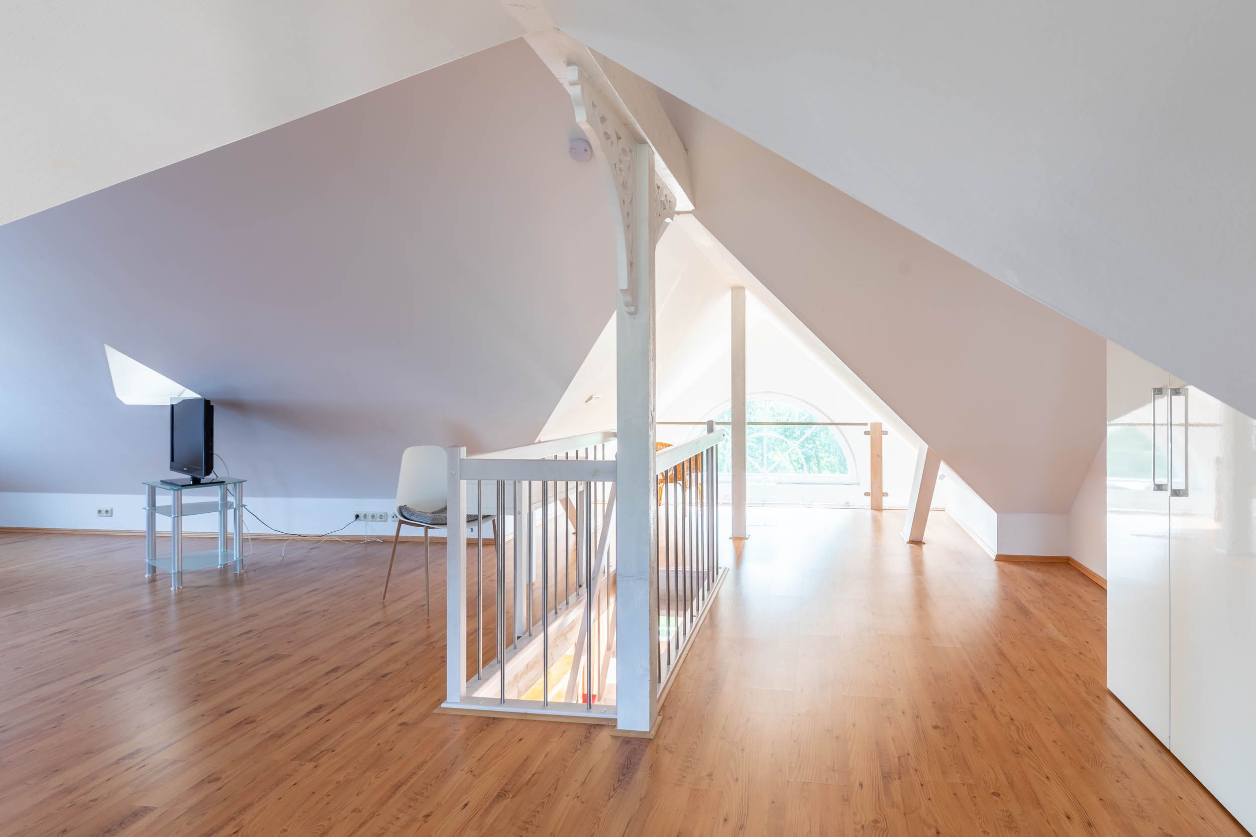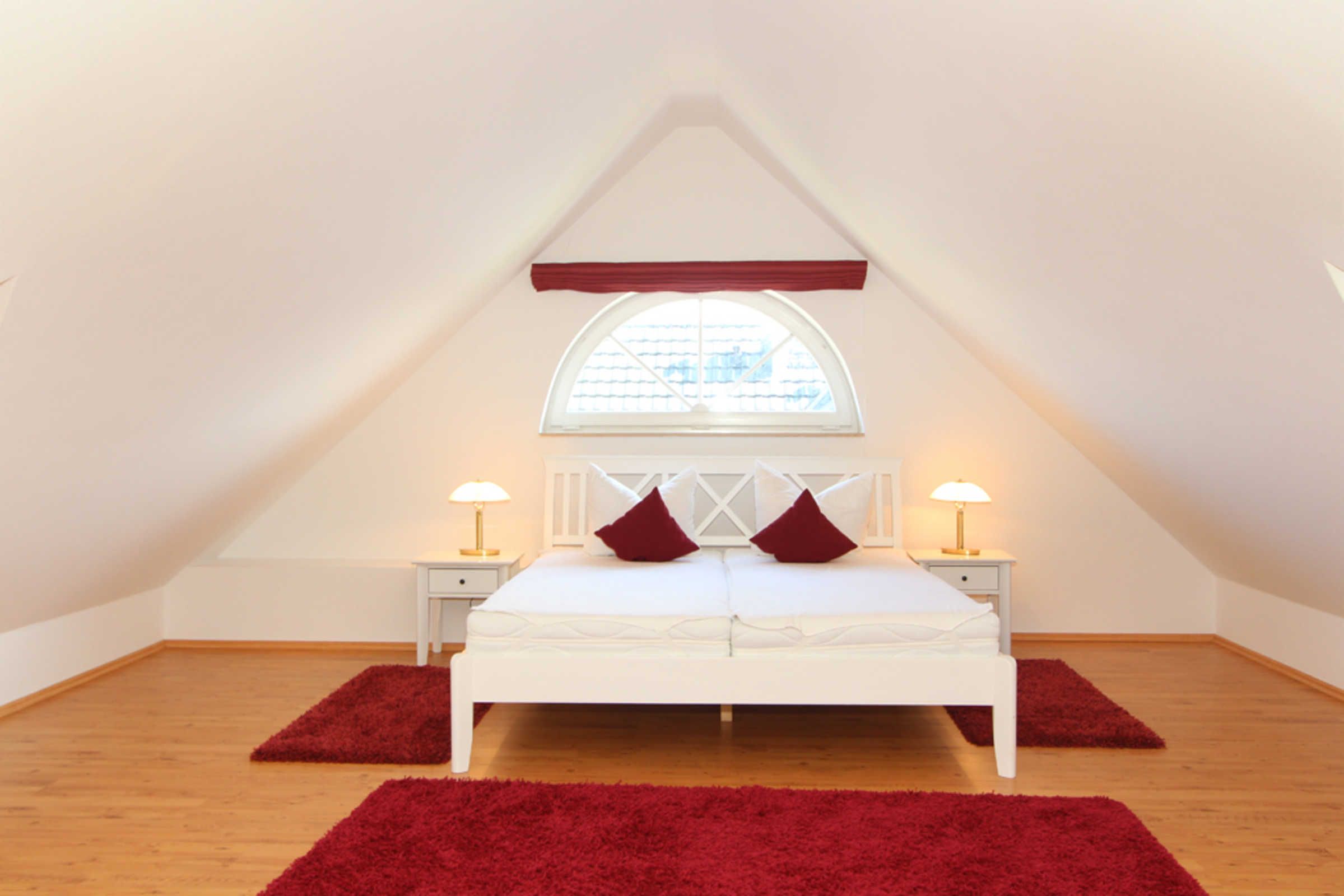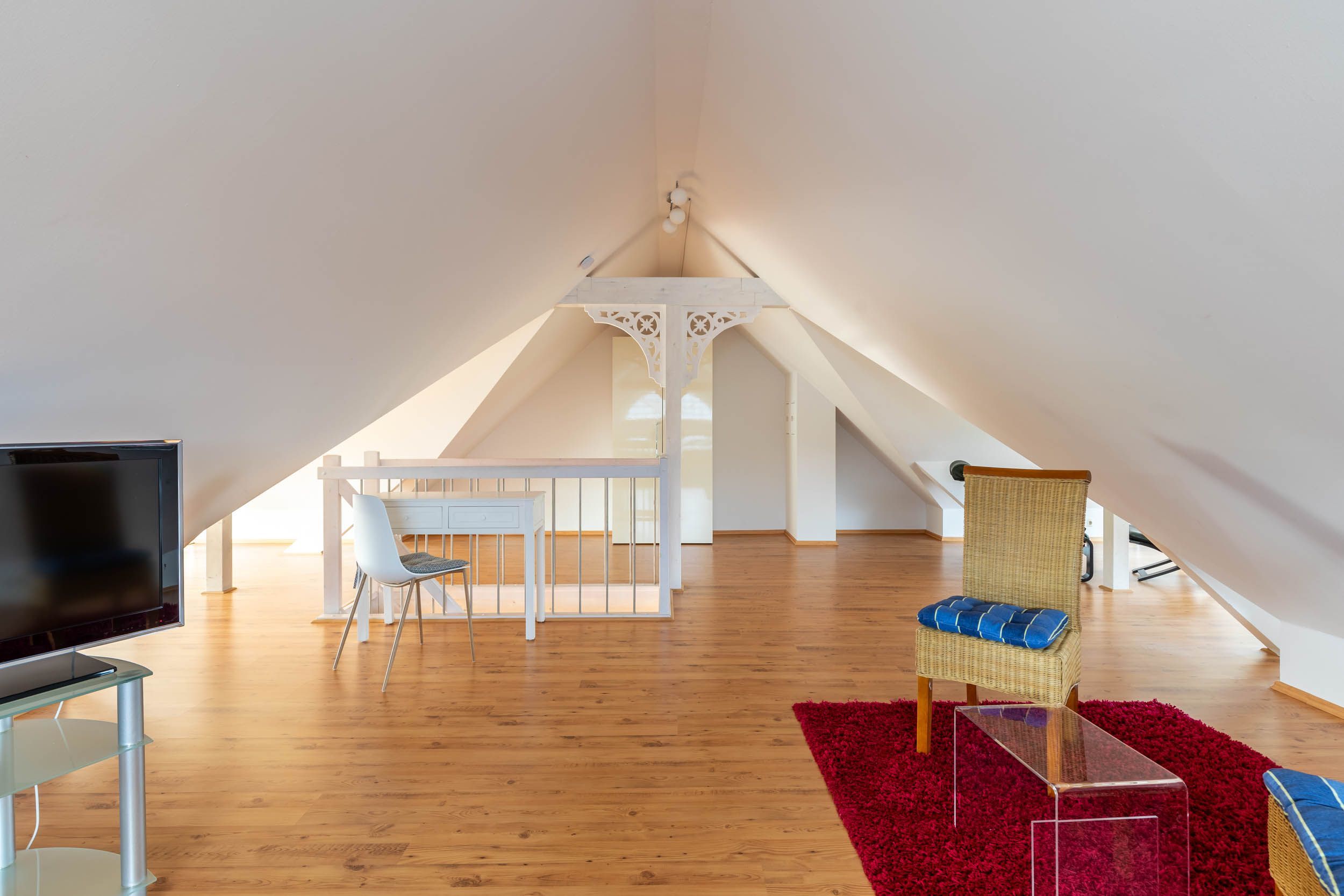 Während ein Schlafzimmer mit Doppelbett und Kleiderschrank auf der unteren Ebene eingerichtet ist, wartet in der zweiten Wohnebene, dem Dachgeschoss eine große offene Schlafgalerie auf Sie. Auch hier befindet sich ein Doppelbett und zusätzlich ein weiterer Fernseher. Lassen Sie sich auch hier vom traumhaften Ausblick inspirieren und schreiben z.B. Ihre Urlaubspost an dem vorhandenen Schreibtisch. Oder entspannen Sie einfach vor dem Gaubenfenster auf dem gemütlichen großen Relax-Sessel.