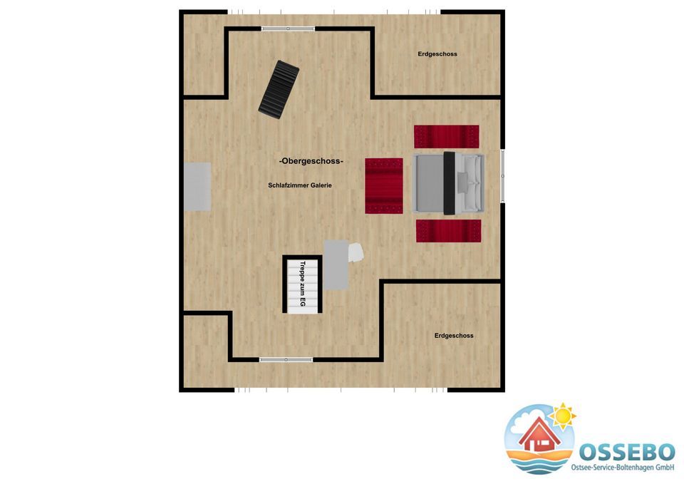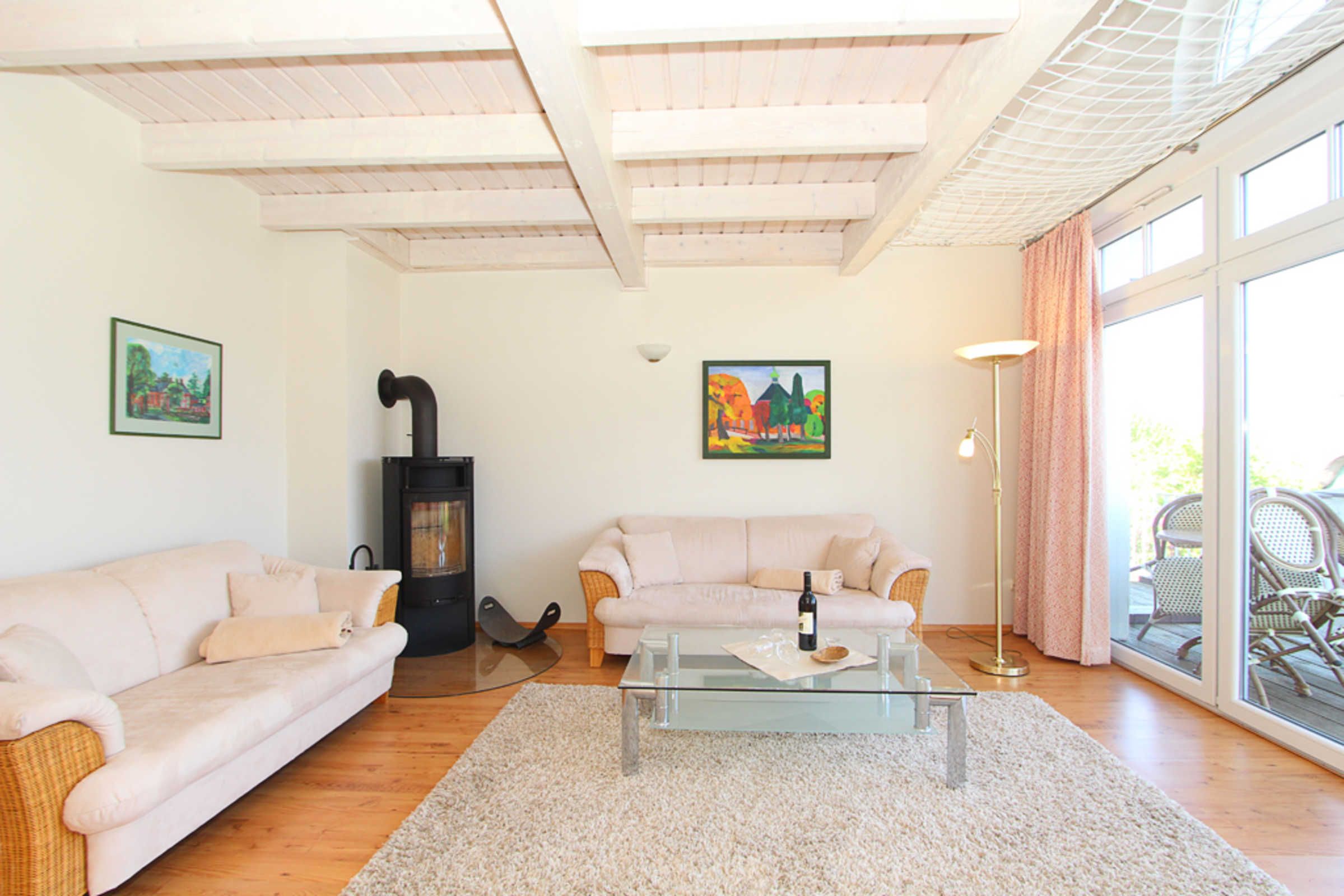 Der große offene Wohnbereich mit bequemer Couchecke und modernem Flatscreen-TV und DVD-Player in der ersten Wohnebene bietet zusätzlich einen schönen Kamin sowie eine große Fensterfront zur Ostsee. Von hier aus begehen Sie auch direkt den möblierten Ost-Balkon. Somit genießen Sie einen fantastischen Ausblick aufs Meer. Die rote Couch kann als weitere Schlafmöglichkeit für 2 Gäste genutzt werden.