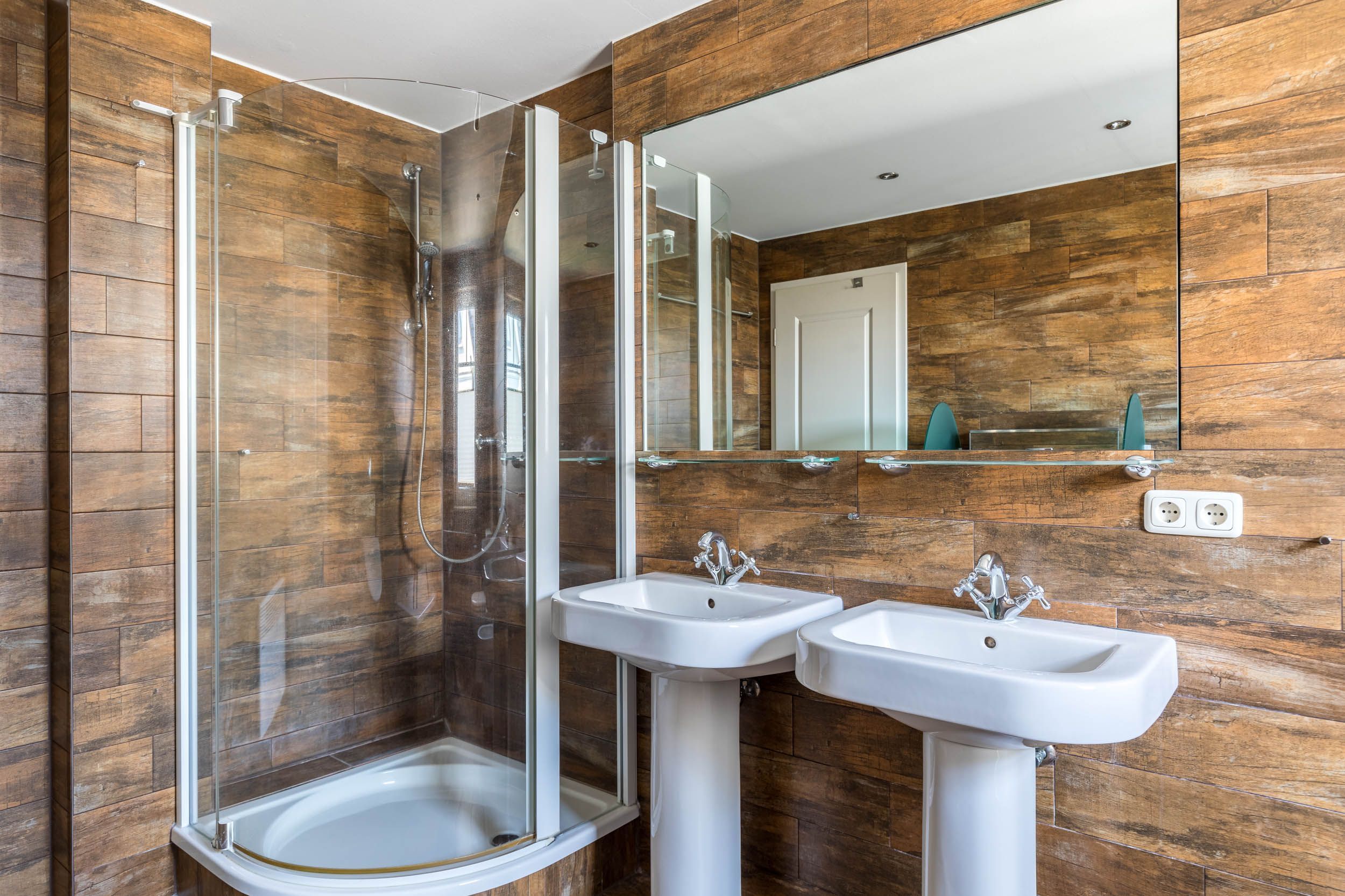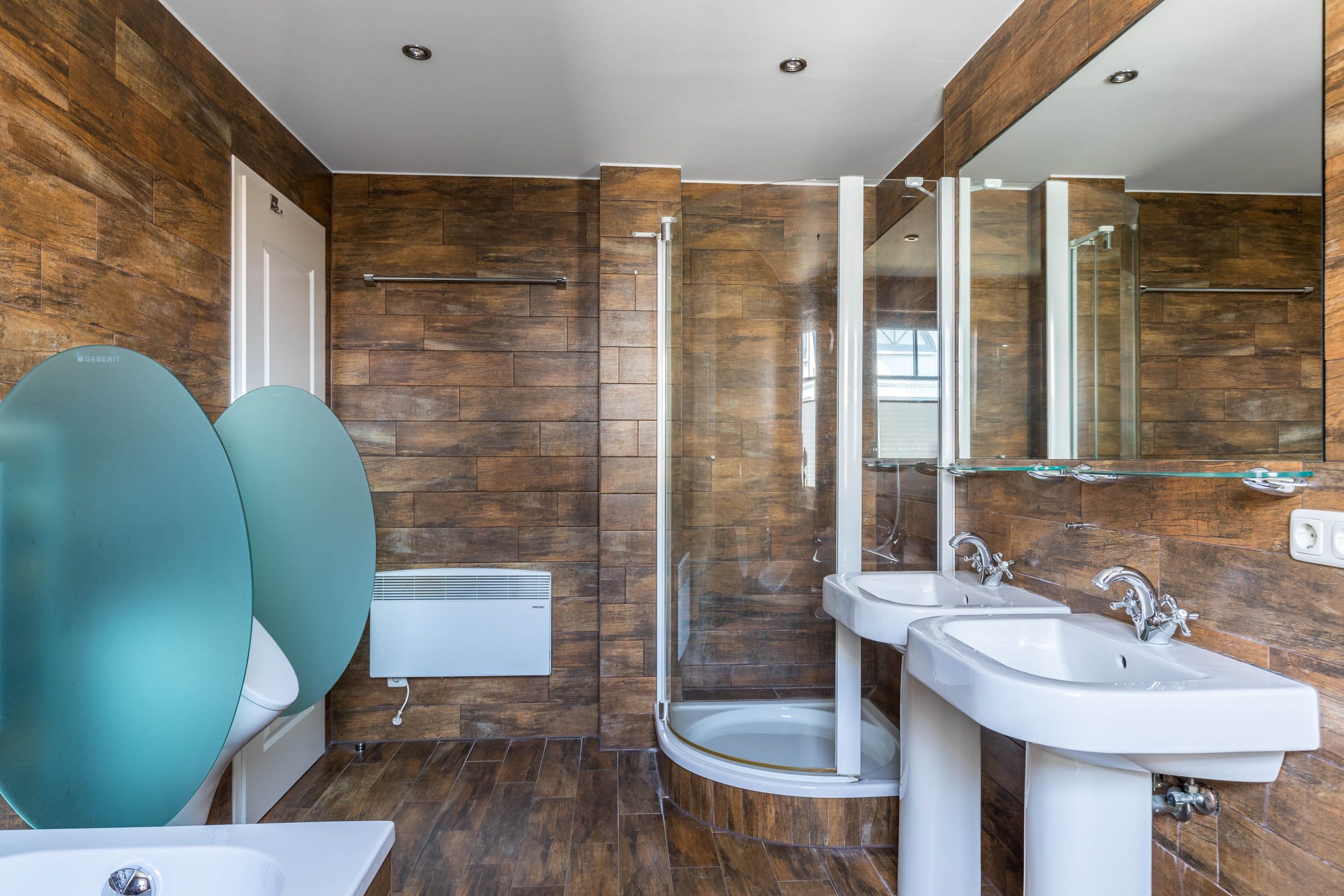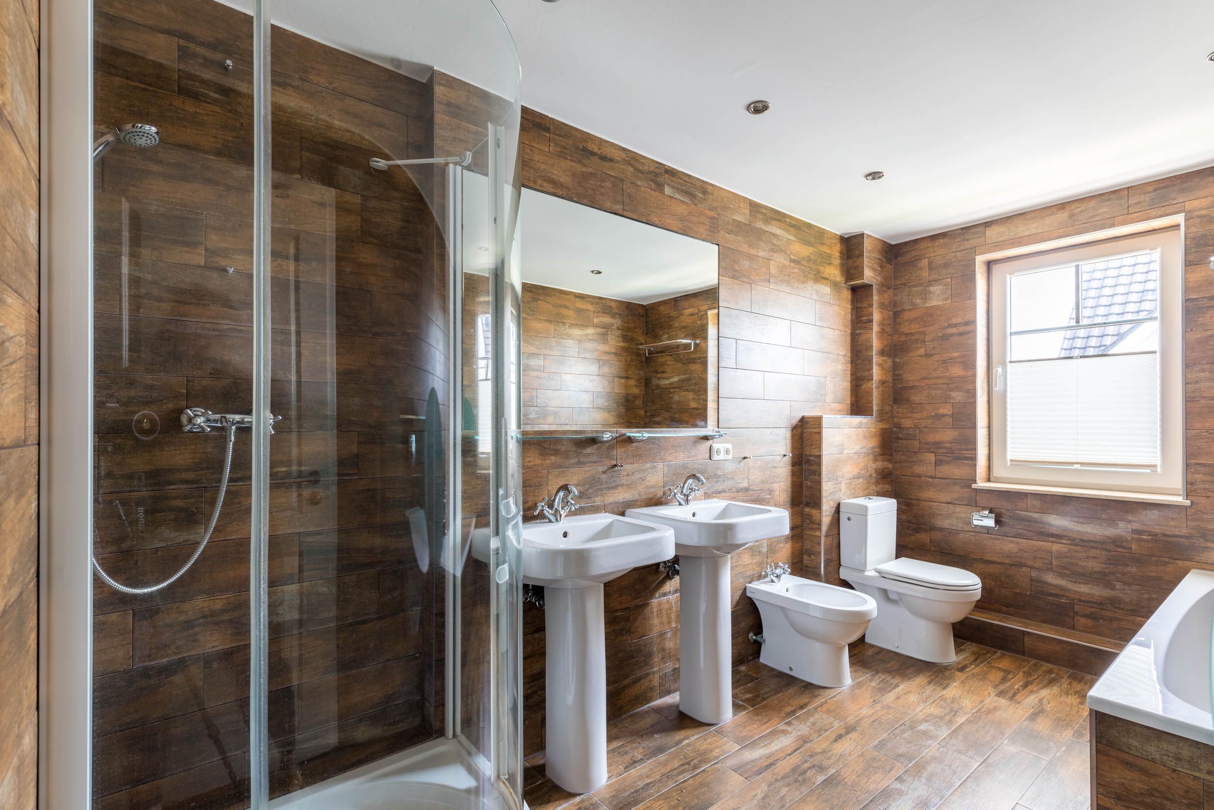 Das exklusiv geflieste Badezimmer mit Tageslicht, welches sich ebenfalls auf dieser Wohnebene befindet, bietet viel Komfort. Es ist mit Dusche, Badewanne, 2 Waschbecken, WC, Bidet und Pissoir ausgestattet.