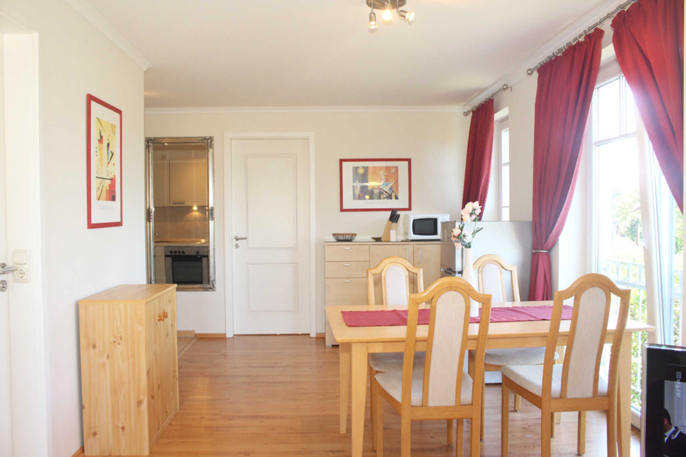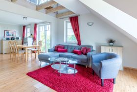 Der Wohnbereich in der ersten Wohnebene mit großer Fensterfront und der möblierte Balkon Richtung Ostsee (Osten) sorgen für einen tollen Ausblick aufs Meer. Die edle Couchecke lädt zum Relaxen ein und der Flatscreen-TV kann für Unterhaltung sorgen.