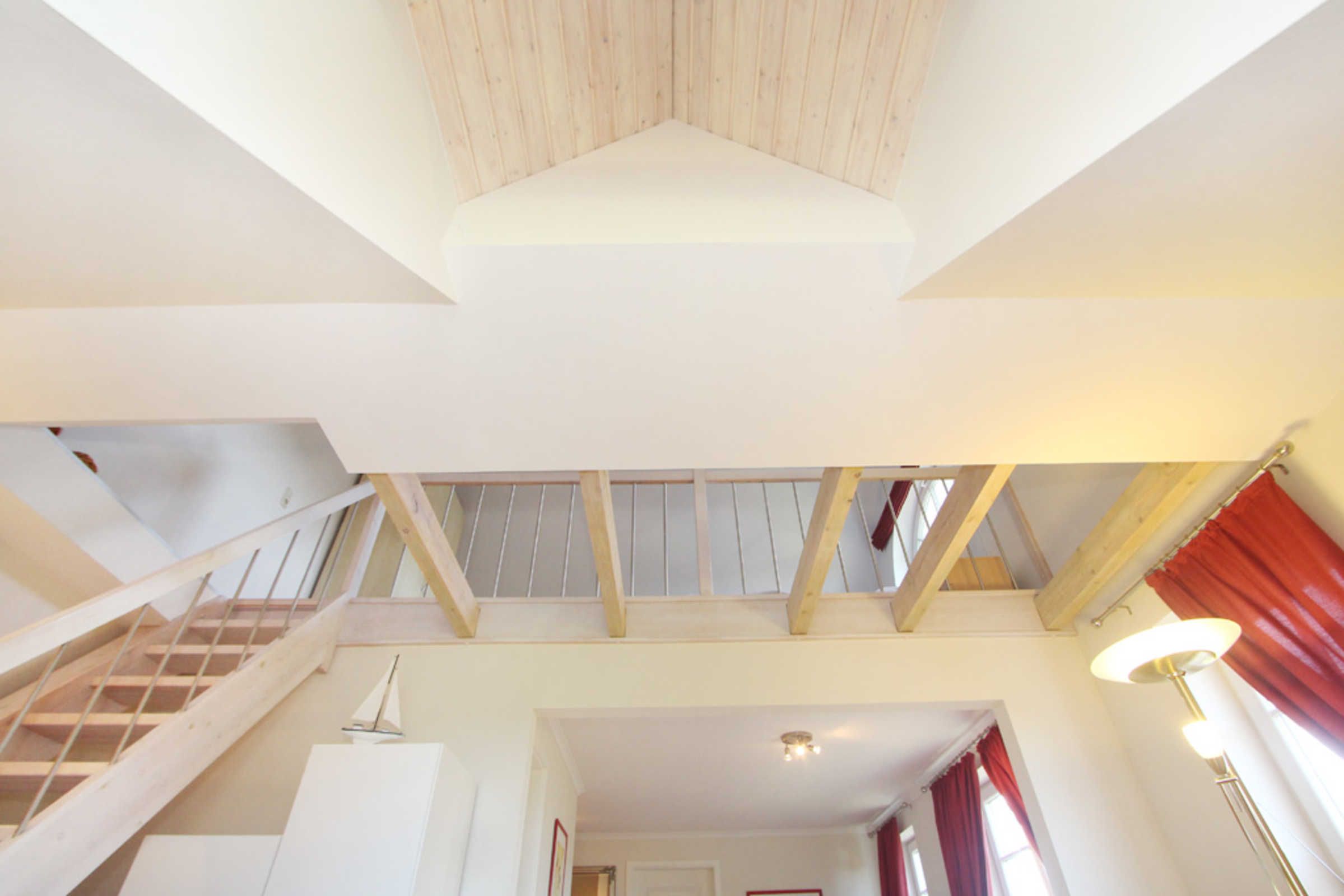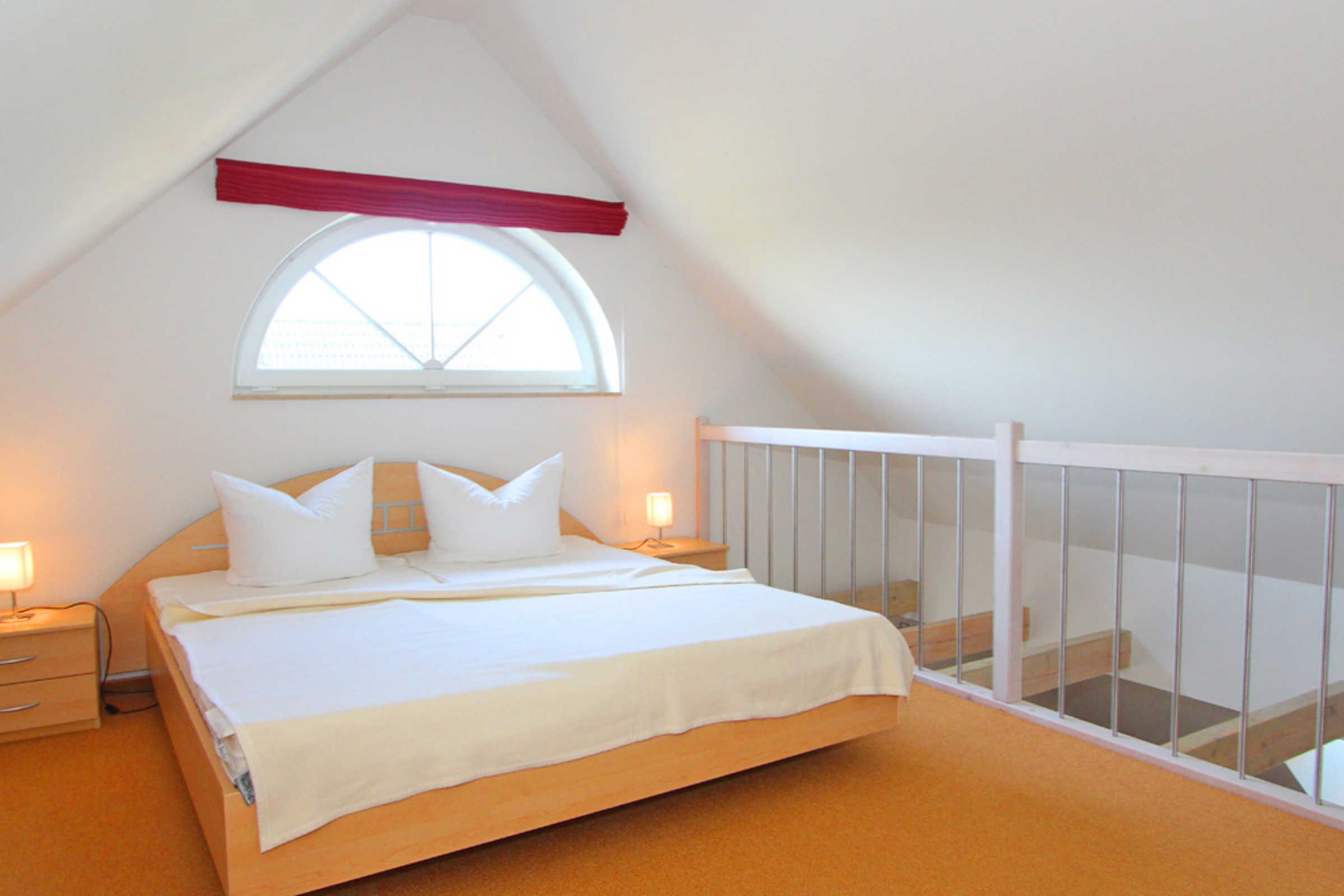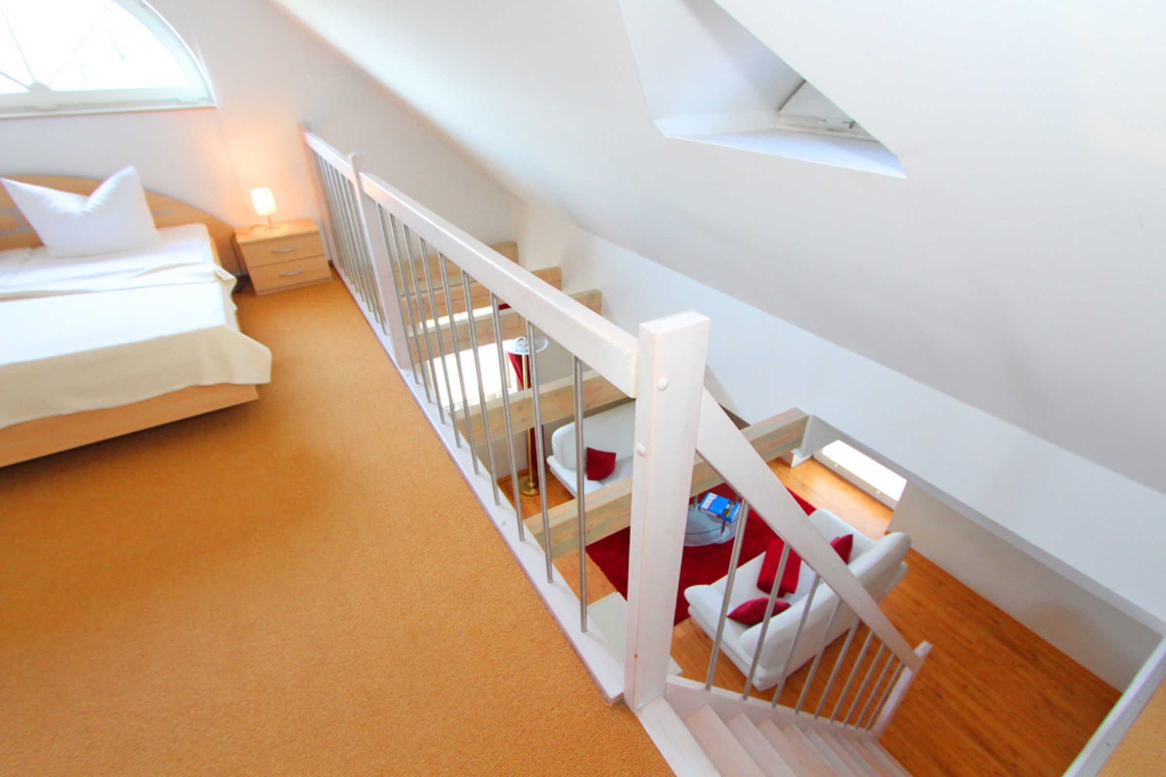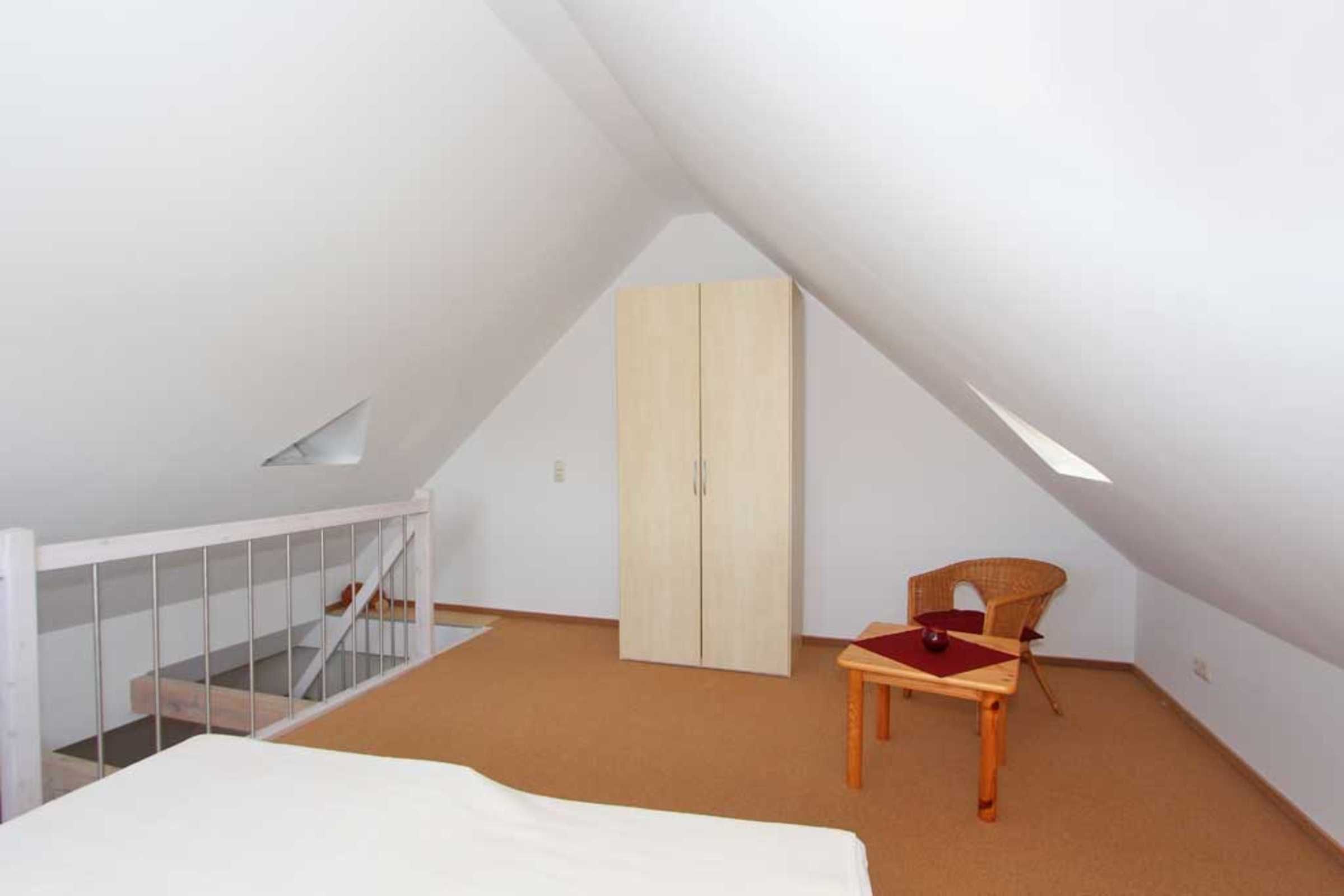 Vom Wohnbereich aus gelangen Sie dann über eine Treppe in die zweite Wohnebene, dem Dachgeschoss. Hier erwartet Sie eine offene Schlafgalerie mit einem Doppelbett und einem kleinen Kleiderschrank.