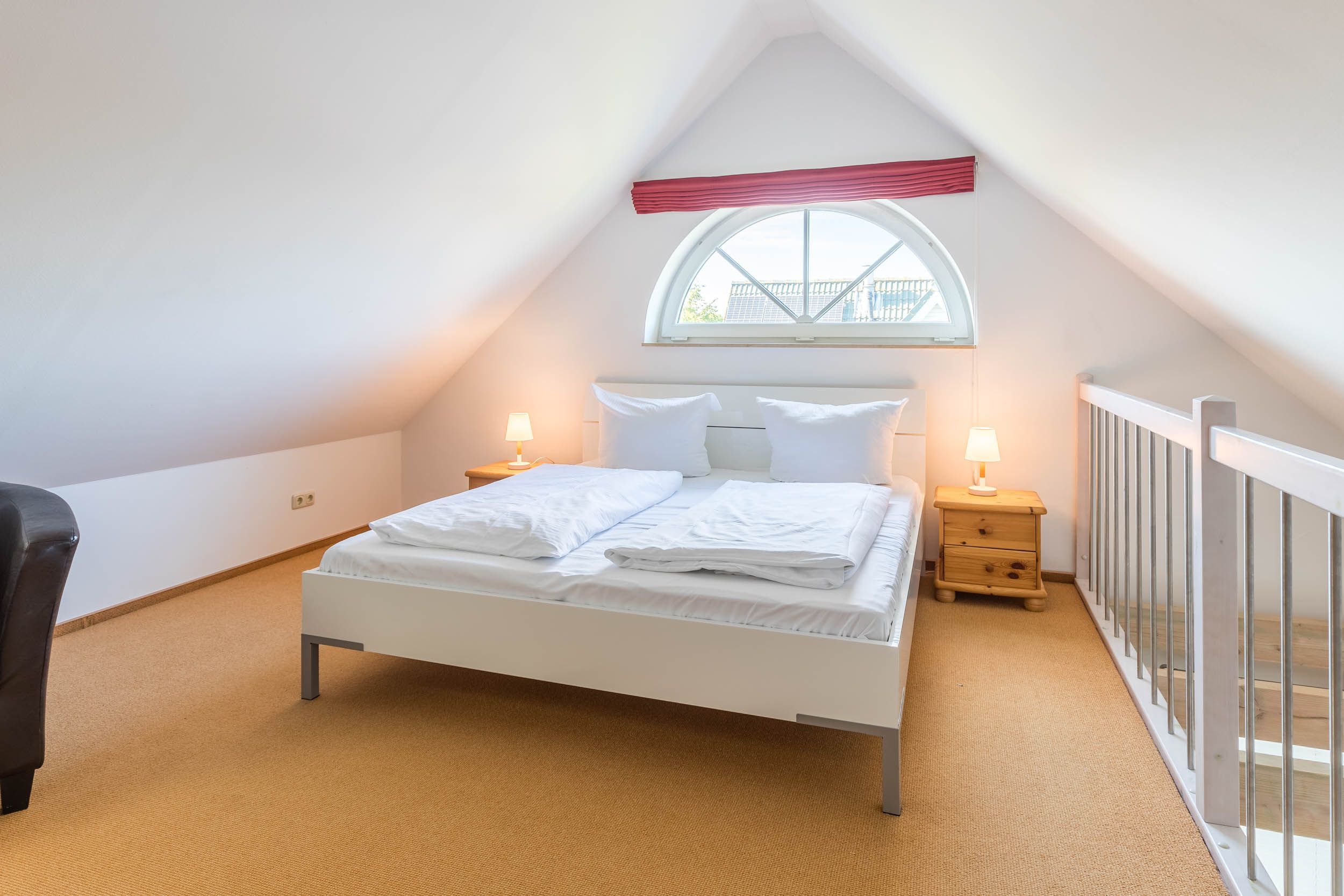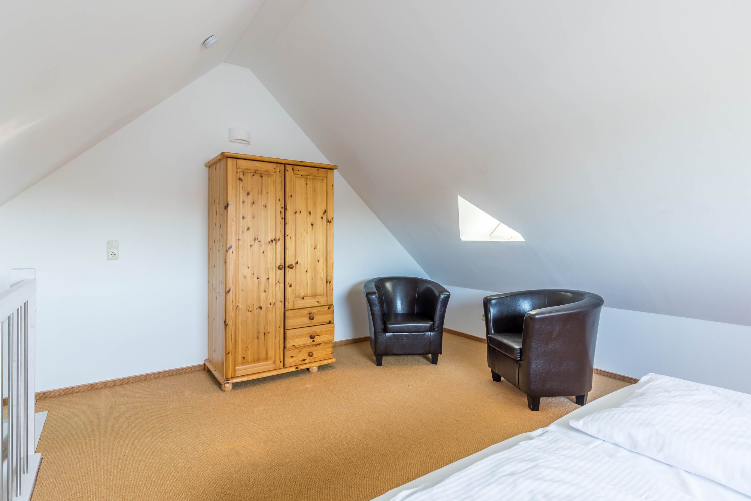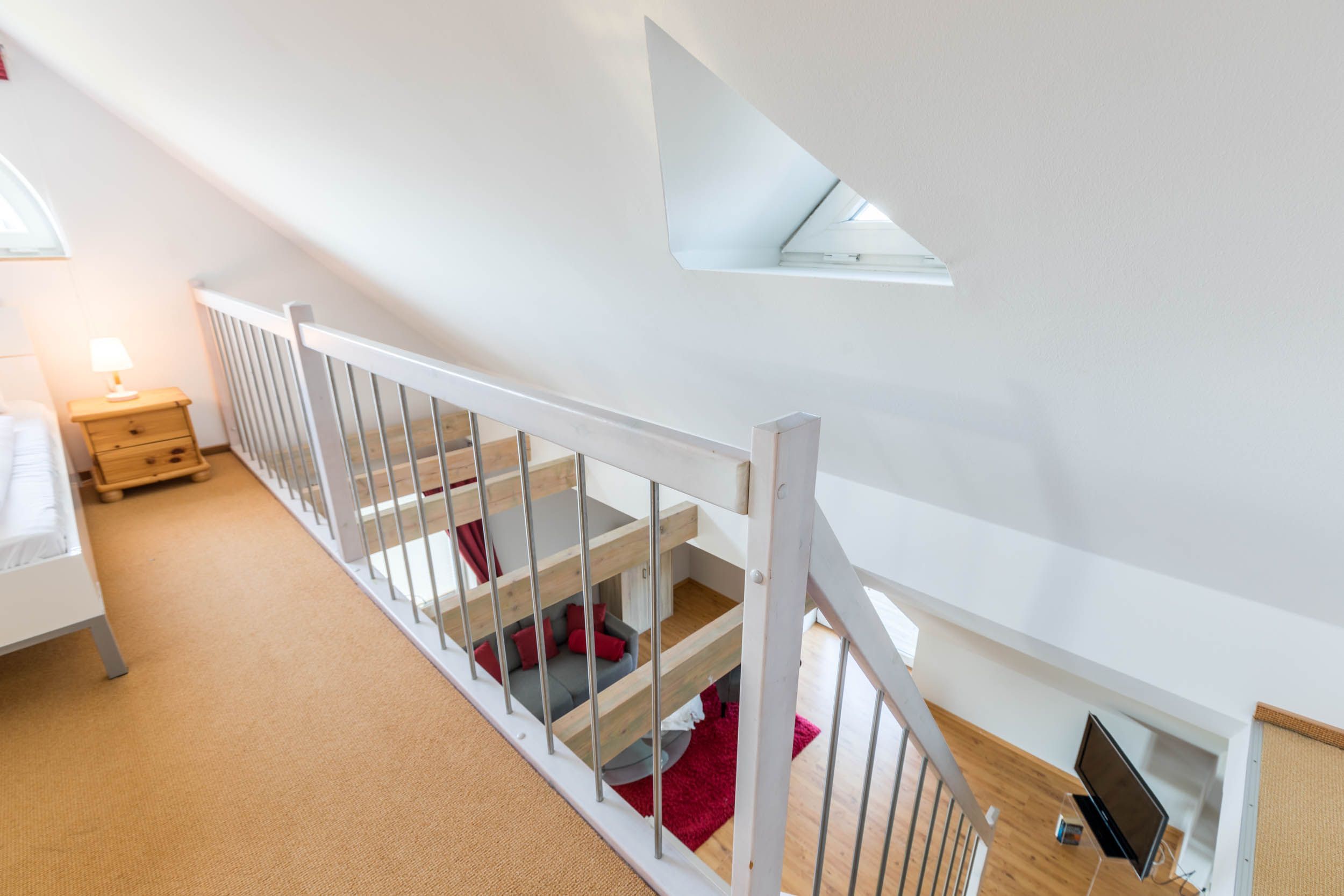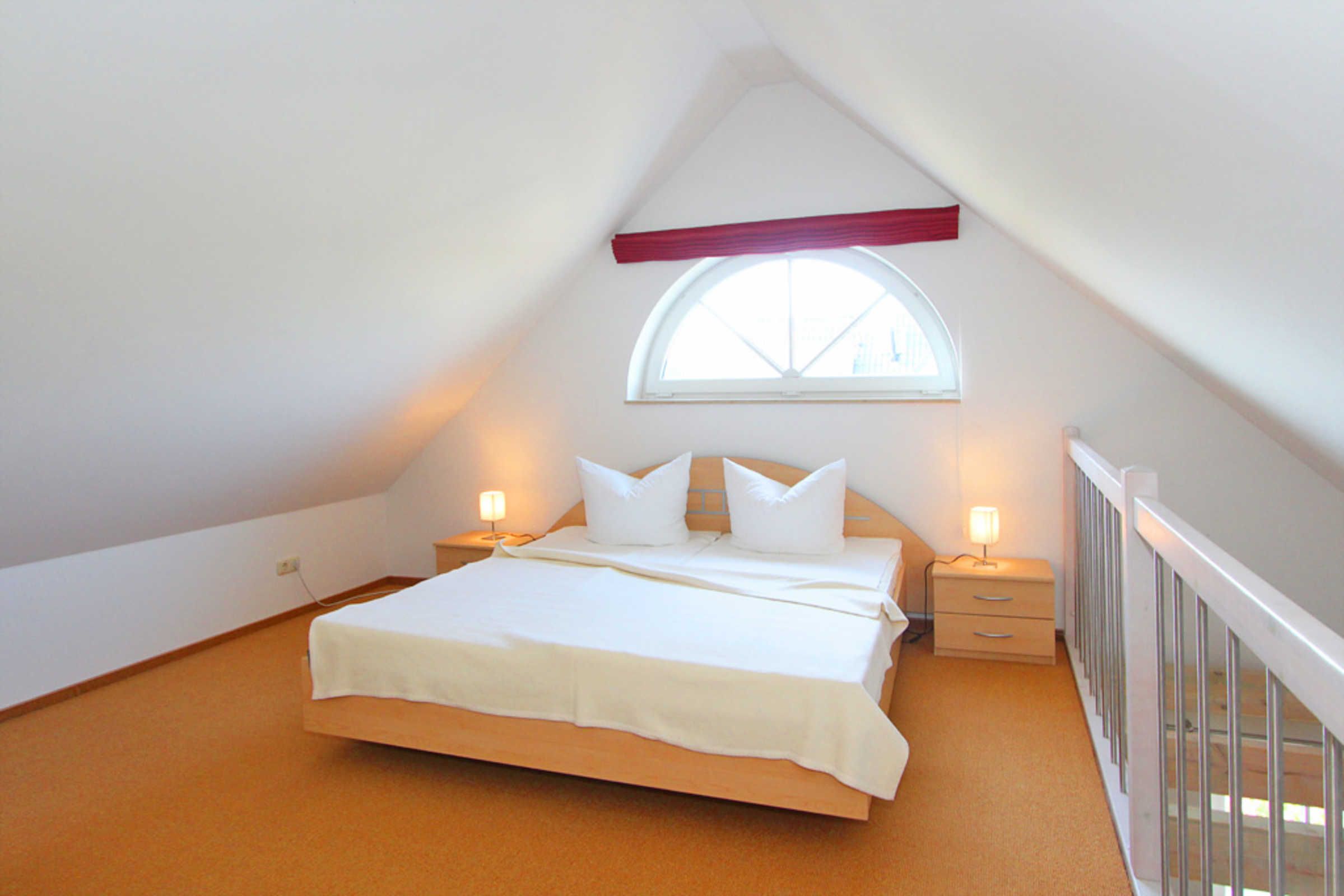 Vom Wohnbereich aus gelangen Sie dann über eine Treppe in die zweite Wohnebene, dem Dachgeschoss. Hier erwartet Sie eine offene Schlafgalerie mit einem Doppelbett und einem kleinen Kleiderschrank.