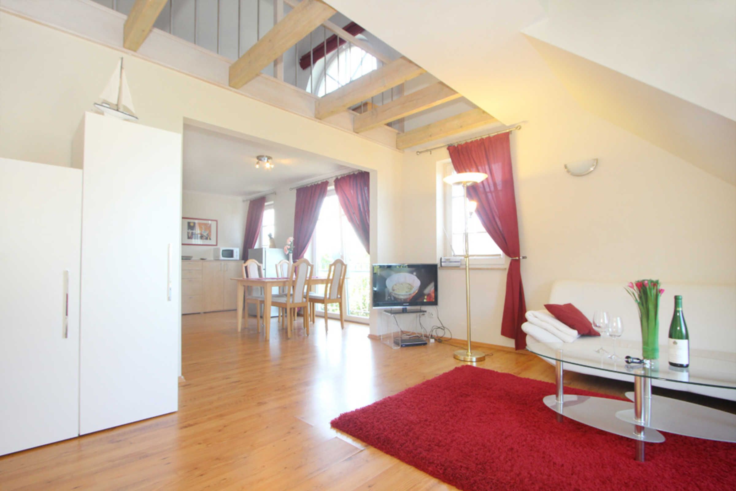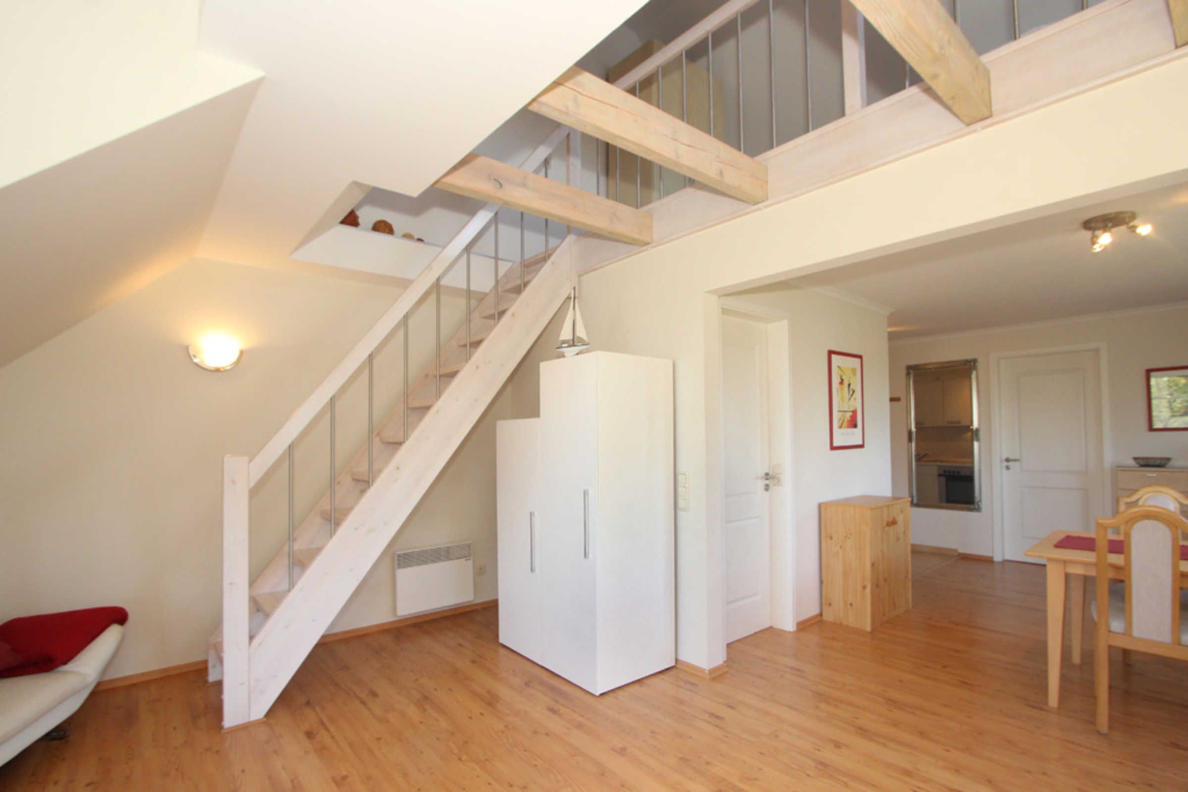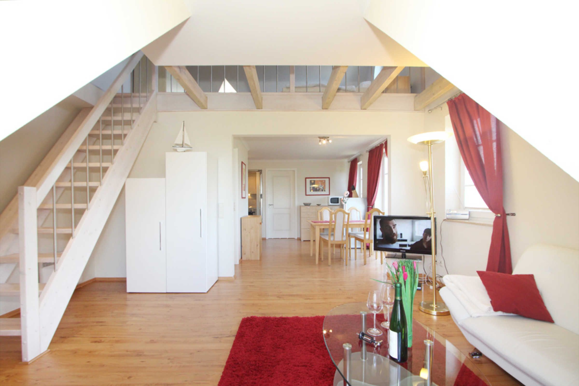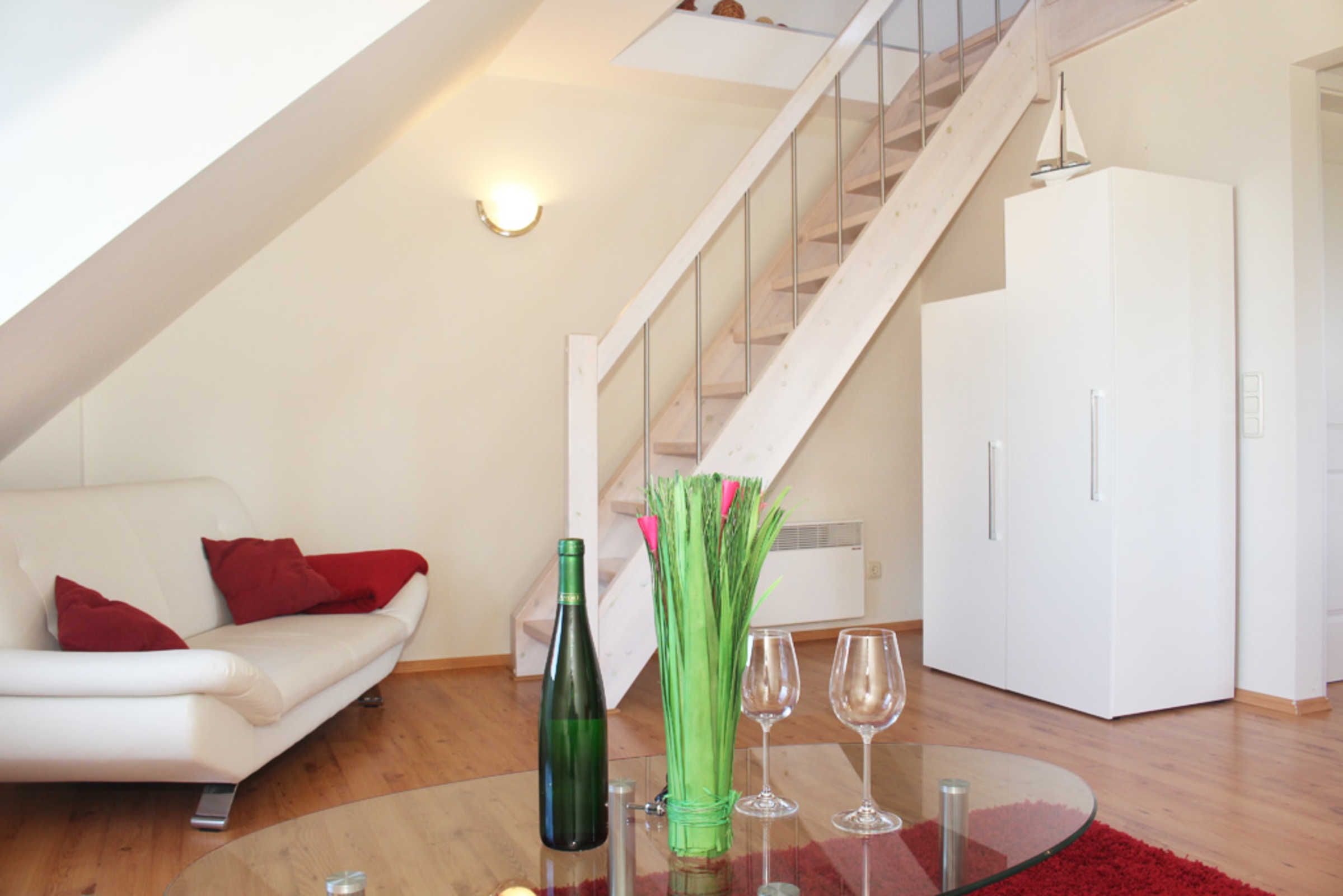 Die schöne 3-Zimmer-Ferienwohnung für max. 4 Gäste befindet sich im 1.OG und erstreckt sich mit ihren ca. 60qm Wohnfläche über 2 Ebenen.