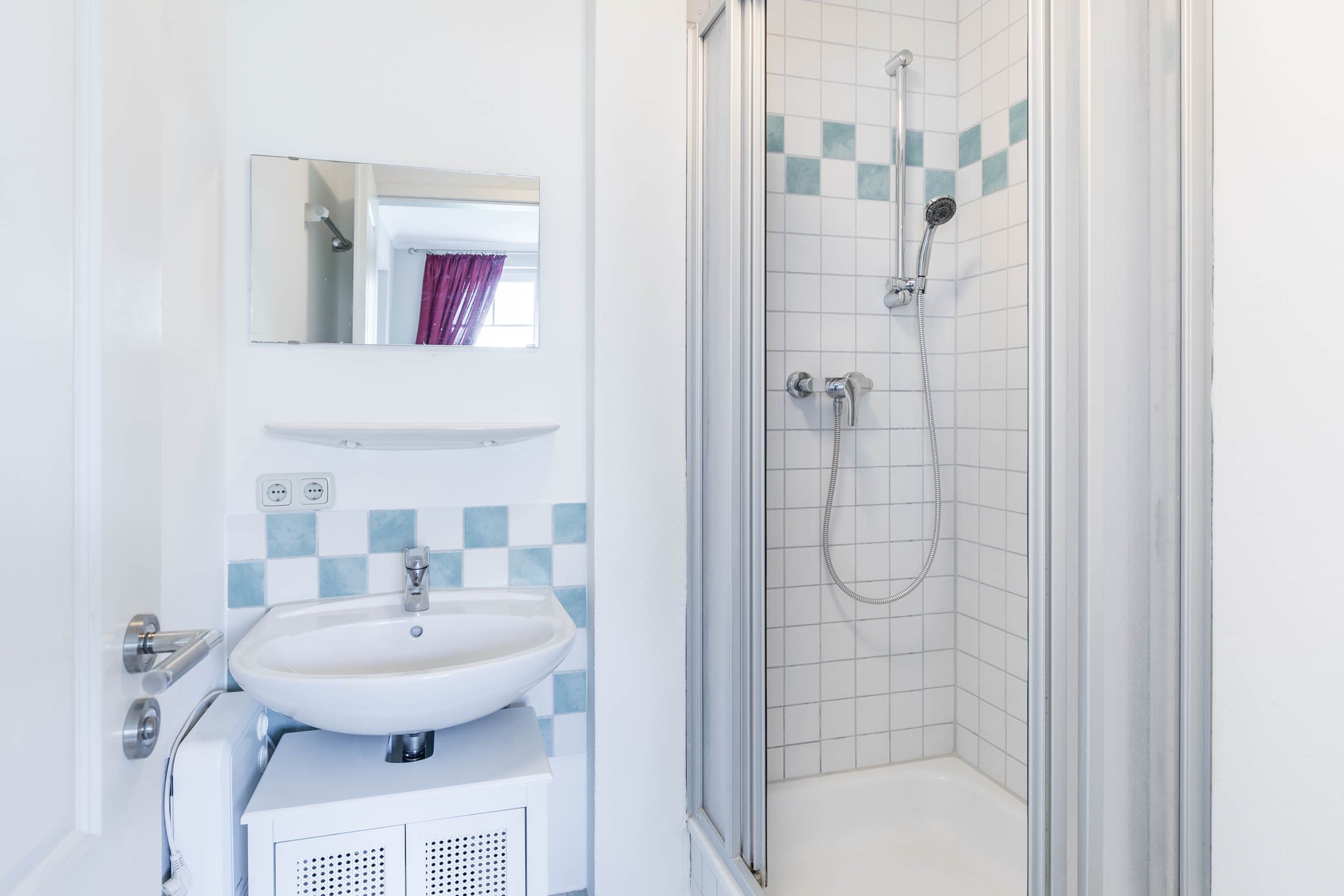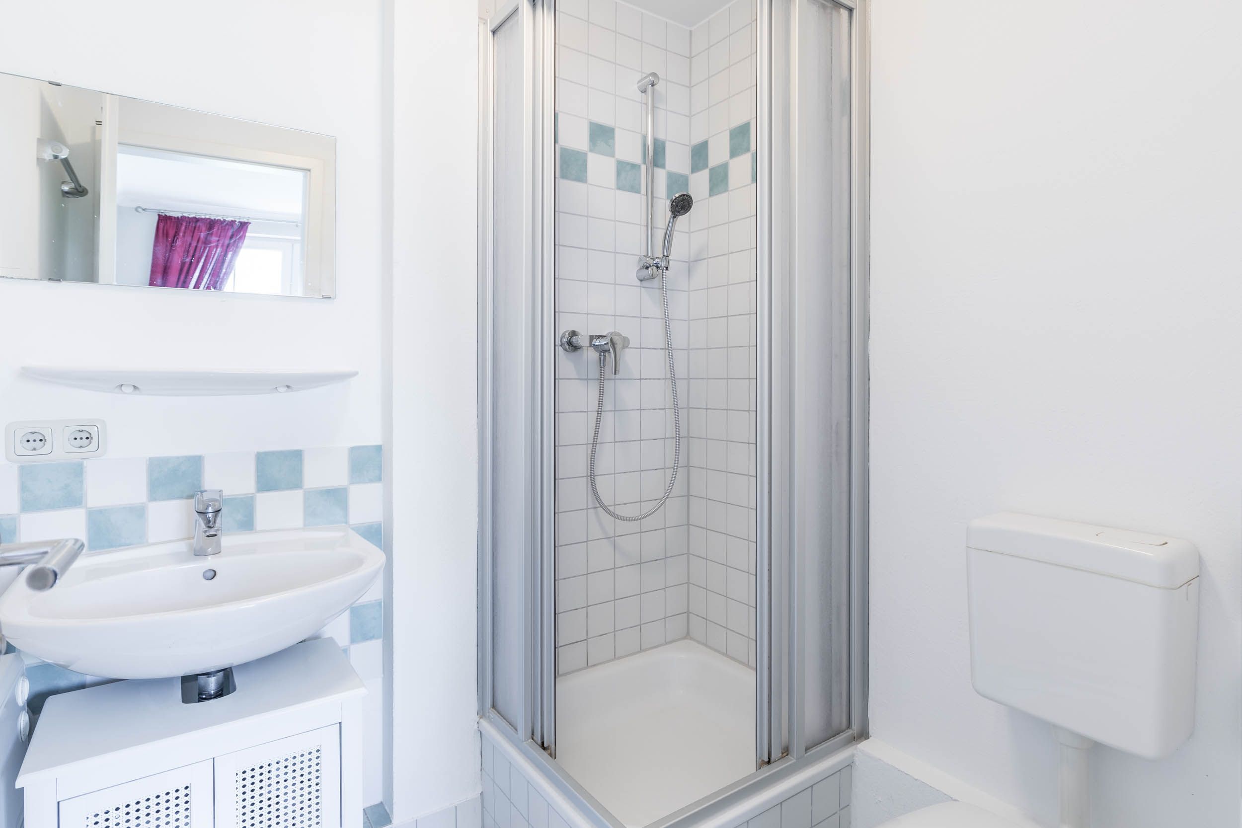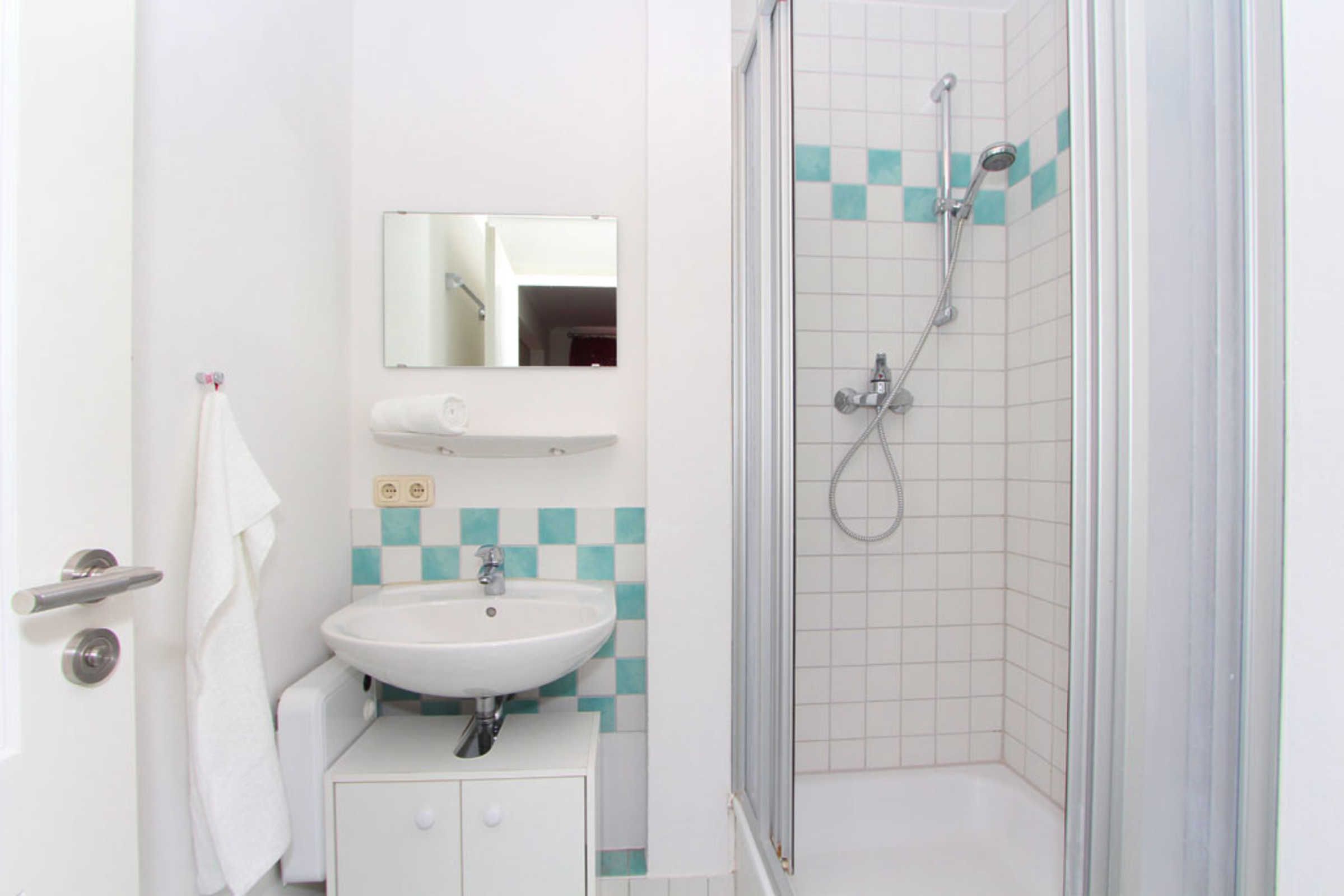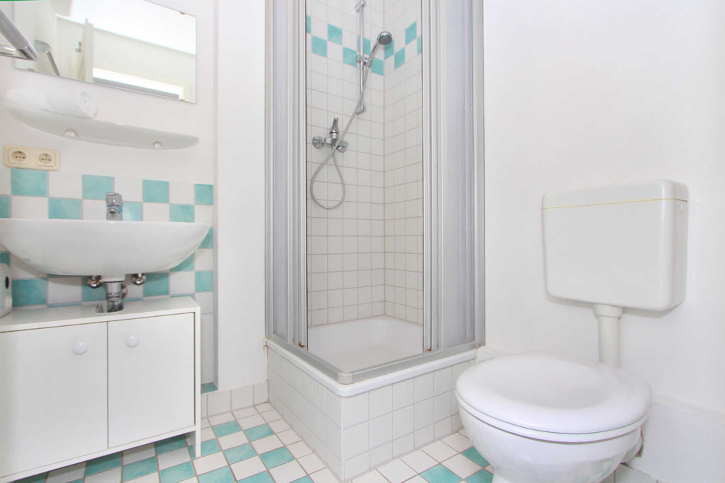 Ebenso finden Sie im unteren Wohnbereich das Bad mit Tageslicht, welches mit Dusche, WC und Waschbecken ausgestattet ist.