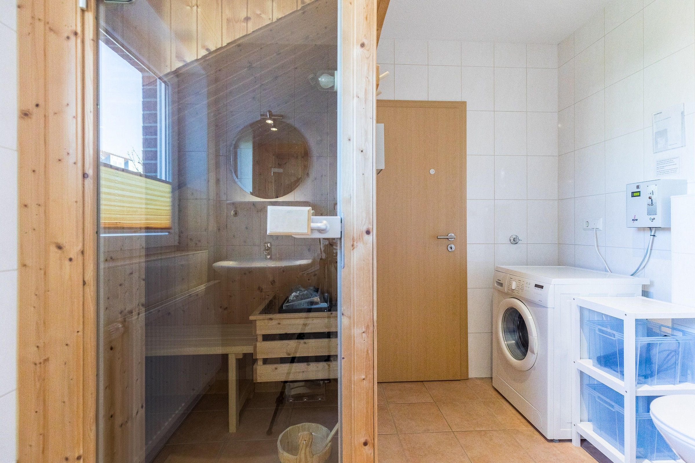 Das Bad mit Tageslicht ist mit einer ebenerdigen Dusche, WC und Münz-Waschmaschine ausgestattet. Ebenso finden Sie hier eine Sauna, welche Sie gern jederzeit gegen Gebühr nutzen können.