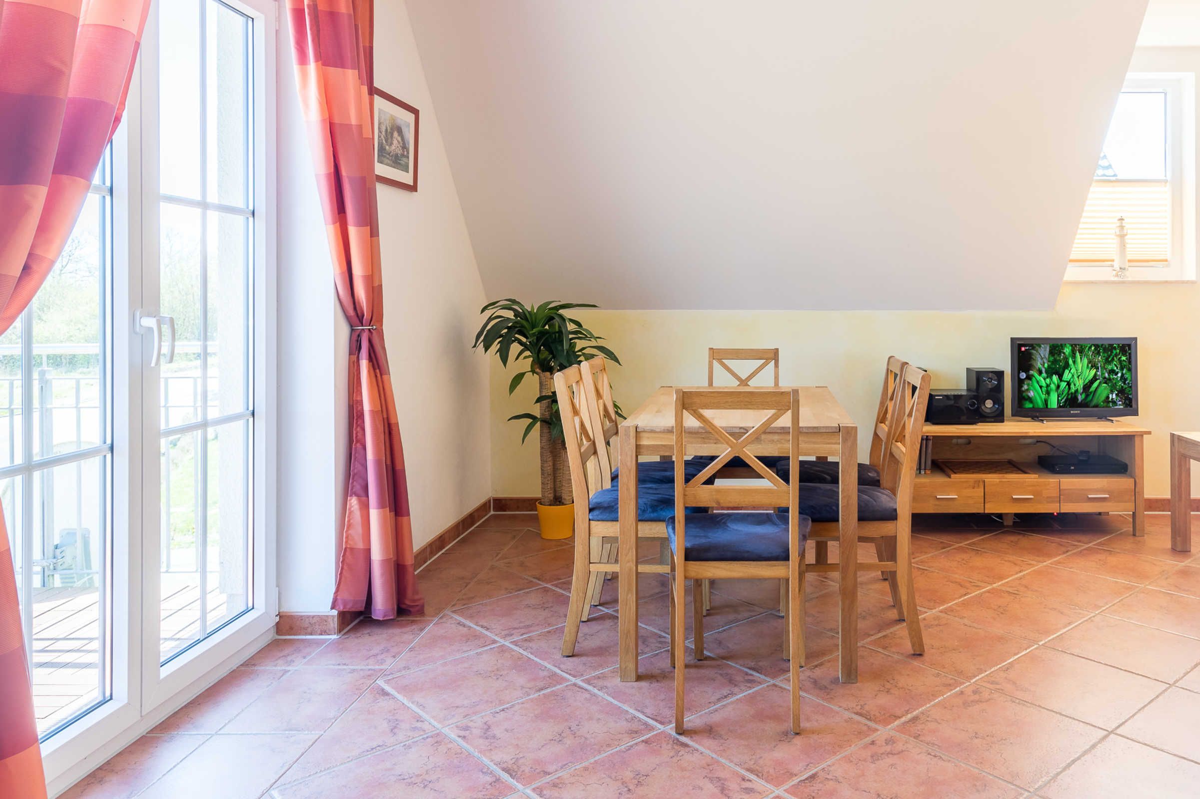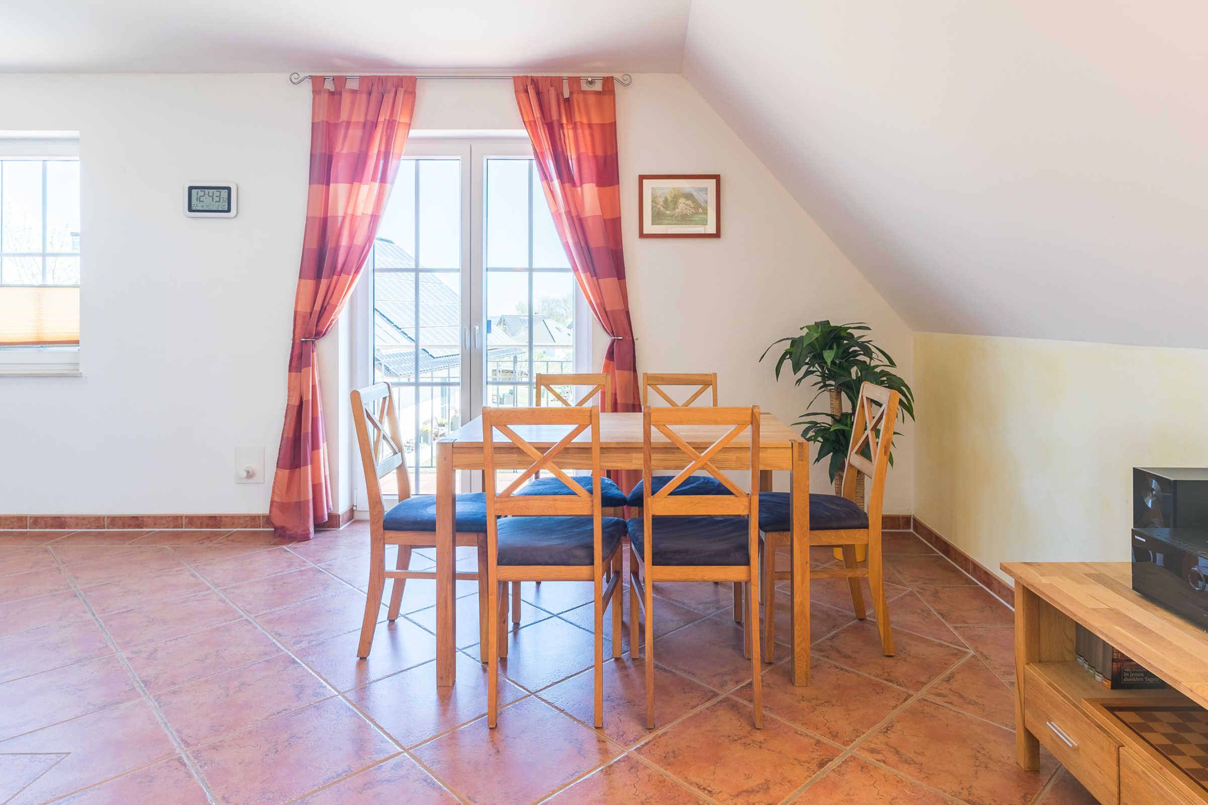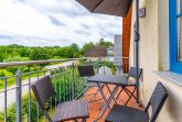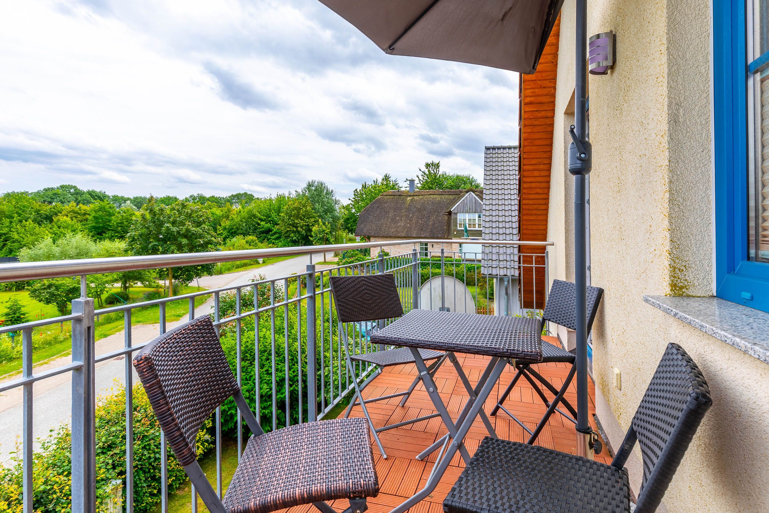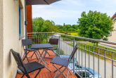 Vom gemütlich eingerichteten Wohn-/Esszimmer gelangen Sie auf den großen möblierten Ostbalkon und können sogar einen Blick auf die nah gelegene Ostsee erhaschen.