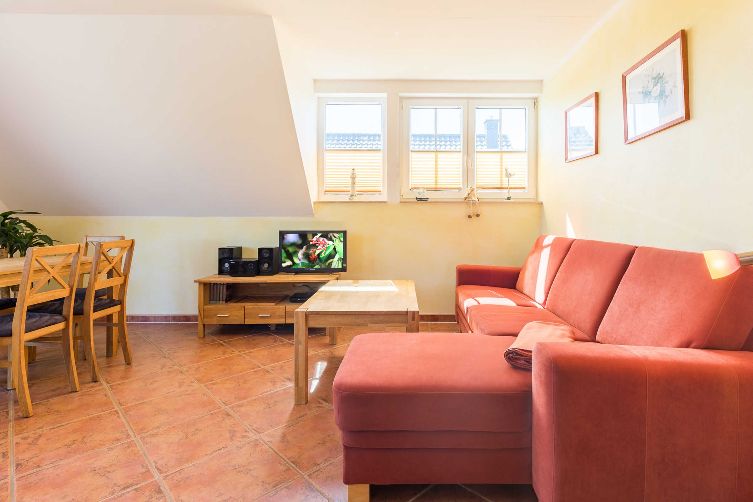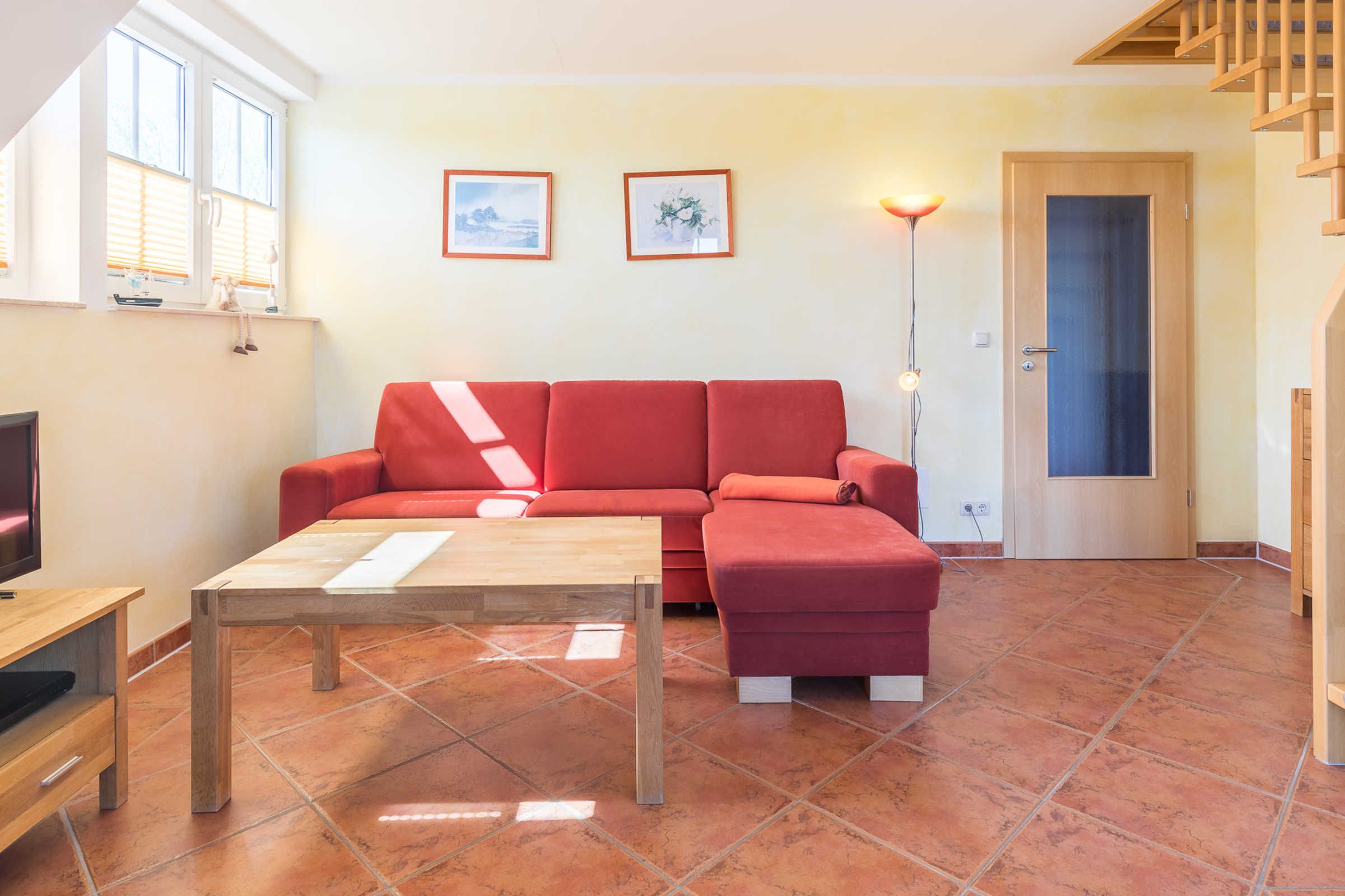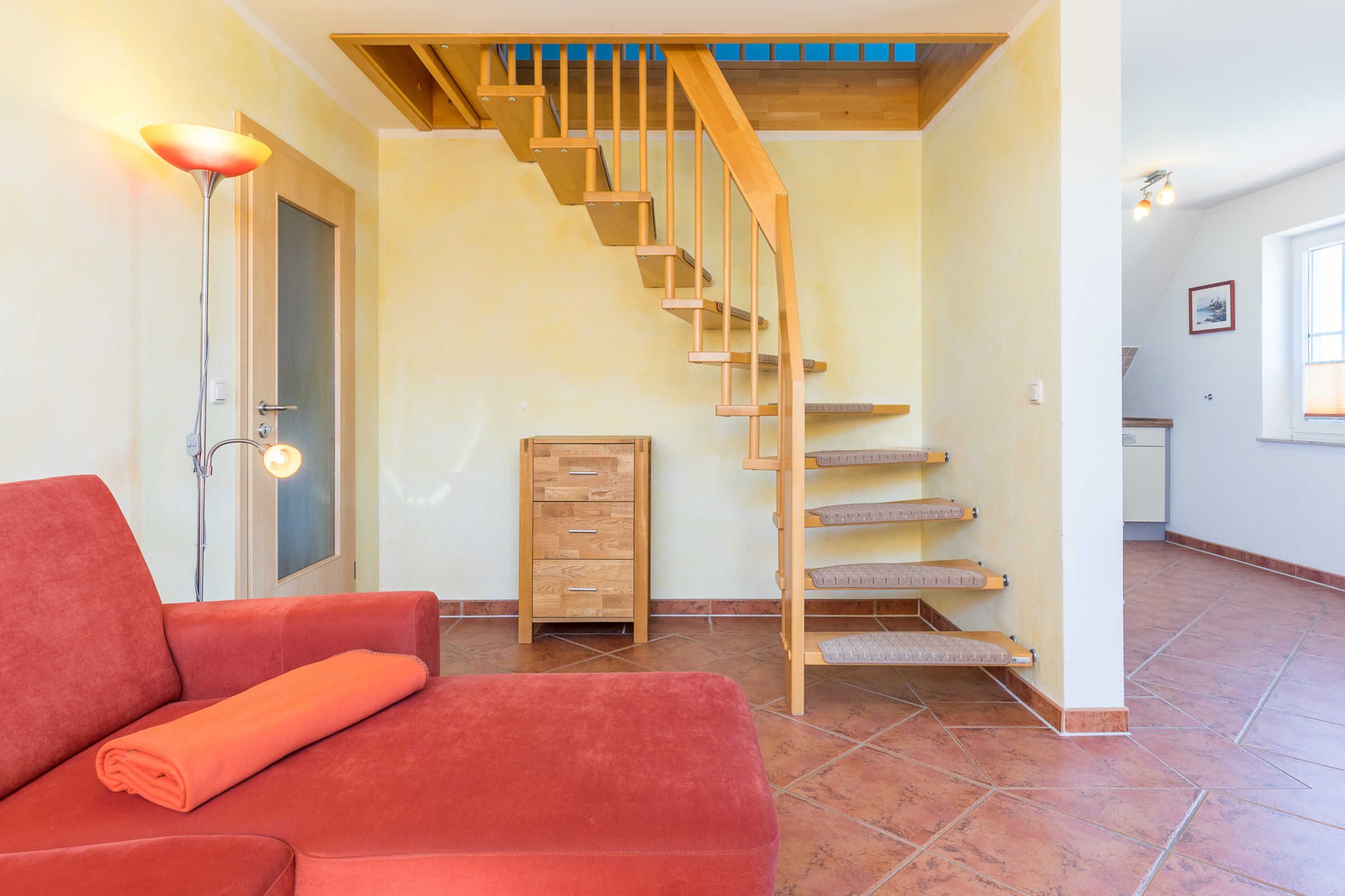 Die ca. 65 Quadratmeter der 3-Zimmer-Ferienwohnung im 1.OG verteilen sich auf 2 Wohnebenen und bietet eine familienfreundliche Ausstattung bis 4 Gäste + Kleinkind.