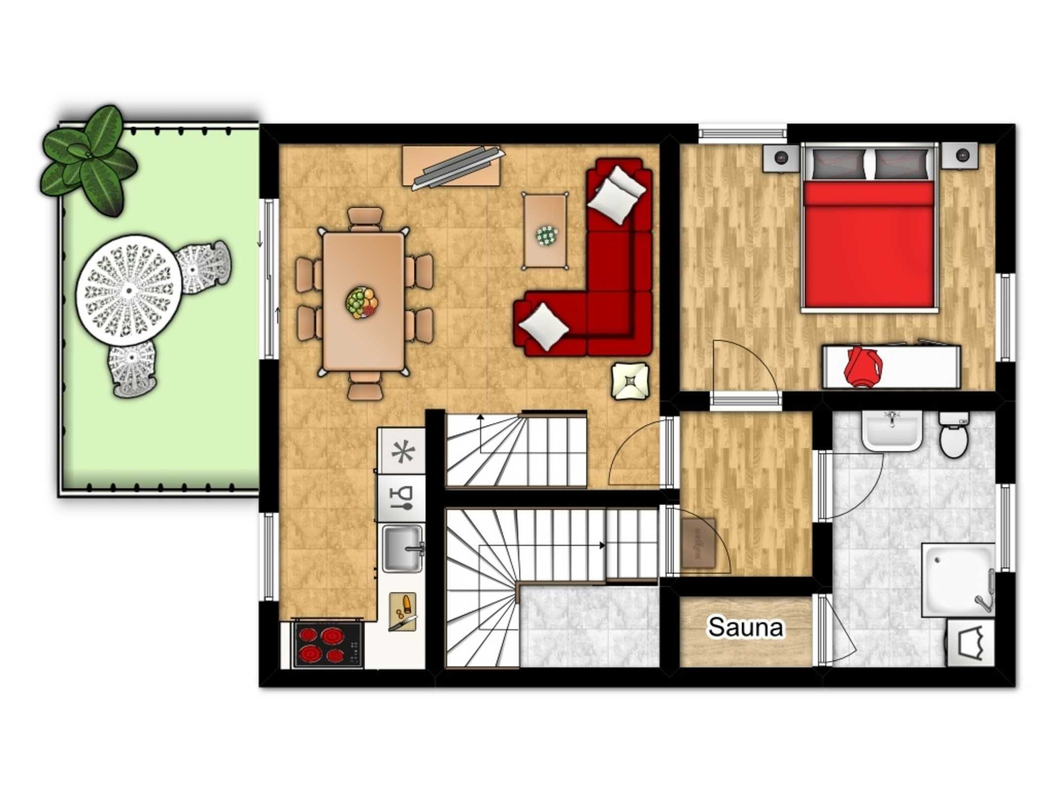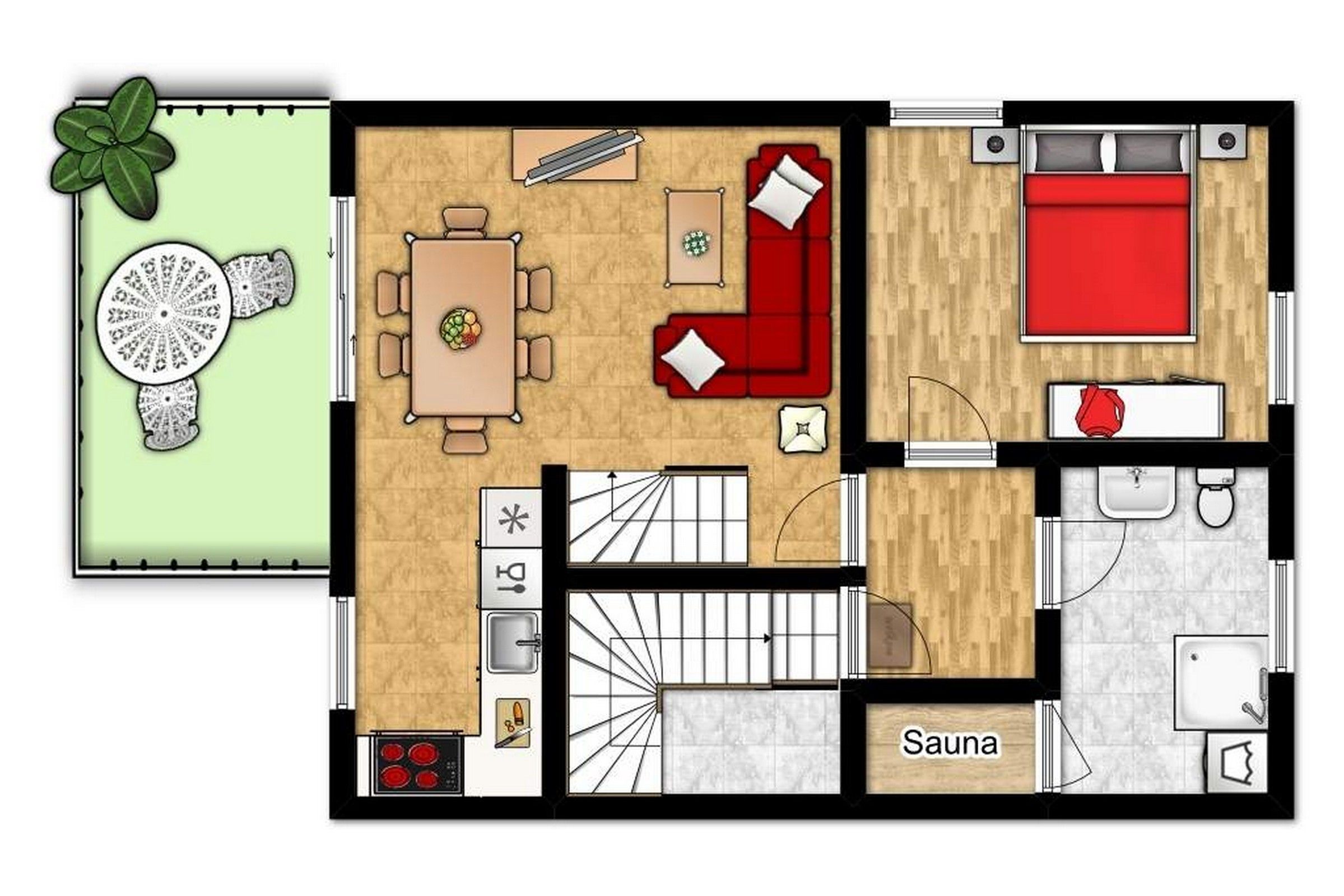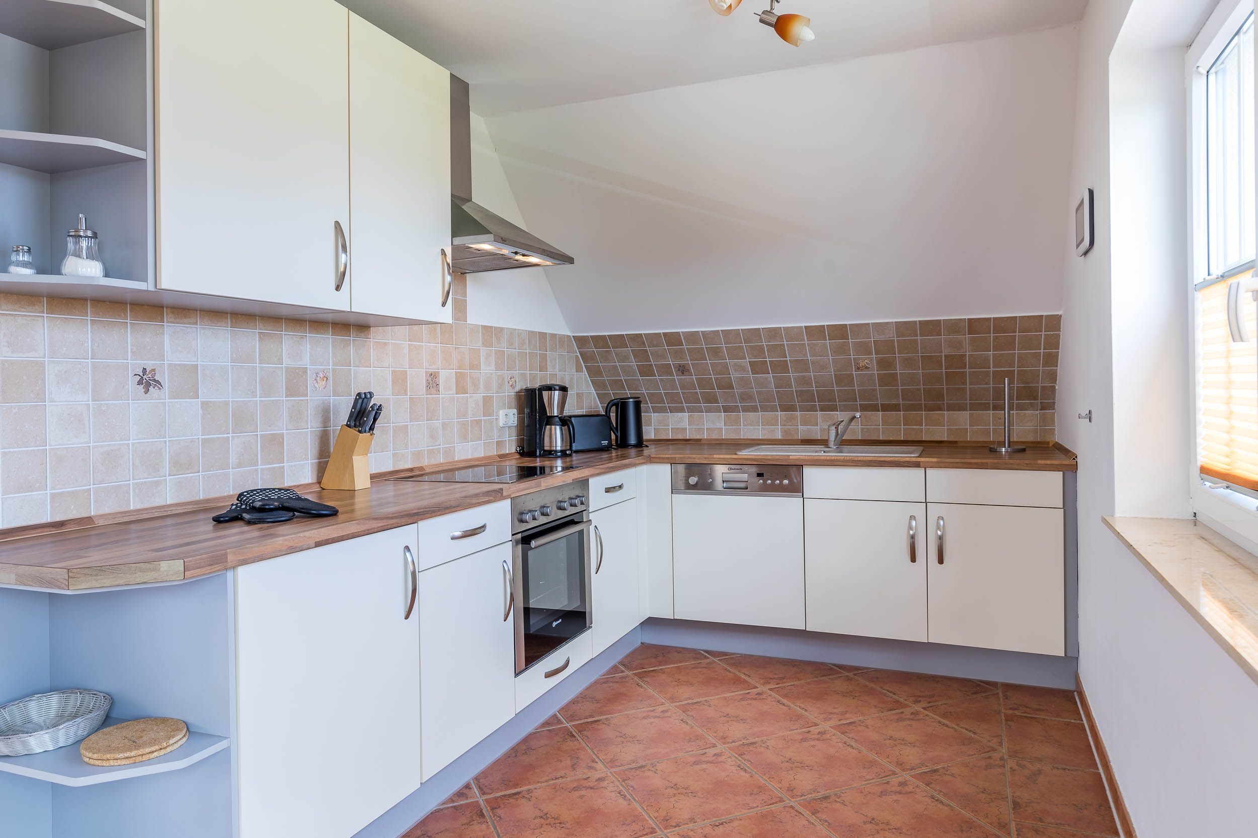 Die ca. 65 Quadratmeter der 3-Zimmer-Ferienwohnung im 1.OG verteilen sich auf 2 Wohnebenen und bietet eine familienfreundliche Ausstattung bis 4 Gäste + Kleinkind.