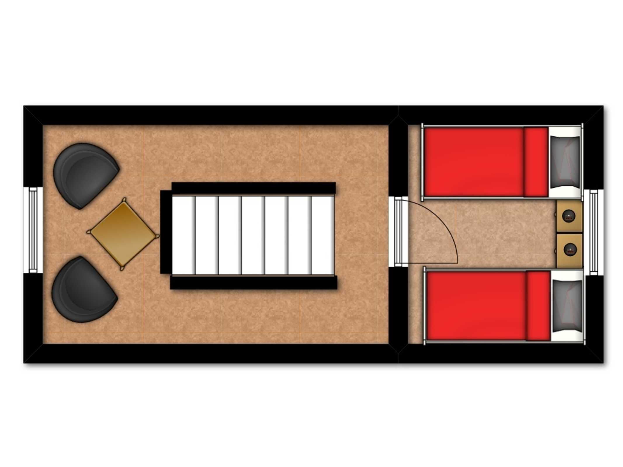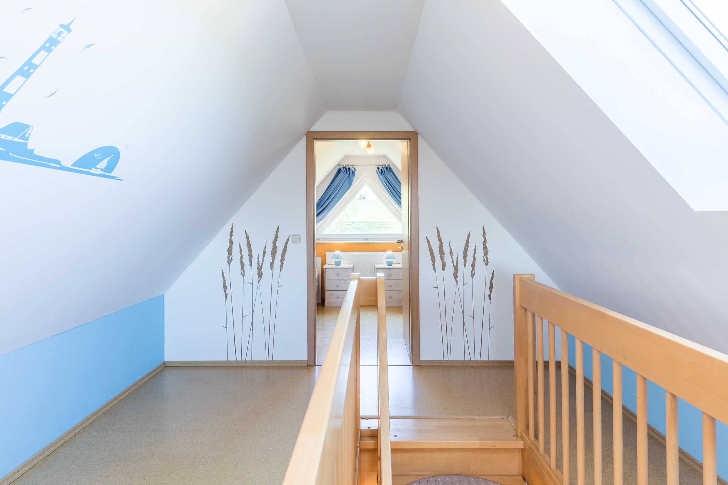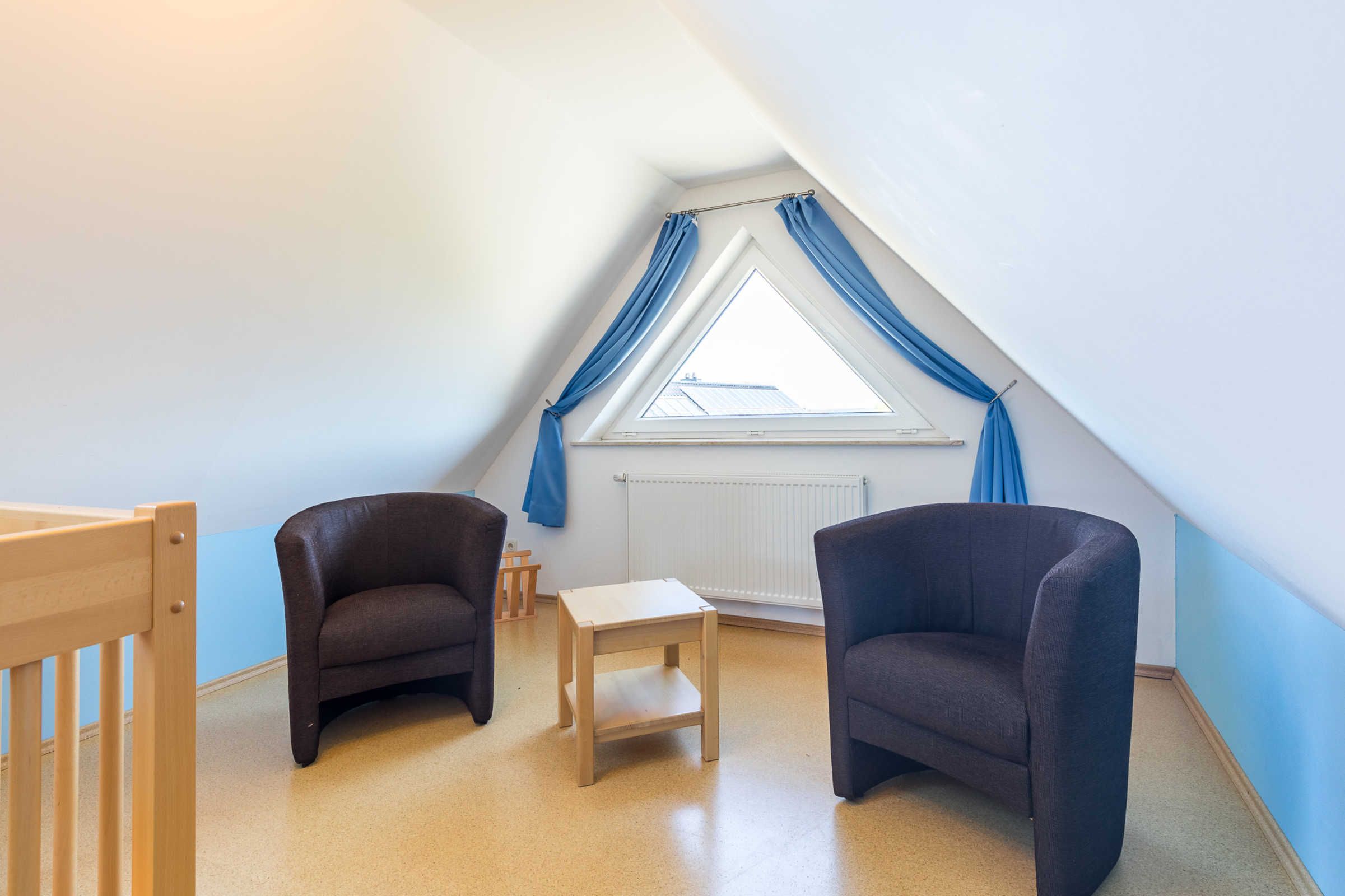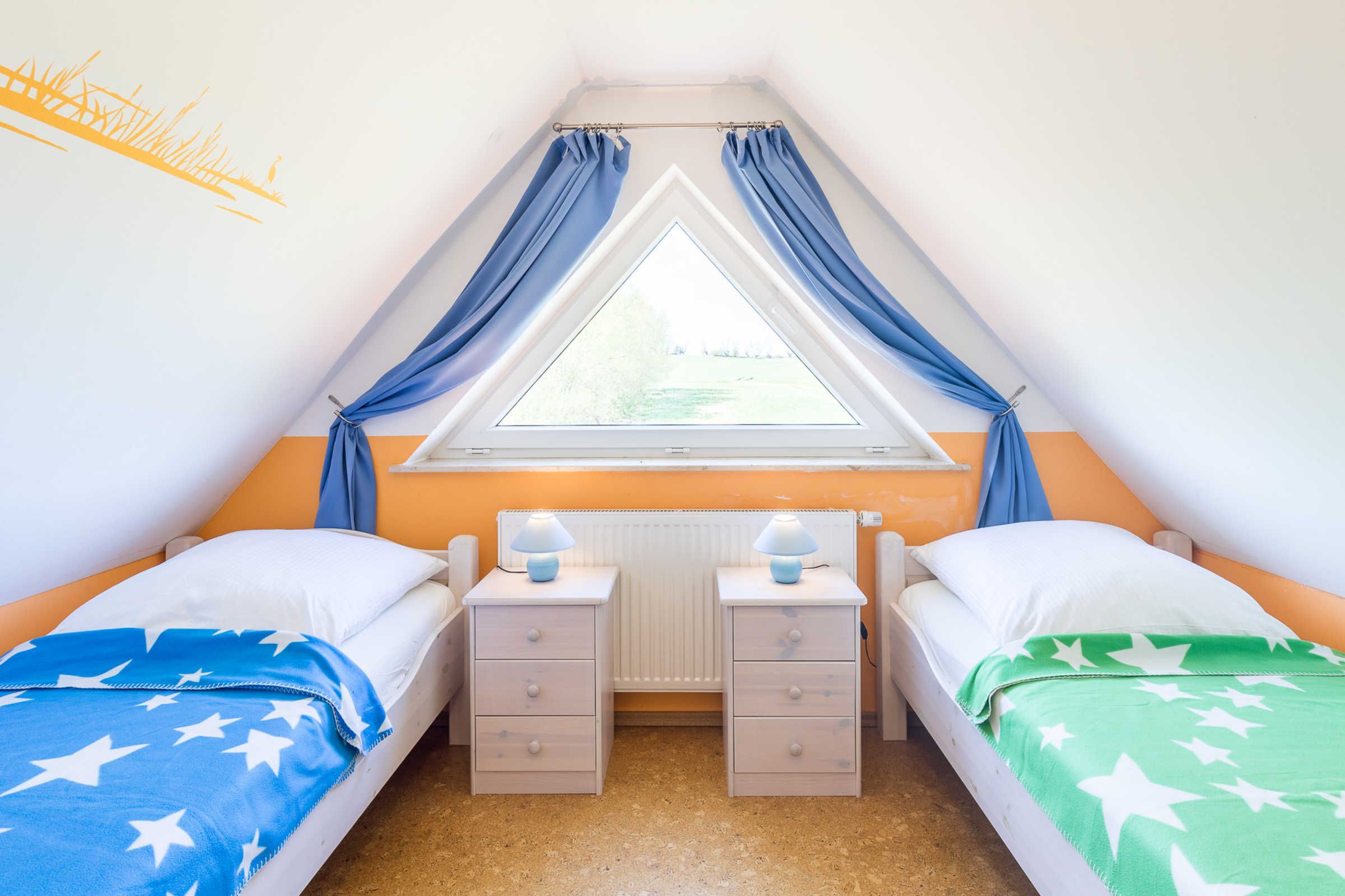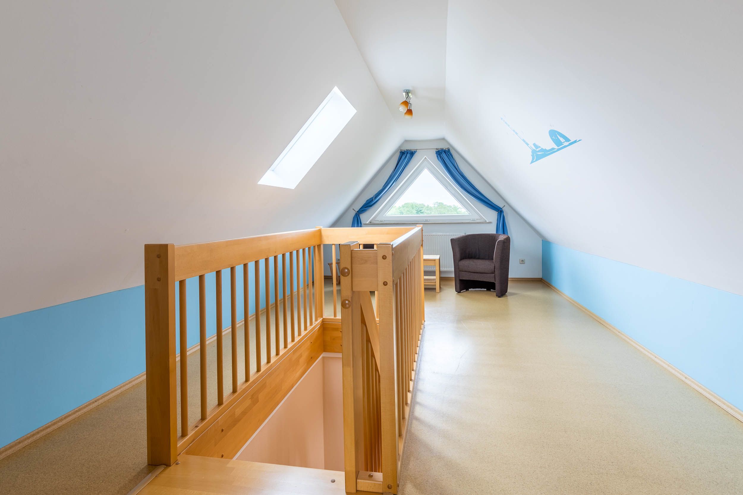 In der oberen Wohnebene, dem Dachgeschoss erreichen Sie über die offene Galerie mit kleiner Sitzecke das Kinder-/ Gästezimmer mit zwei bequemen Einzelbetten.