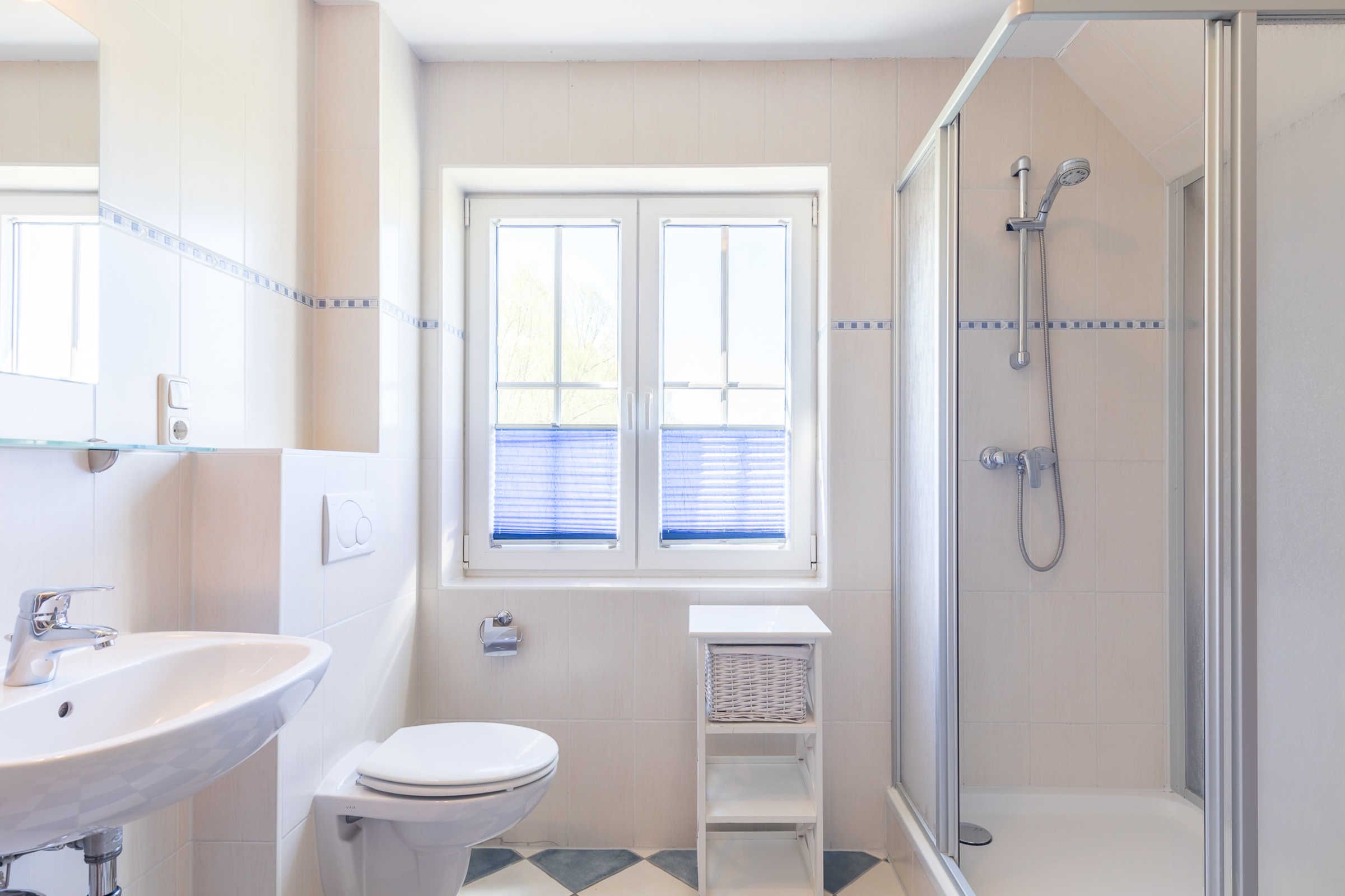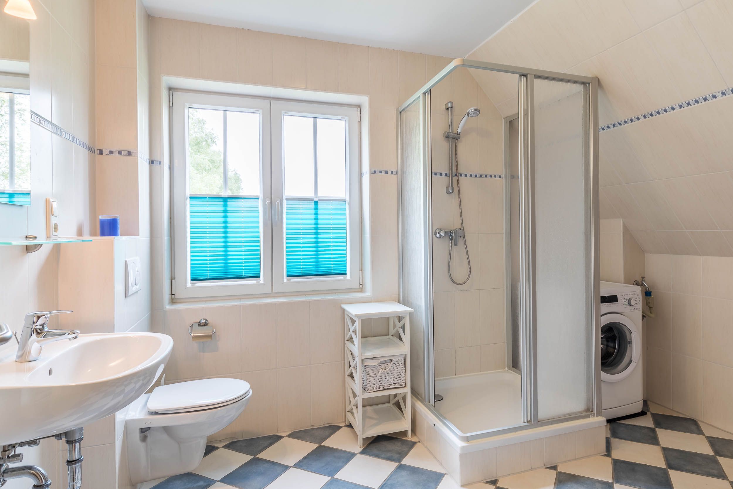 Das helle Bad mit Dusche, WC sowie einem Föhn und einem Handtuchtrockner wird allen Anforderungen an einen modernen Sanitärbereich gerecht. Das Badfenster sorgt für Tageslicht. Hier befindet sich auch eine Waschmaschine, die kostenfrei genutzt werden kann.