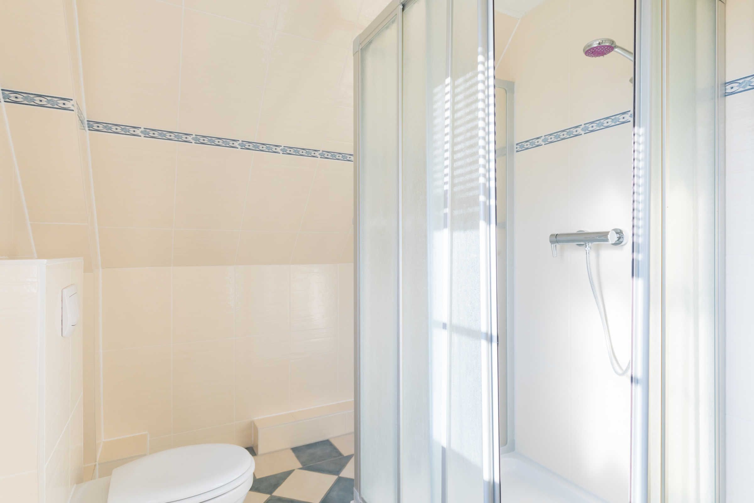 Ebenso finden Sie auf dieser Wohnebene das hell geflieste Badezimmer mit Tageslicht. Es ist mit Dusche und WC eingerichtet.
