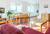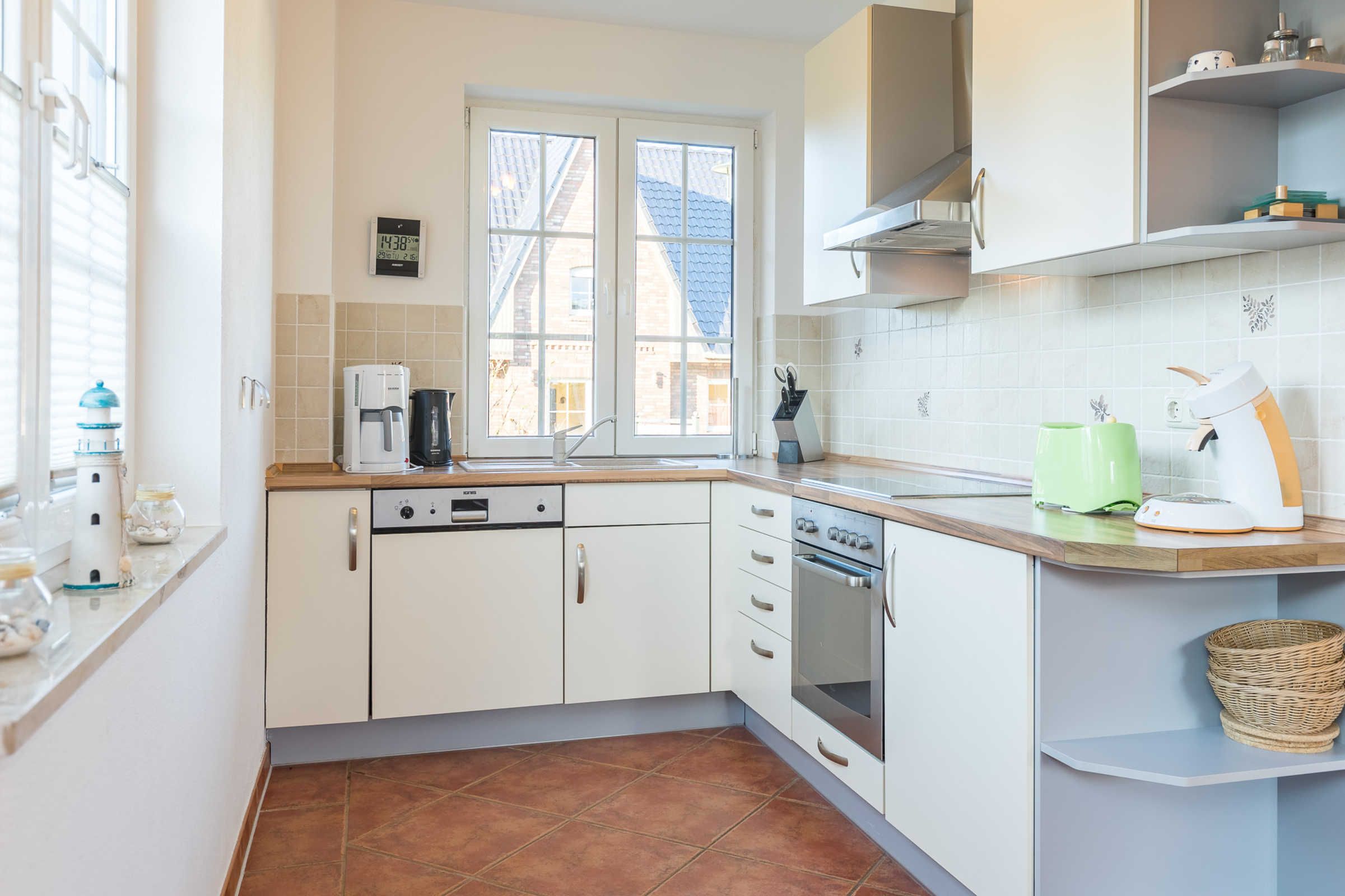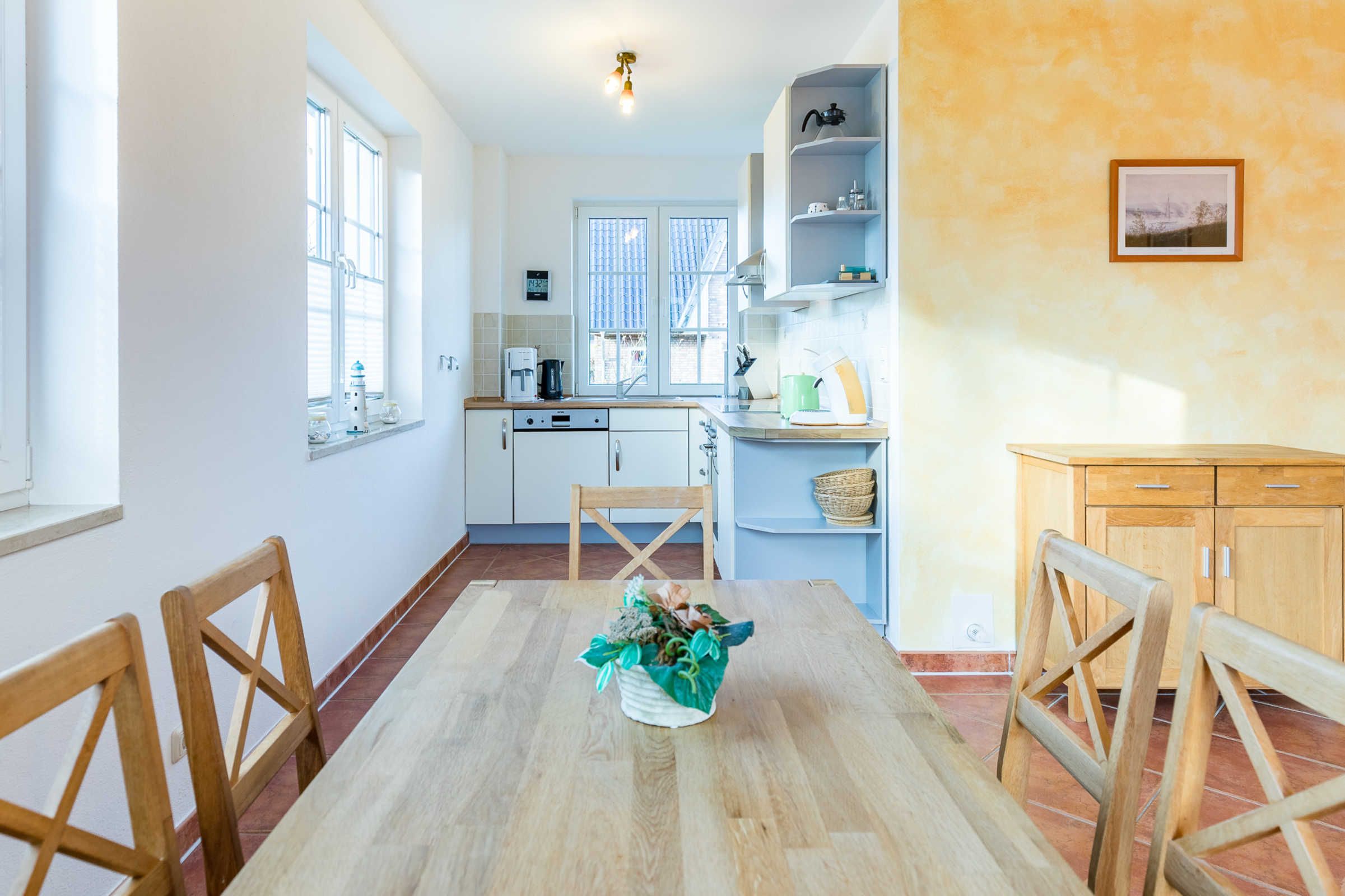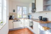 Die offene Wohnküche ist komplett und zeitgemäß ausgestattet und sorgt für eine problemlose Selbstversorgungsmöglichkeit. So finden Sie hier neben einem Wasserkocher, einer Kaffeemaschine, Herd und Kühlschrank z.B. auch eine Spülmaschine.