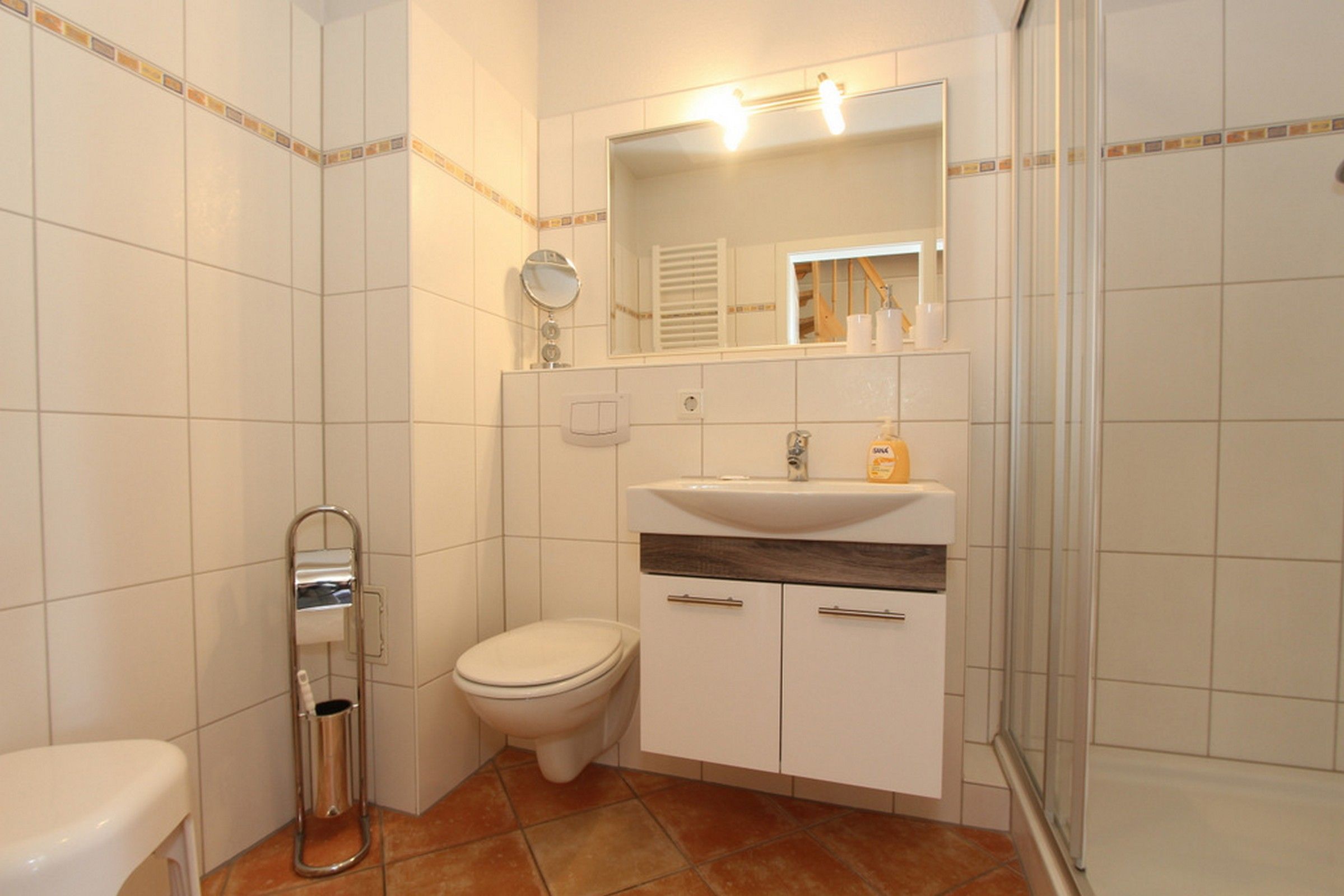 Im Badezimmer finden Sie neben Dusche und WC auch einen Handtuchtrockner und eine Waschmaschine.