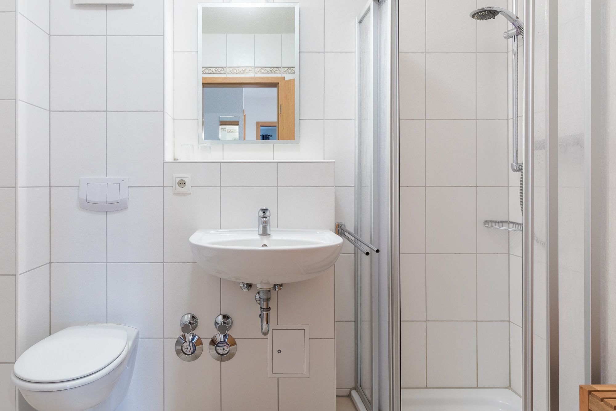 Das innenliegende Badezimmer verfügt über eine Dusche mit flachem Einstieg, WC, Handtuchtrockner und Fußbodenheizung.