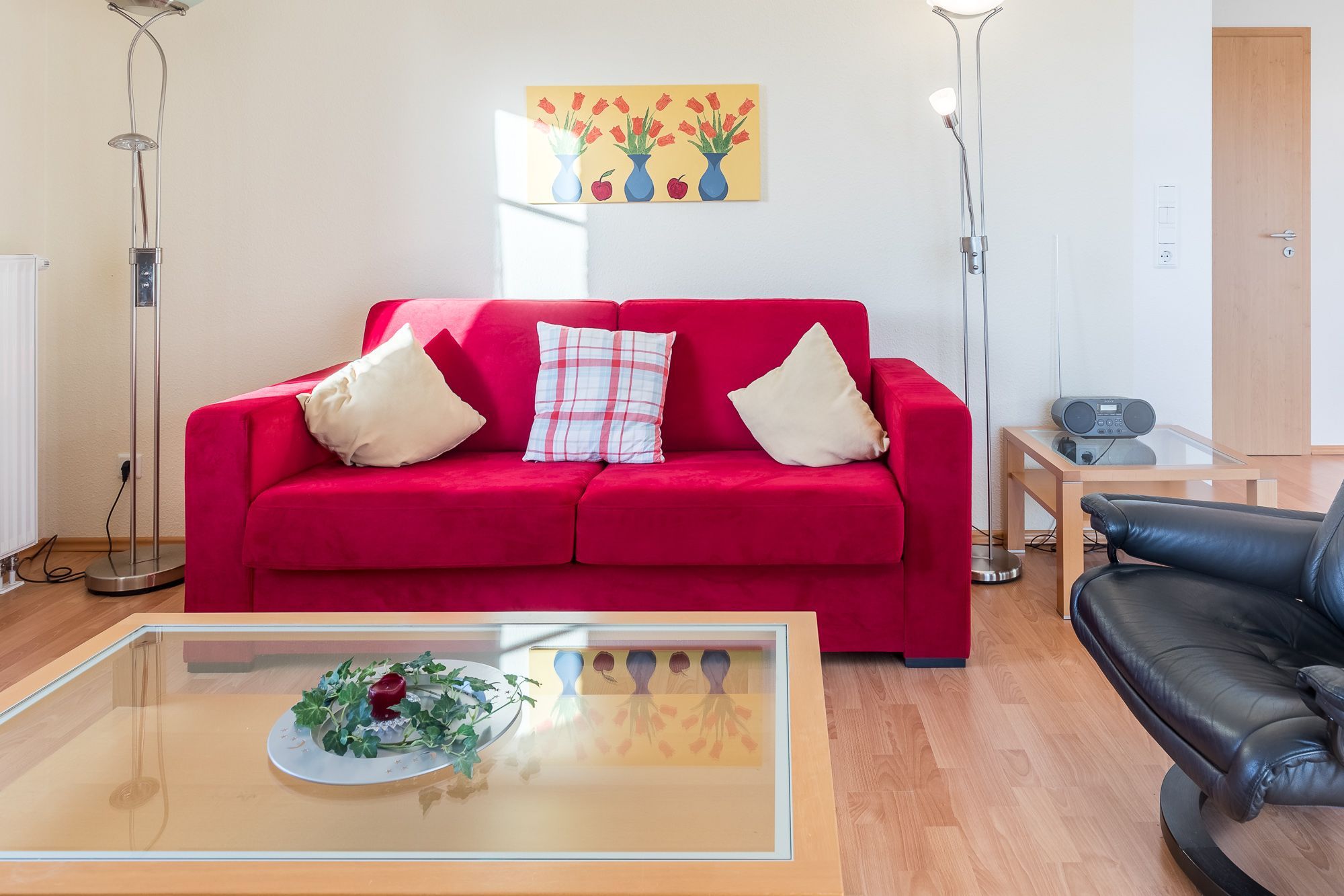 Im Wohnbereich mit Sat-TV (Flatscreen), DVD-Player (Blue-Ray) und CD-Player können Sie es sich gemütlich machen und herrlich entspannen. Die im Wohnzimmer stehende Couch ist ausziehbar (150cm x 200cm)und bietet Platz für 2 Personen an.