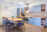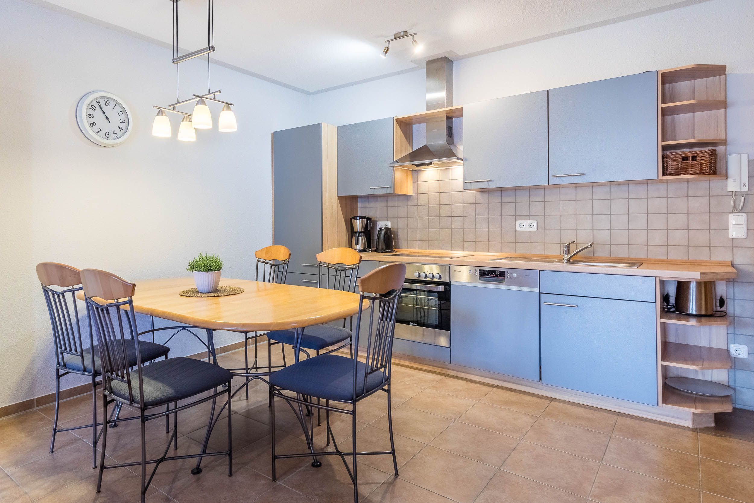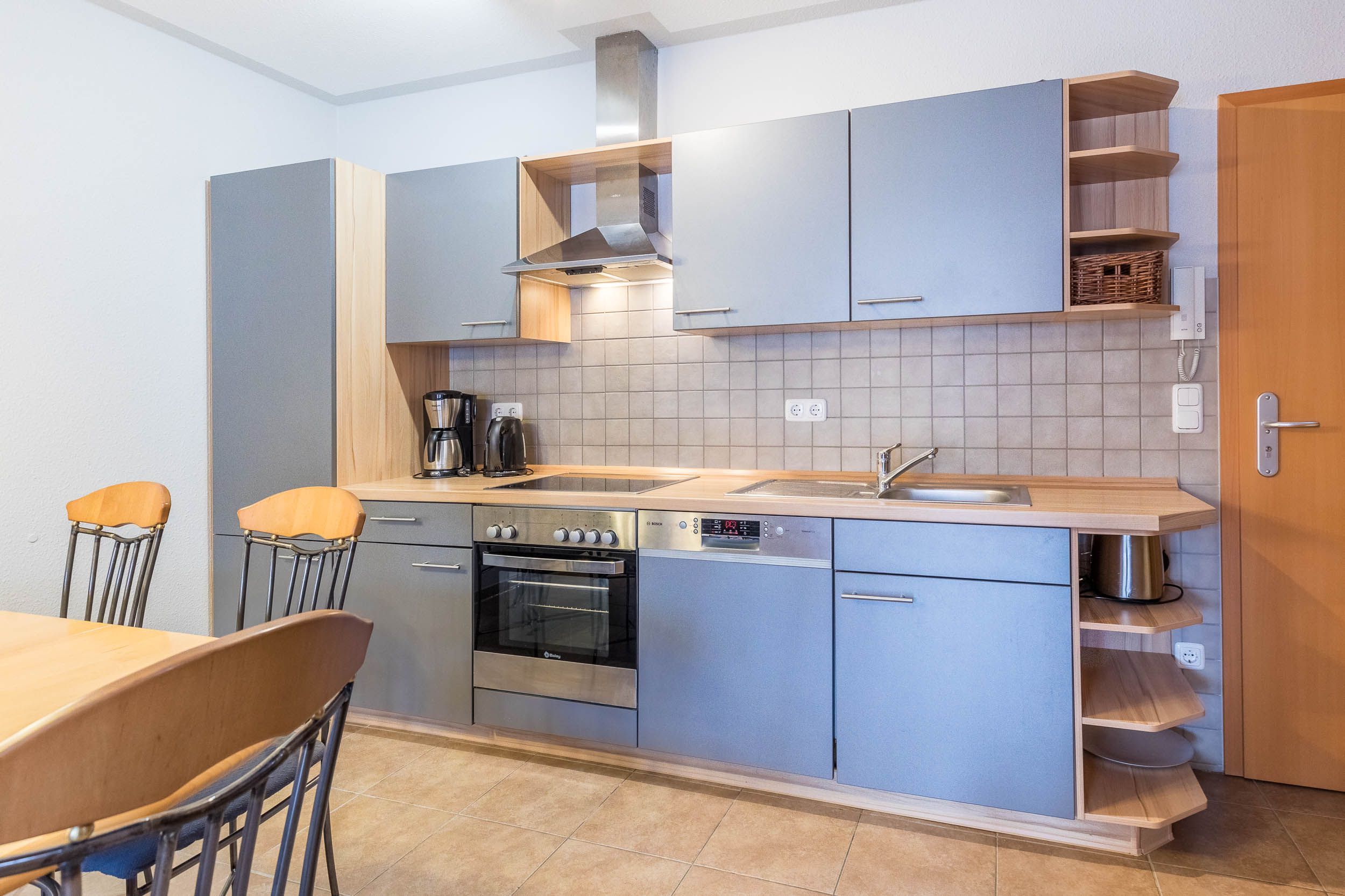 Die hier integrierte Küchenzeile bietet optimale technische Einrichtungen wie eine Spülmaschine, einen Kühlschrank mit Gefrierfach, eine Kaffeemaschine, einen Herd bzw. Backofen und einen Toaster.
