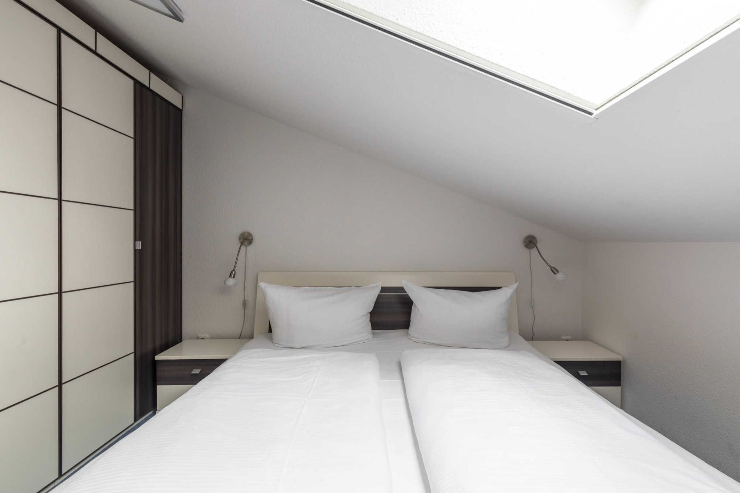 Ebenso befindet sich auf dieser Etage das geschlossene Schlafzimmer mit einem Doppelbett mit verstellbaren Lattenrosten.
