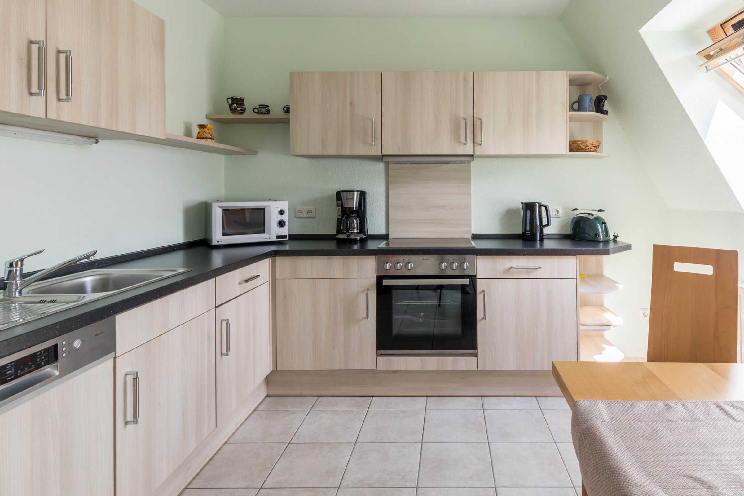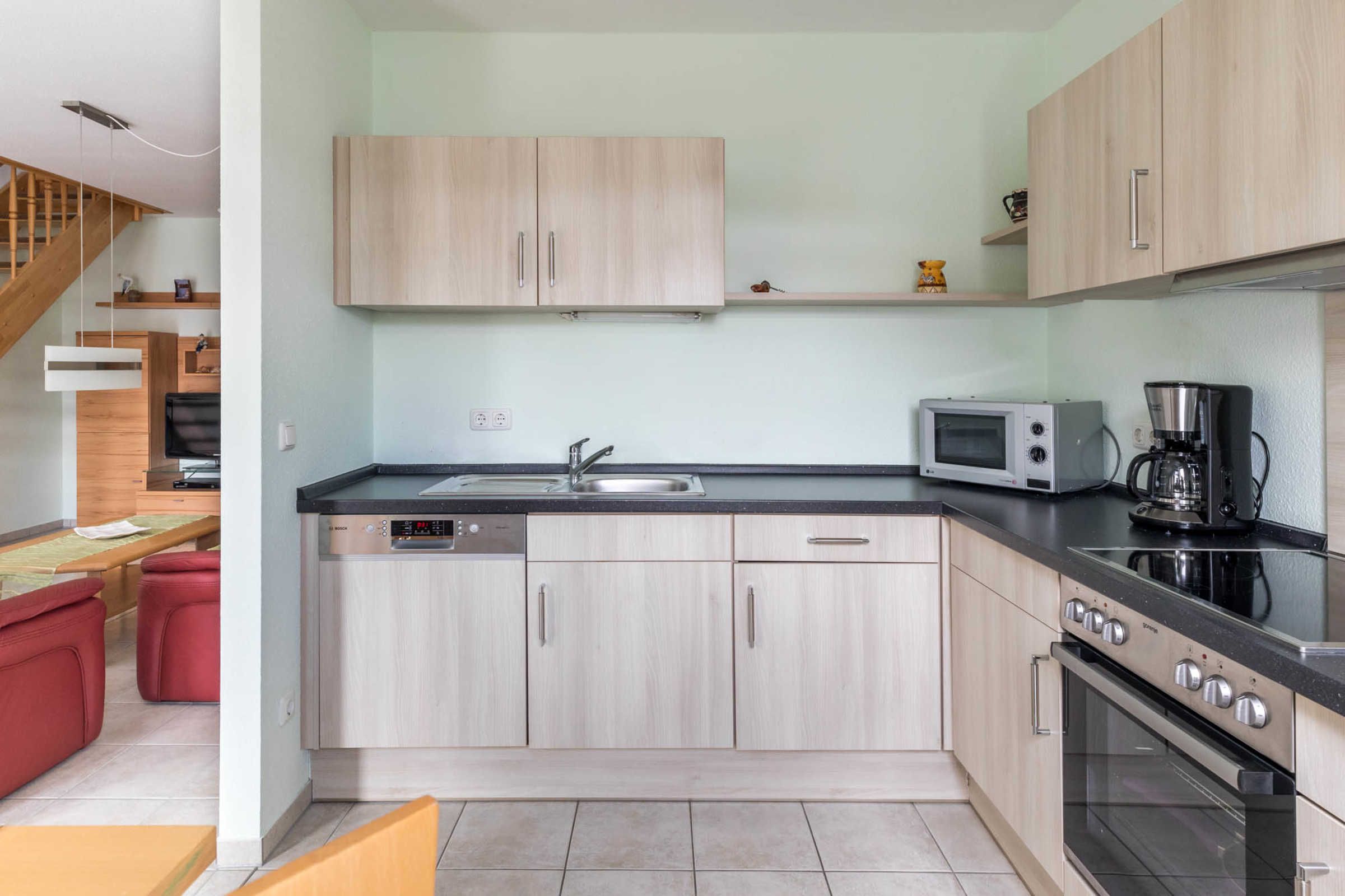 Darüber hinaus erwartet Sie hier eine voll ausgestattete Küchenzeile wie z.B. Geschirrspüler, Mikrowelle, Backofen und Herd.