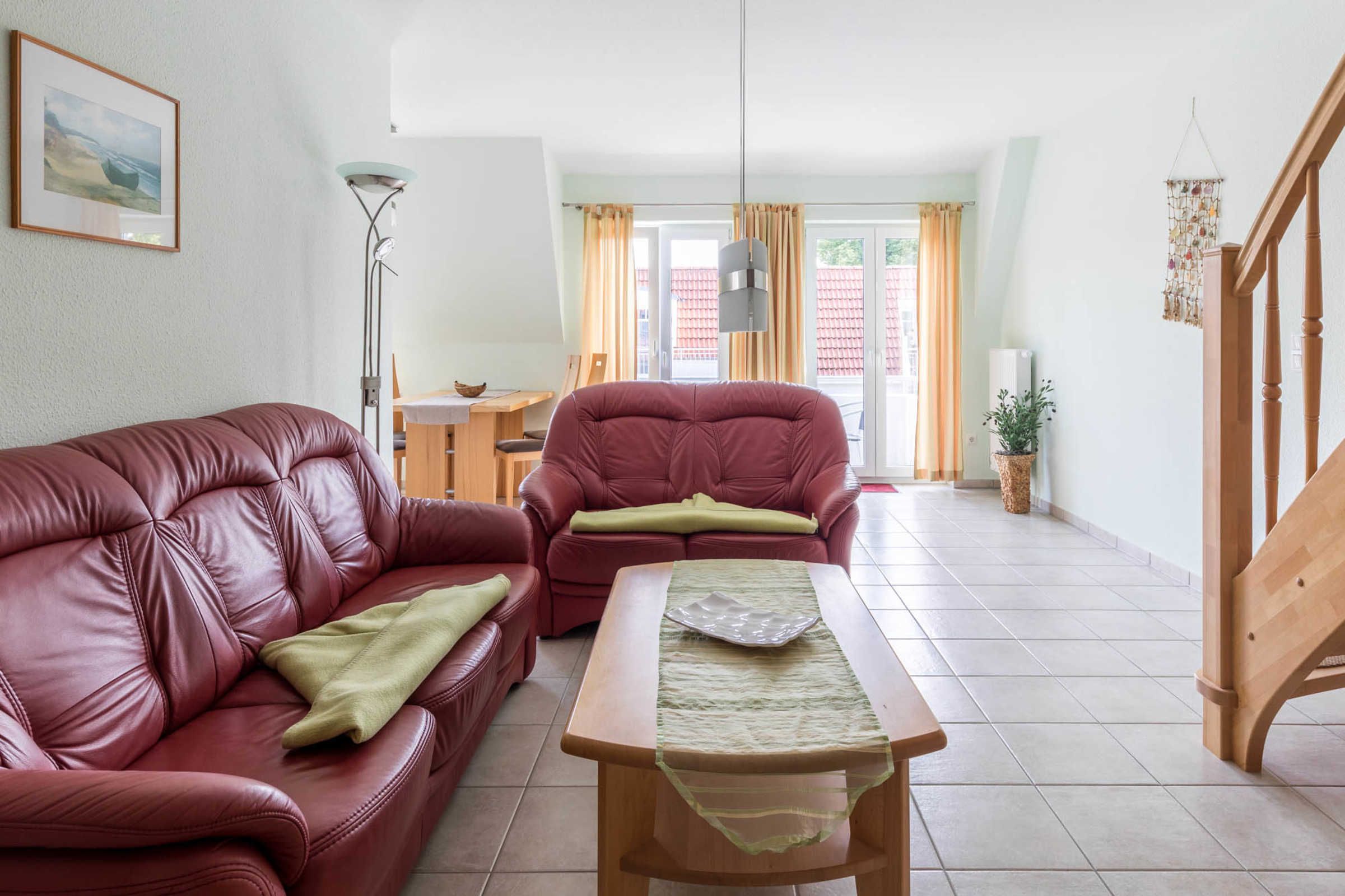 Sie verfügt in der ersten Wohnebene über einen offenen Wohn- und Essbereich mit Essecke und Sofa, Sat-TV und Radio.