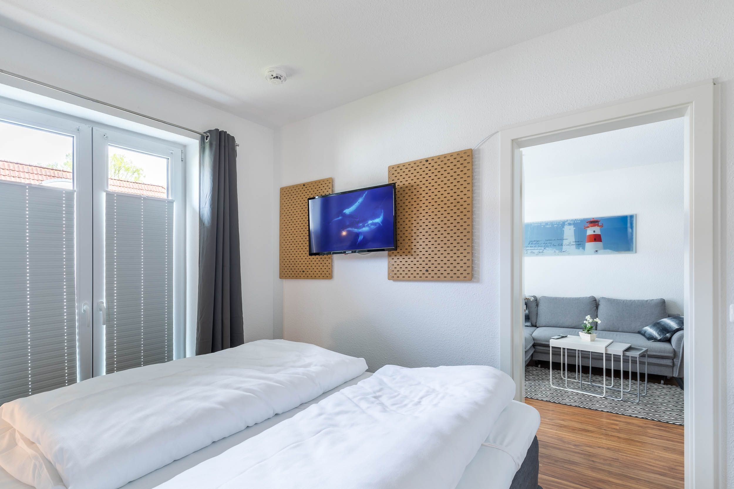 Das Schlafzimmer dieser Ferienwohnung ist mit einem Boxspringbett (160x200m) ausgestattet. Hier gibt es auch einen Kleiderschrank, zwei Nachtschränkchen, einen Radiowecker und einen zweiten Fernseher.