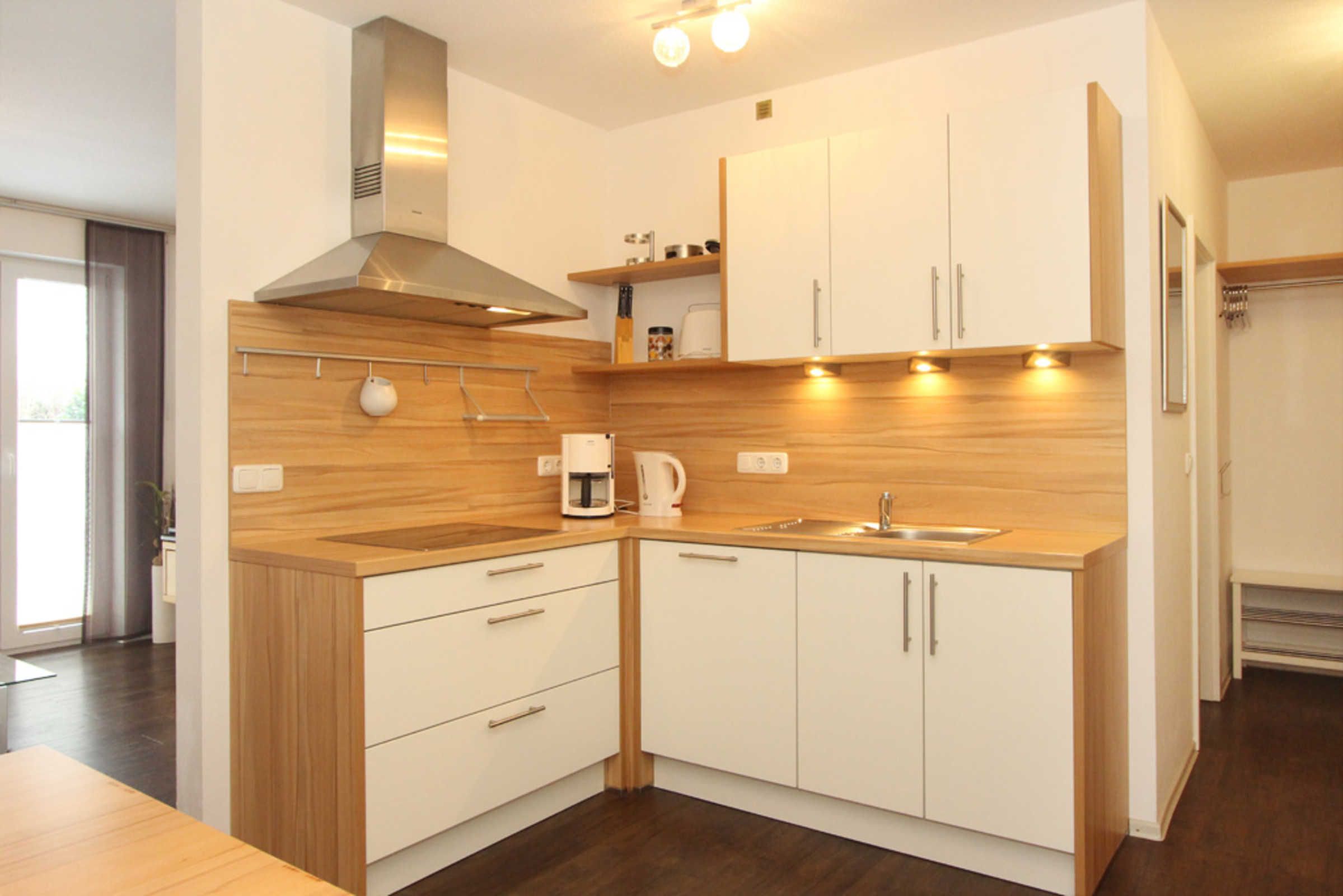 Die moderne Küchenzeile lässt keine Wünsche offen: Backofen, Herd, Kühlschrank mit Gefrierfach, Spülmaschine, Toaster und Mikrowelle machen das Kochen zum Vergnügen.