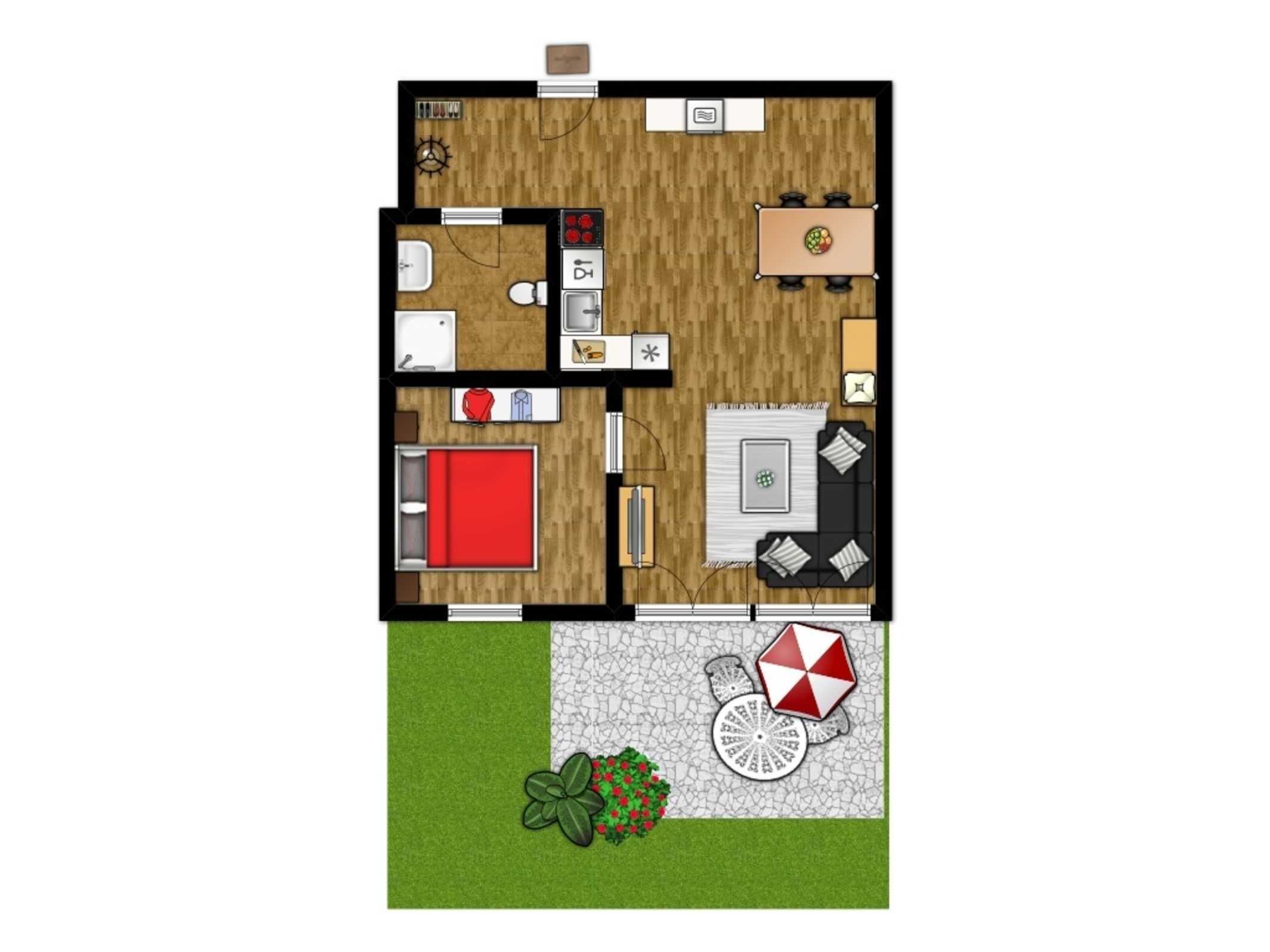 Die einladende Terrasse, direkt vom Wohnzimmer aus zugänglich, ist mit Tisch, Stühlen und gemütlichen Loungemöbeln ausgestattet. Genießen Sie hier die Sonne, entspannen Sie bei einem Glas Wein oder lassen Sie den Abend mit einem gemütlichen Grillabend ausklingen.