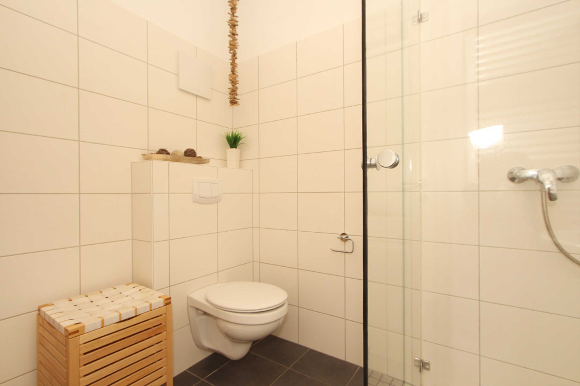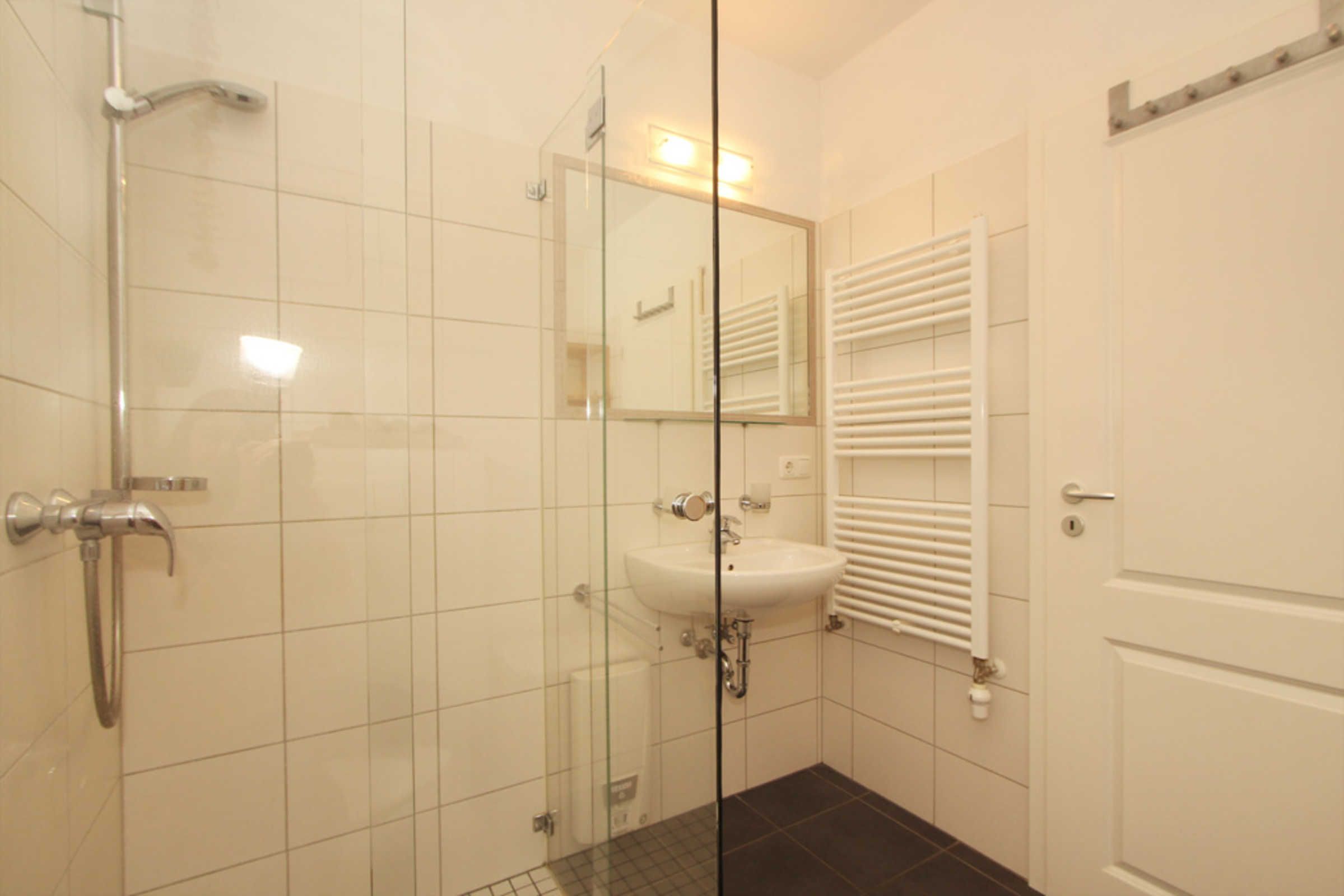 Das moderne Bad ist mit einer ebenerdigen Dusche, WC, Föhn und Radio ausgestattet. Die Fußbodenheizung und der Handtuchtrockner sorgen für wohlige Wärme.