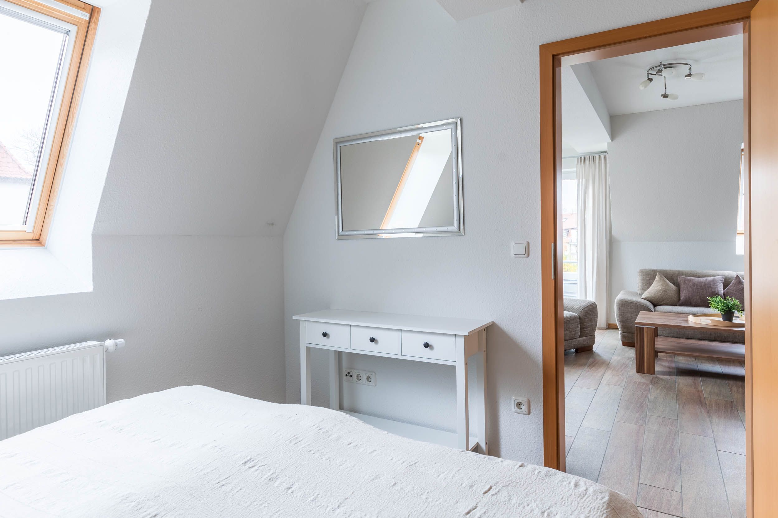 Auch eines der beiden Schlafzimmer ist im unteren Bereich der Wohnung mit einem Doppelbett und großem Kleiderschrank hergerichtet.
