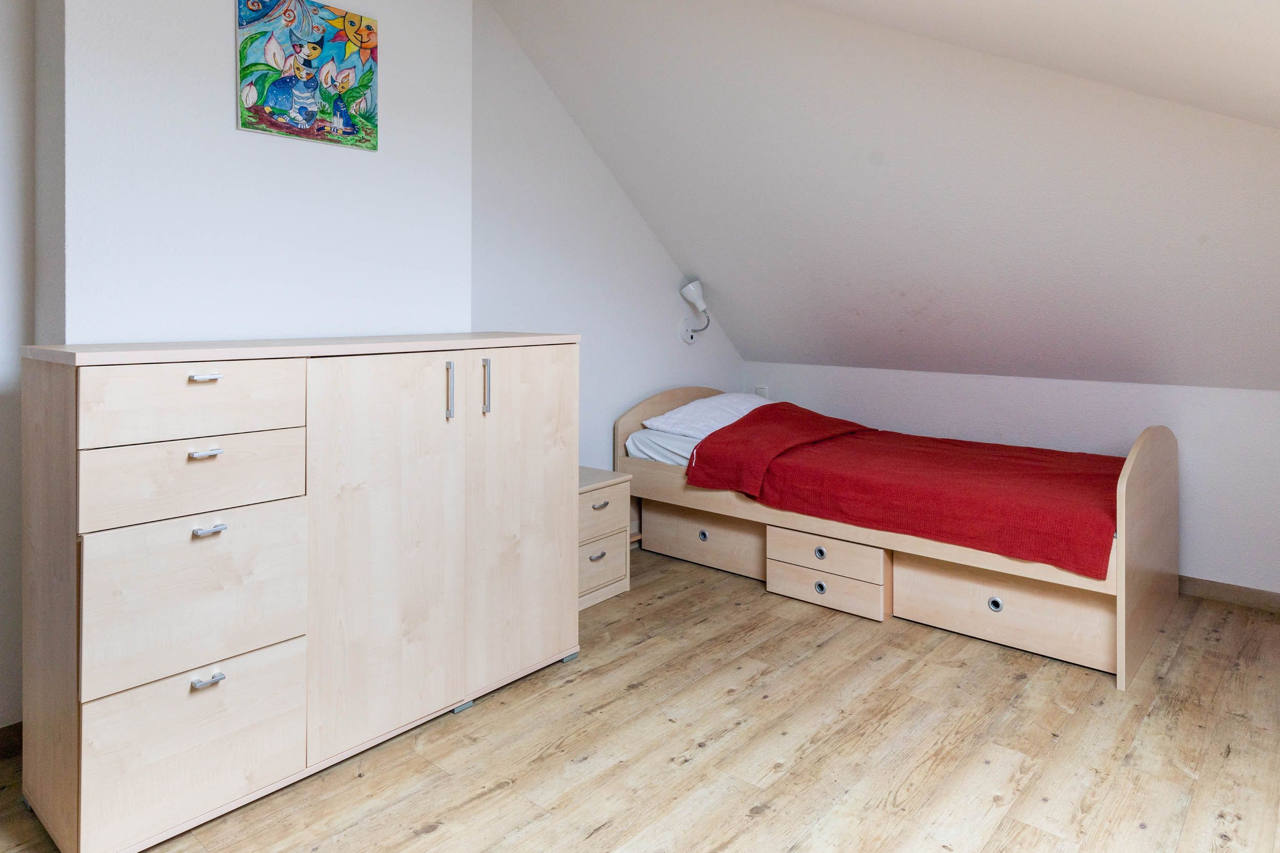 Das zweite Schlafzimmer/ Gästezimmer finden Sie in der 2. Wohnebene, im DG und bietet zwei Einzelbetten, wovon bei einem noch ein zusätzliches Bett ausgezogen werden kann und somit einen 5. Schlafplatz schafft. Weiterhin können hier an dem Schreibtisch z.B. Urlaubspost geschrieben oder tolle Urlaubsbilder gemalt werden.