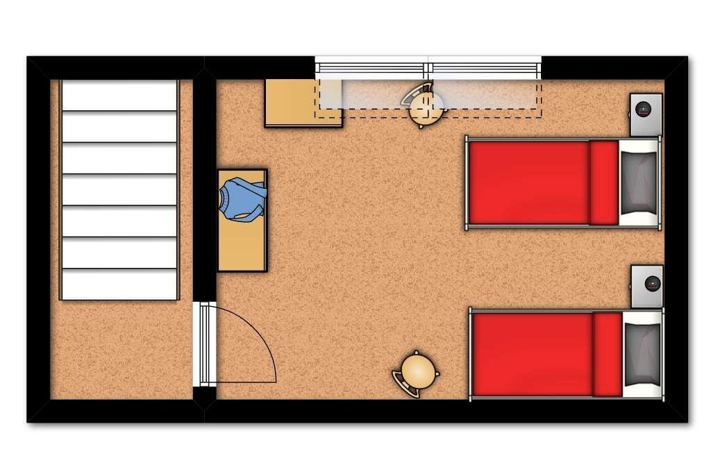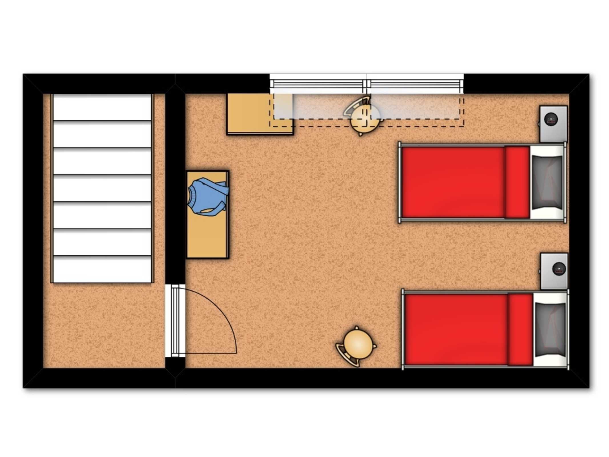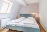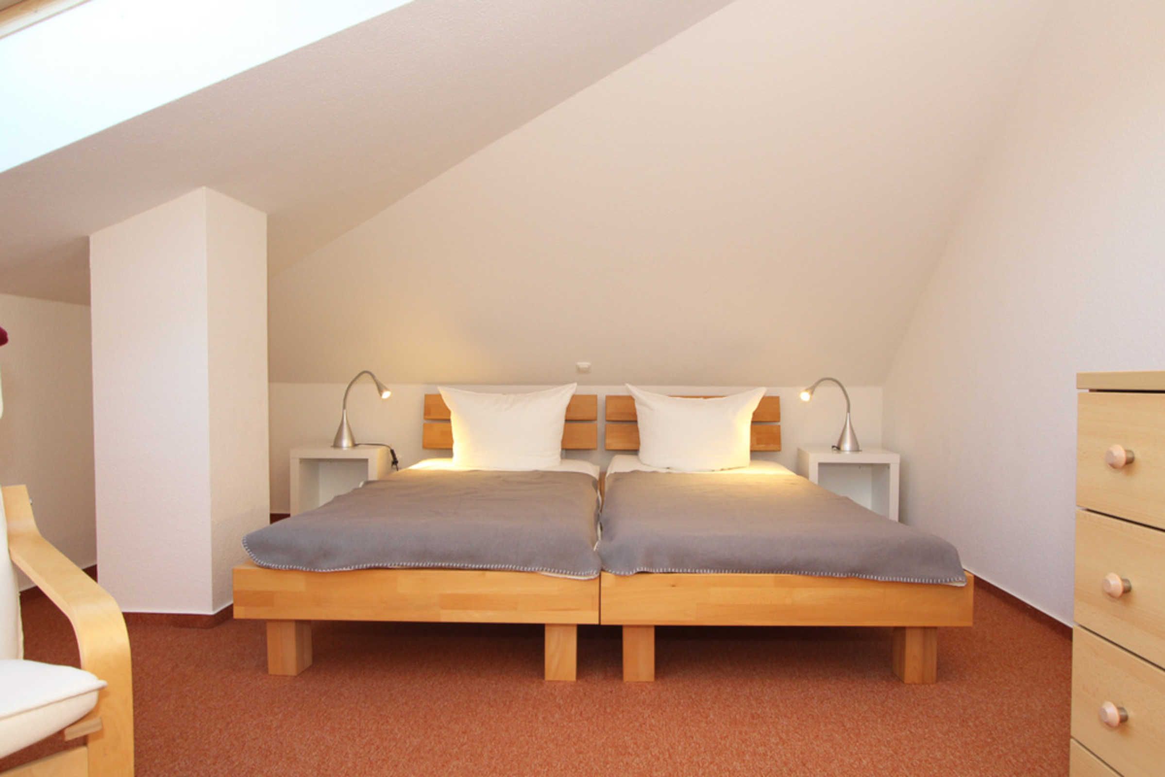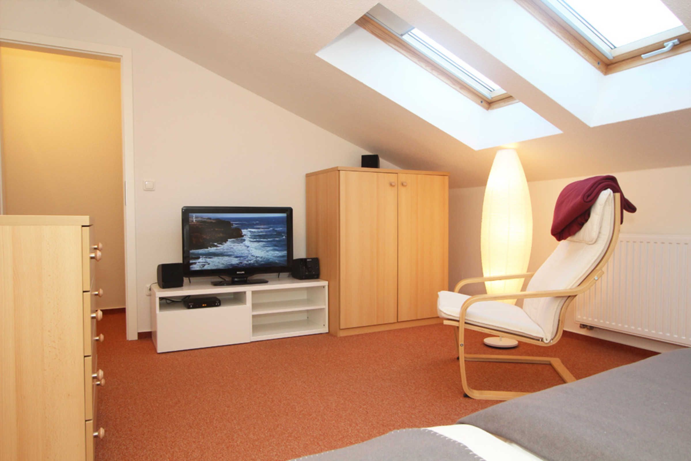Oben befindet sich das zweite Schlafzimmer mit zwei Einzelbetten (je 90x200cm), die auch zusammengestellt werden können. Ein zweiter TV-Flatscreen, ein Lesesessel und eine großen Kommode sowie ein Schreibtisch (Arbeitsplatz) runden das Wohnangebot ab. Ein Reisebettchen kann hier bei Bedarf zusätzlich aufgestellt werden.